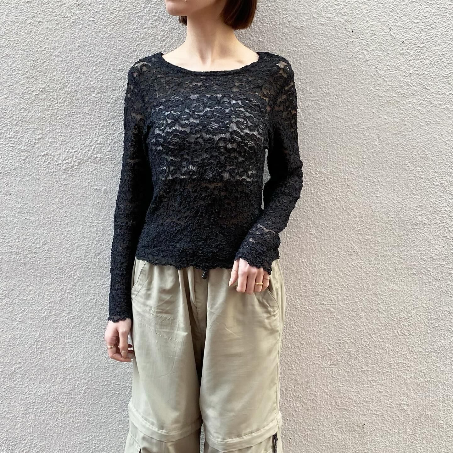 網状の細かいレースディテールが素敵で、1枚で着るのはもちろんジャケットやシャツのインナーとしても春先に活躍しそうなアイテムです。