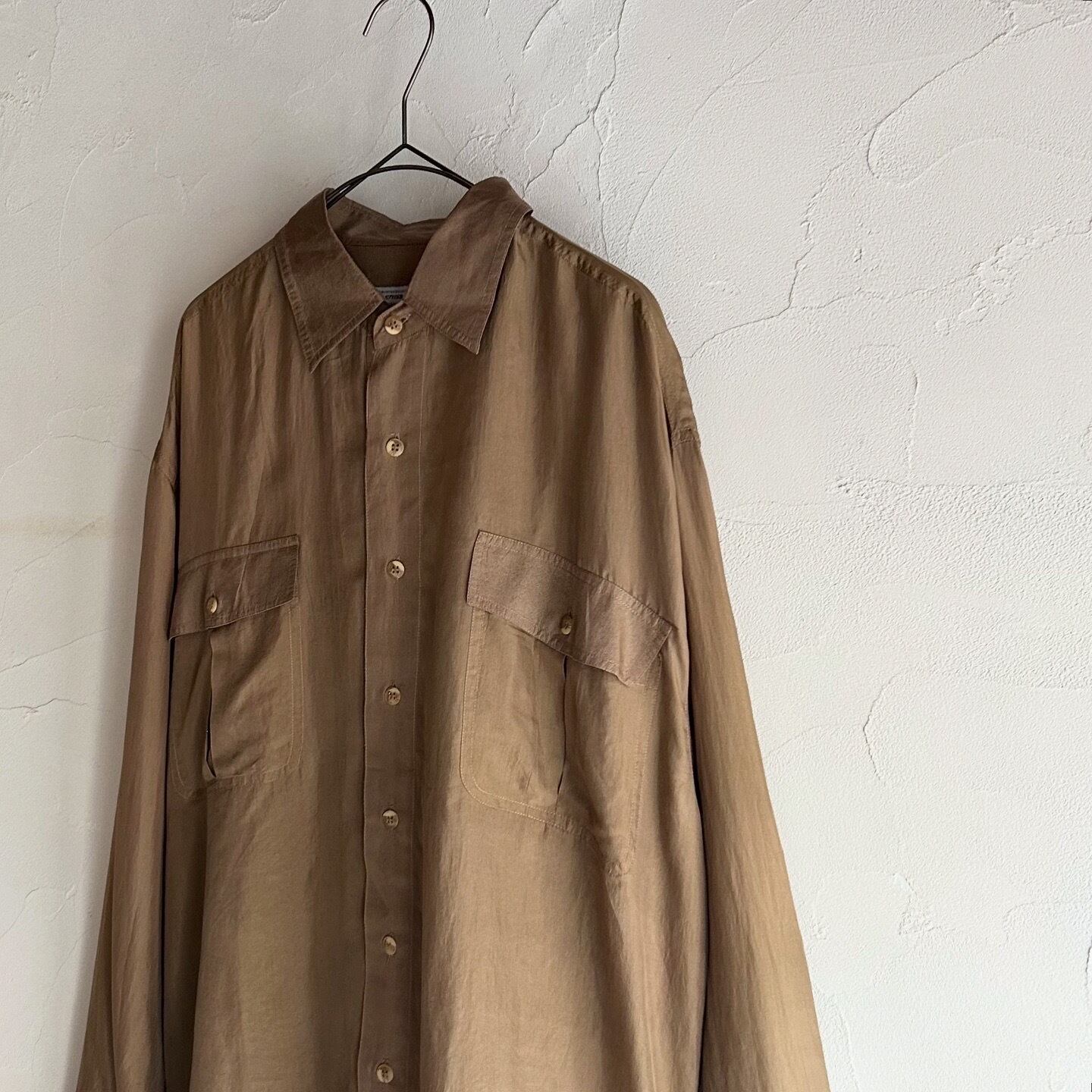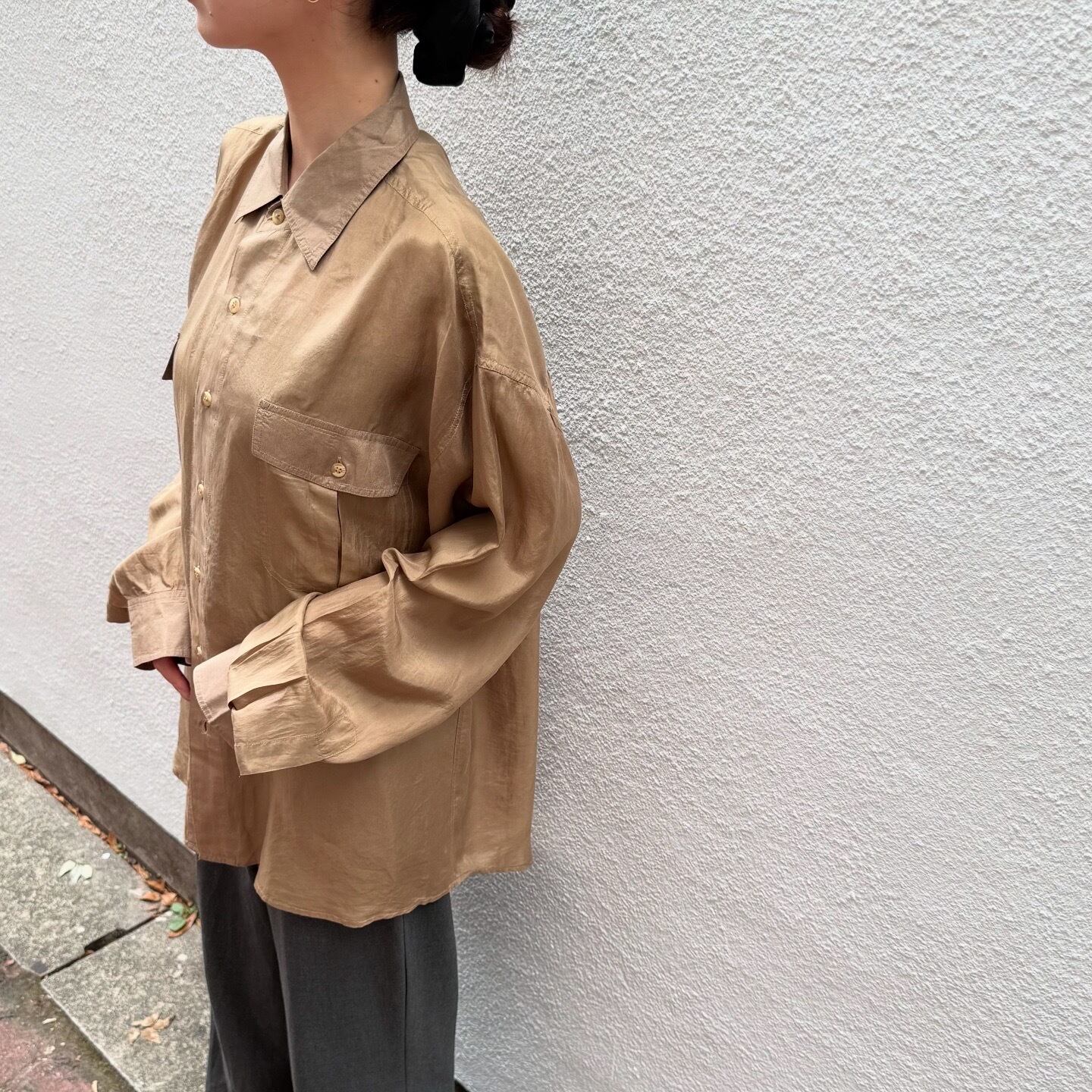 艶感のあるシルク素材が品のあるシャツです。かなり薄手なので夏の羽織としてもお召し頂けます。