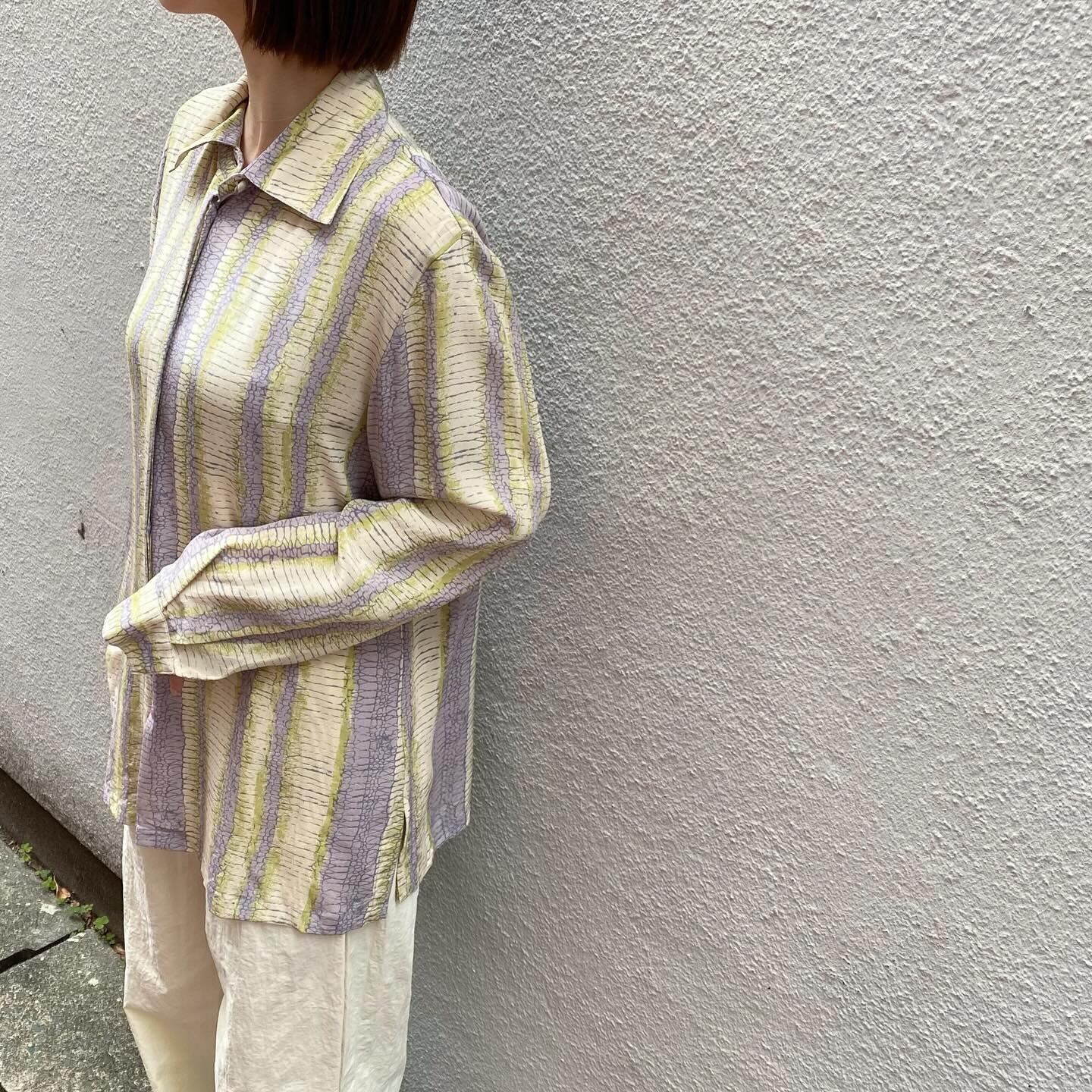 淡いパープル、グリーン、アイボリーのカラーリングが春らしい一着です。