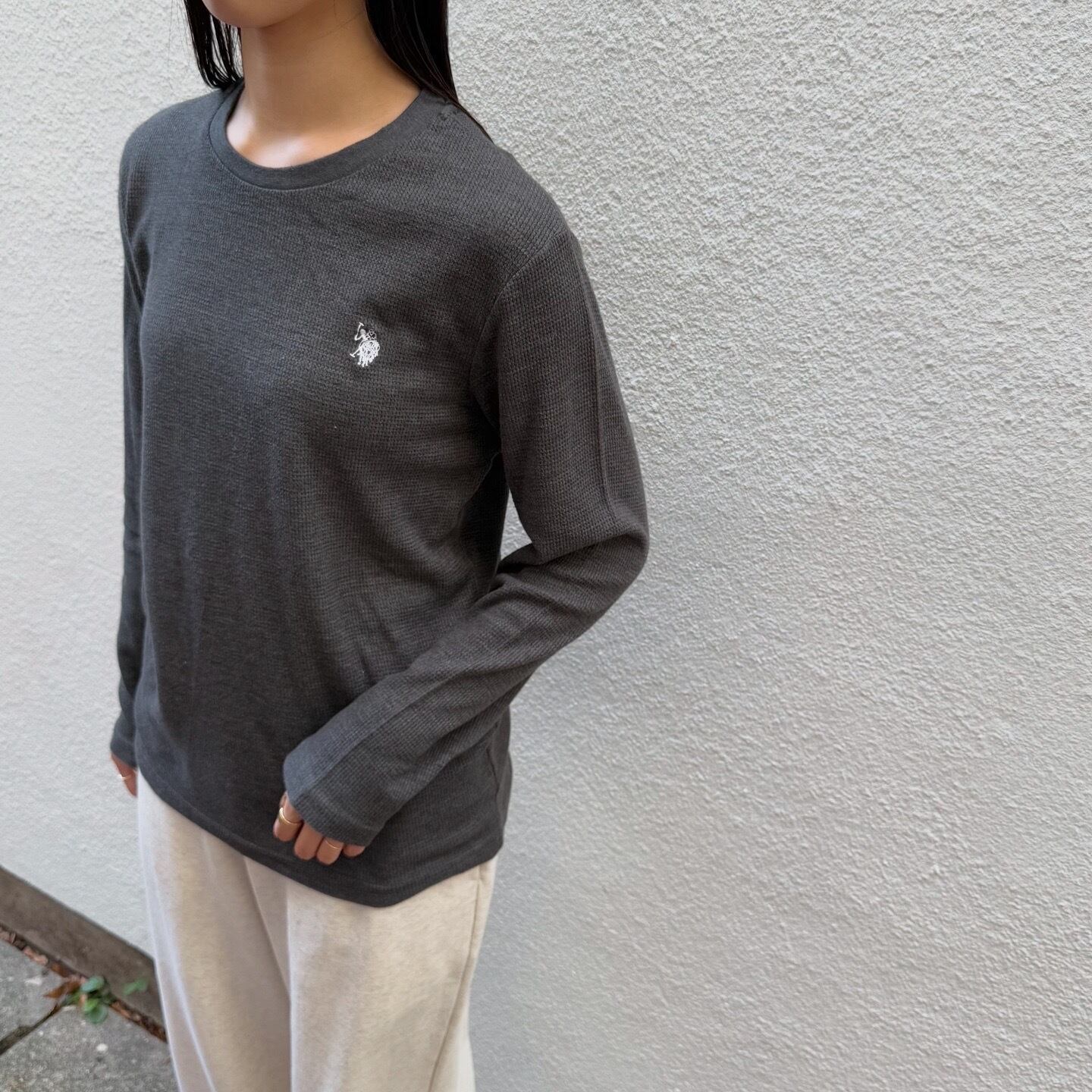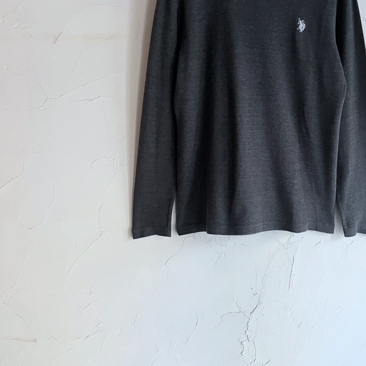 濃いめのグレーが使い勝手の良いPOLOのサーマルトップスです。1枚で着るのはもちろん、インナーとしても使い勝手の良いサイズ感です。