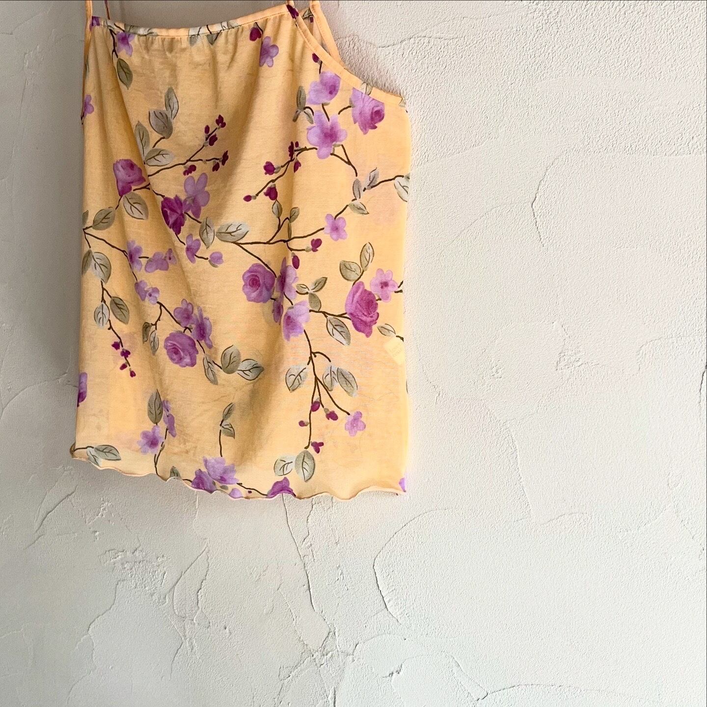 オレンジにパープルのお花の配色が素敵なキャミソールです。シアーの透け感が夏らしい一着です。