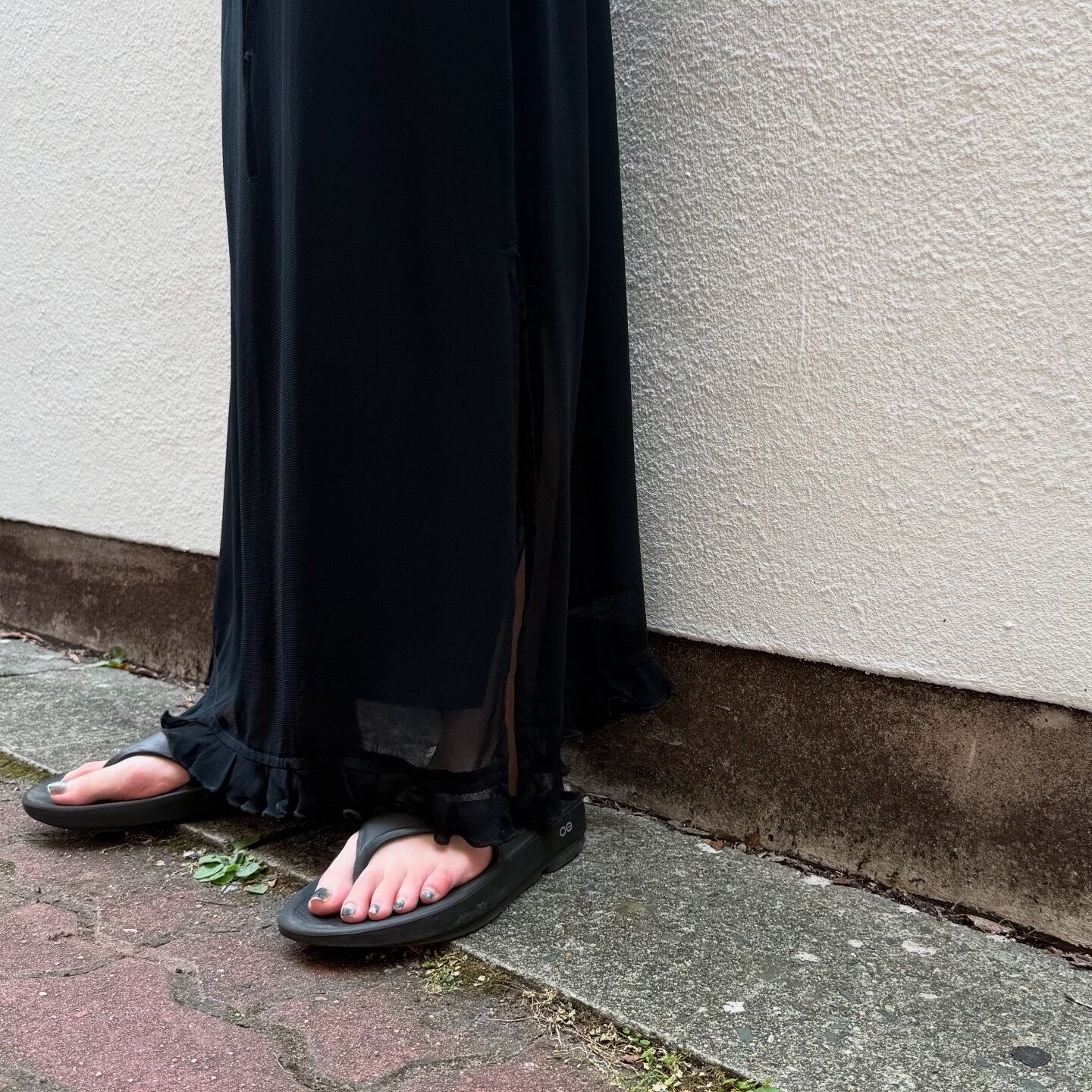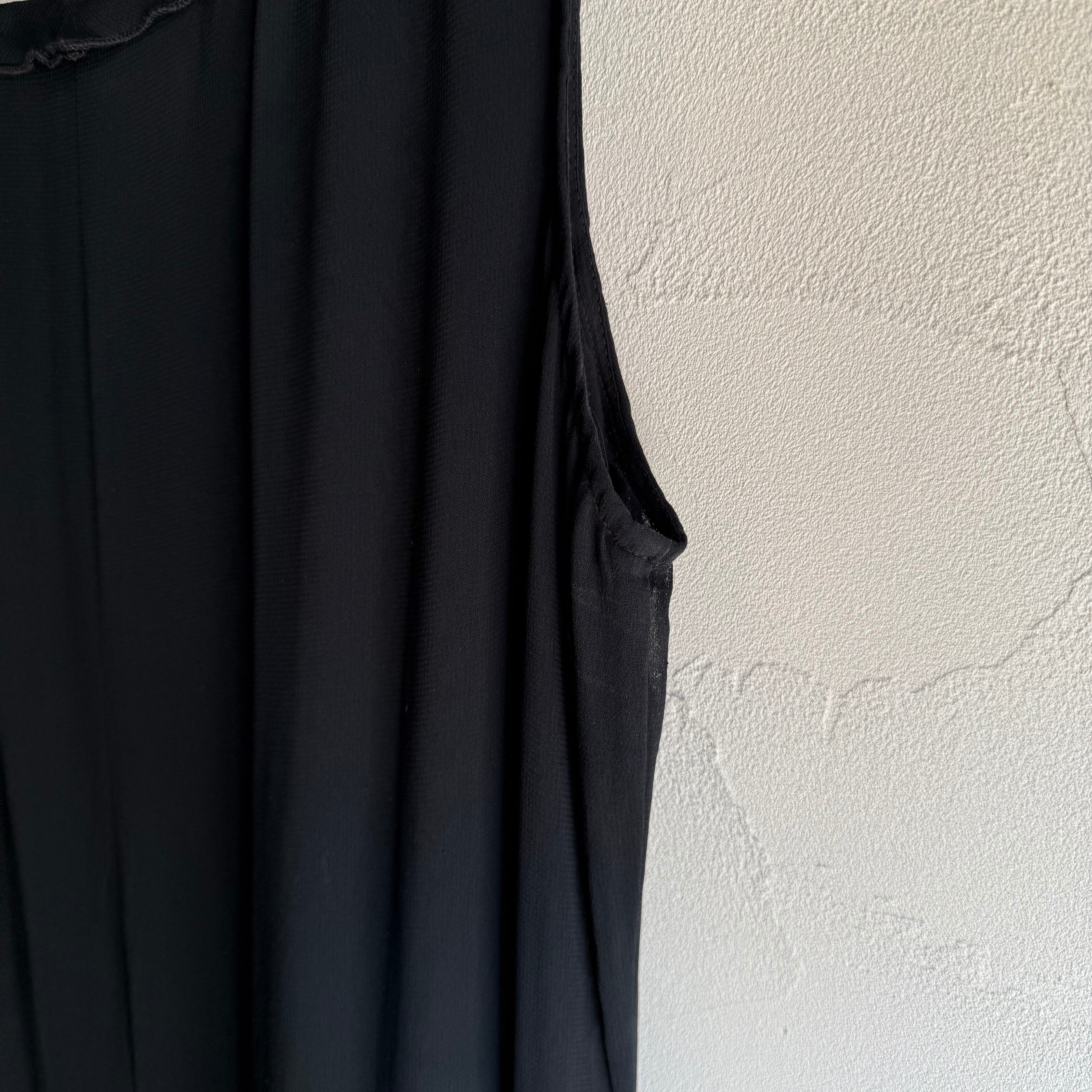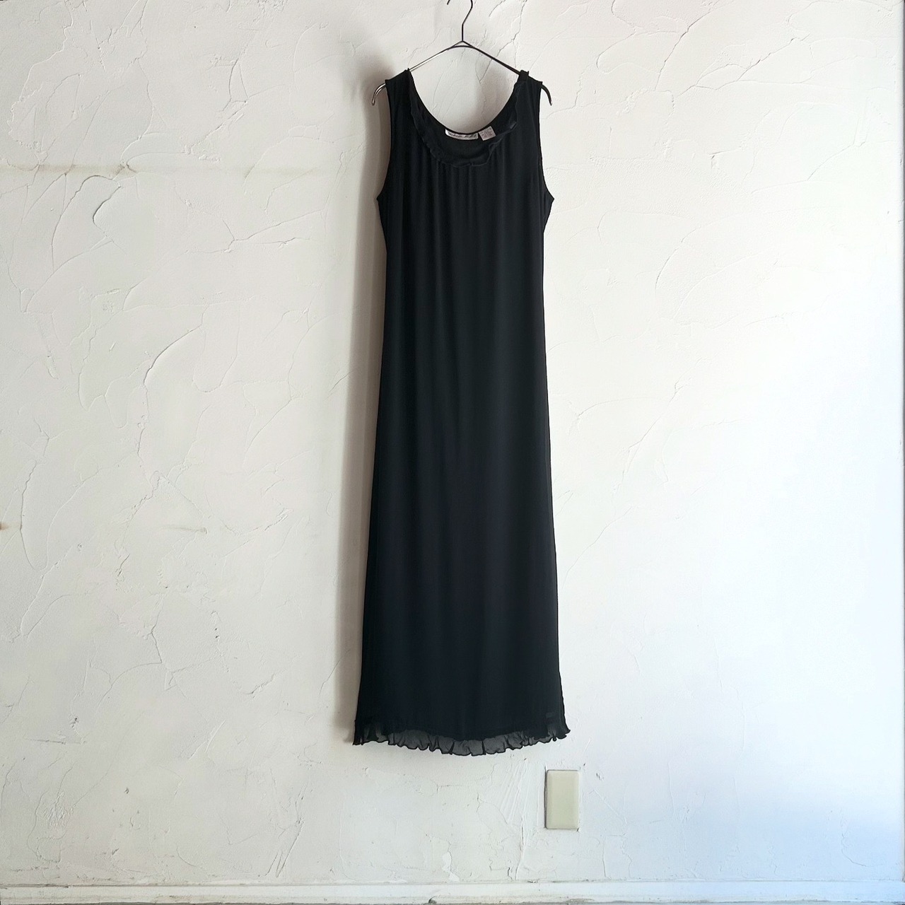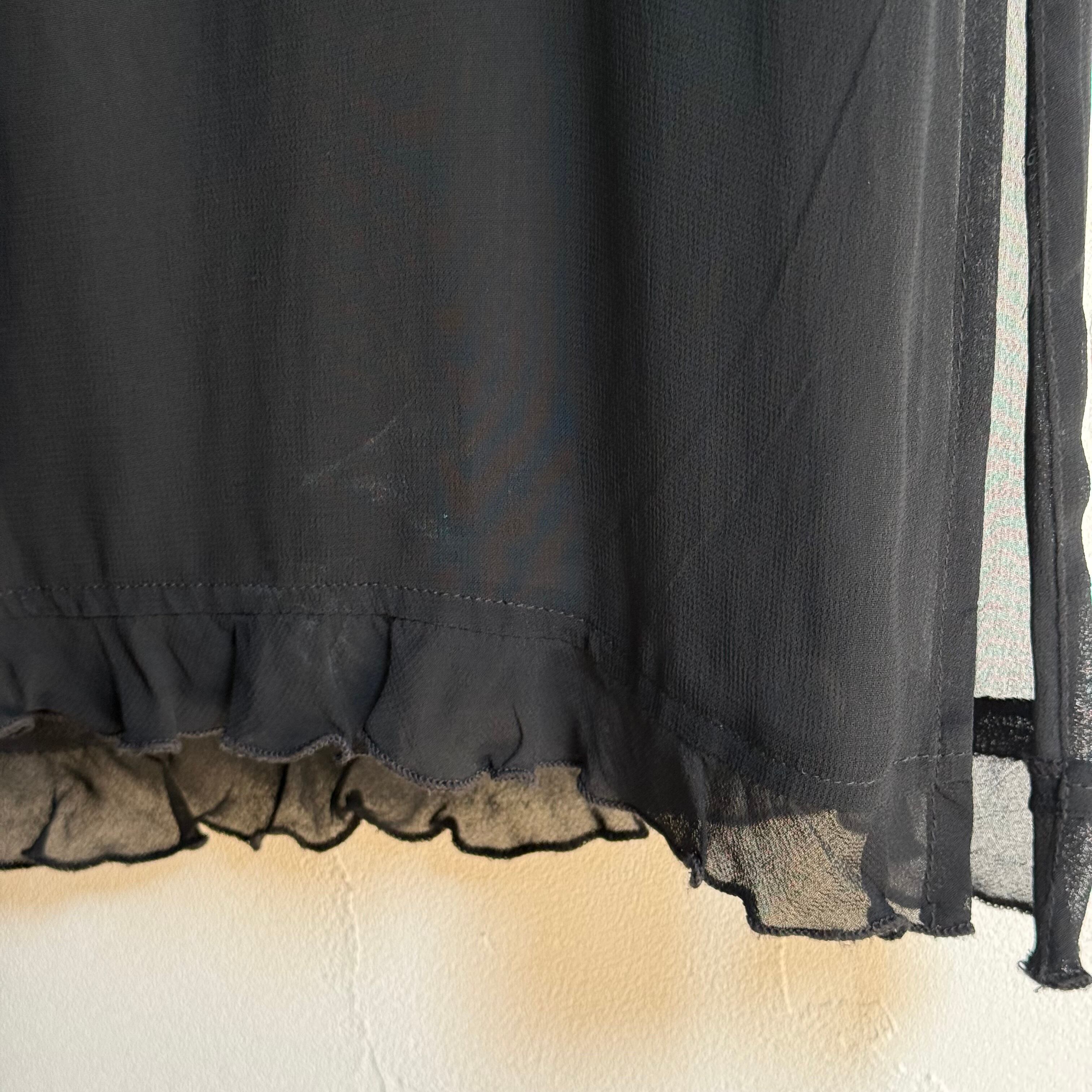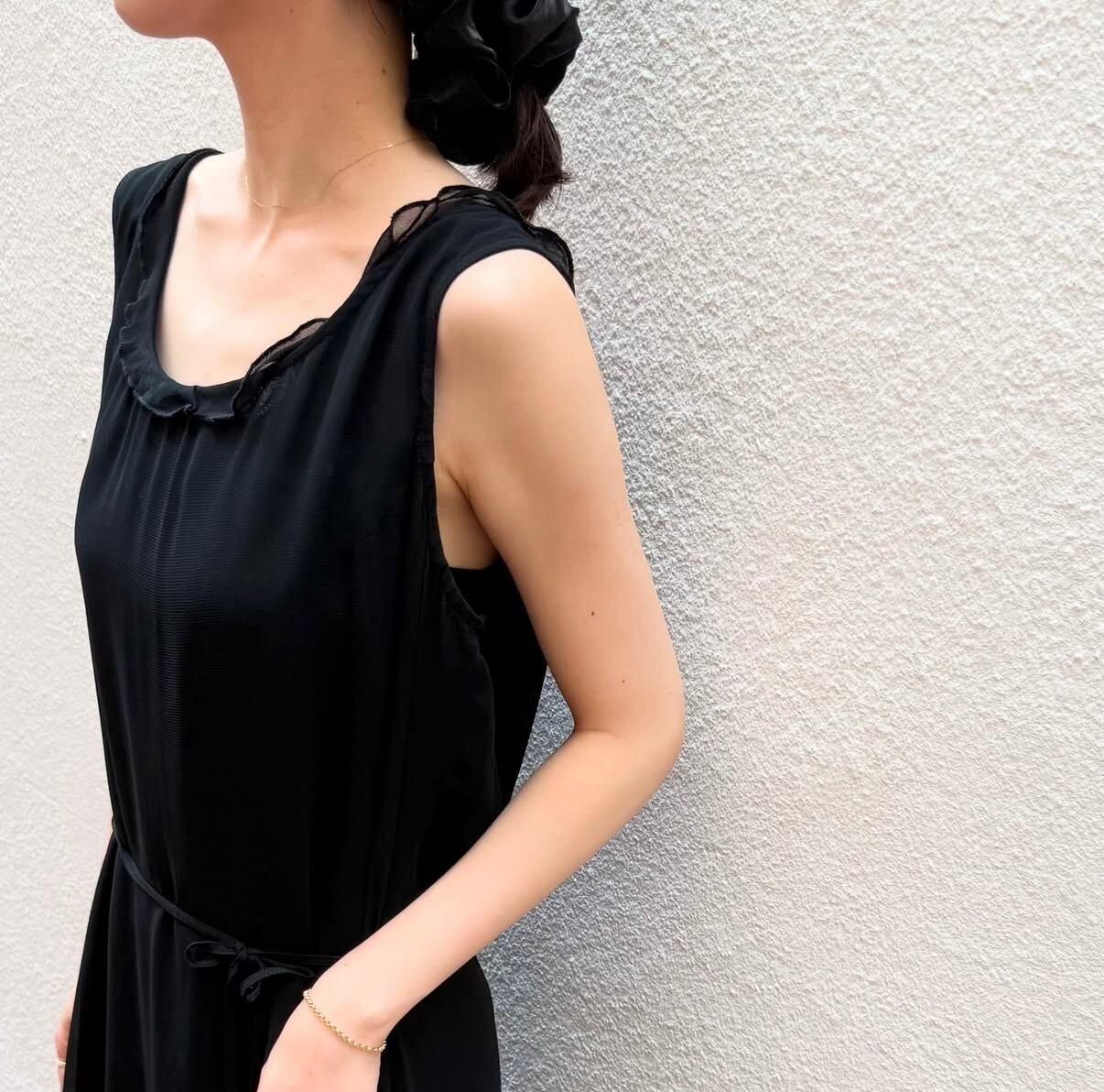 襟と裾にフリルの施されたシアーのワンピースです。