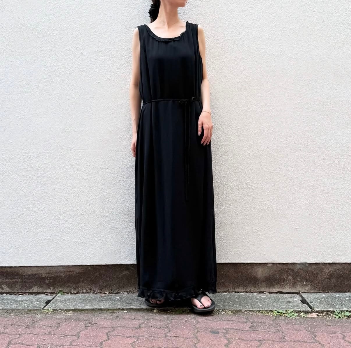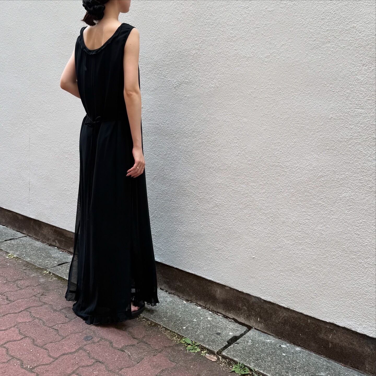 腰のリボンを結ぶことができ、シルエットの美しい一枚です。