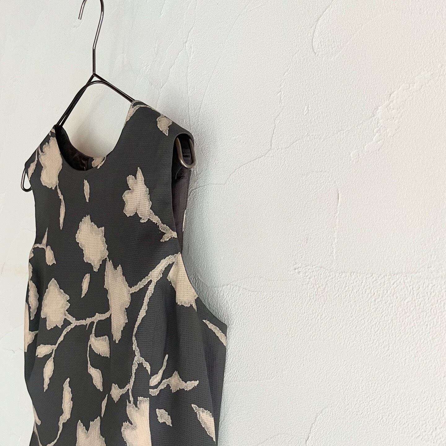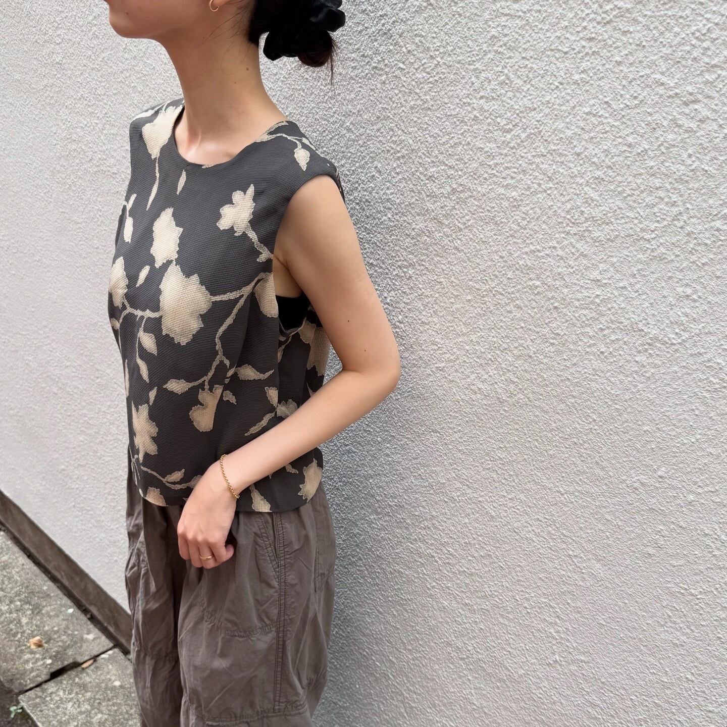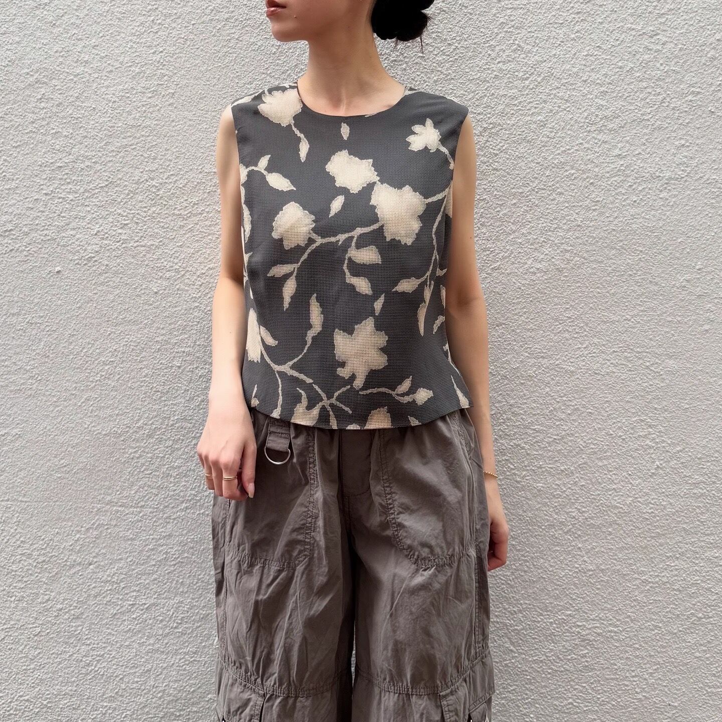 まろやかなグレーにベージュのお花が素敵なトップスです。