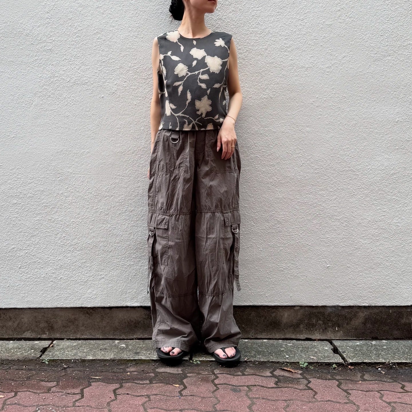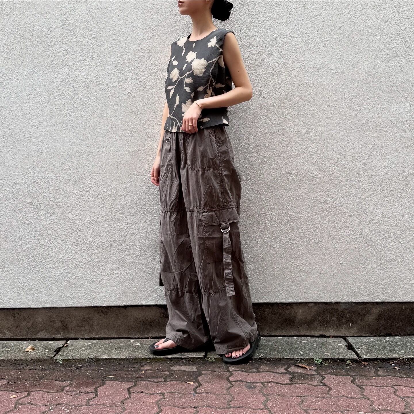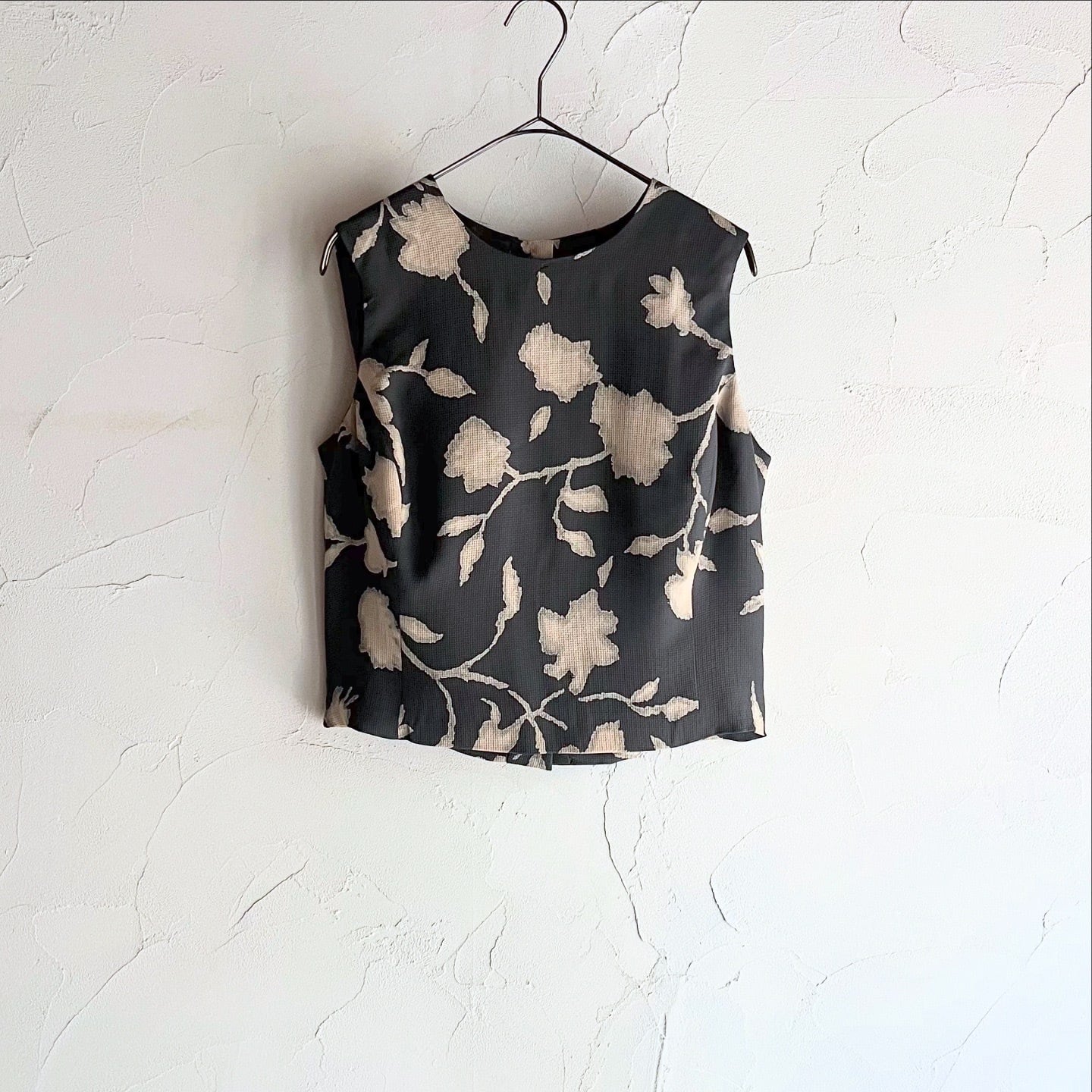 まろやかなグレーにベージュのお花が素敵なトップスです。