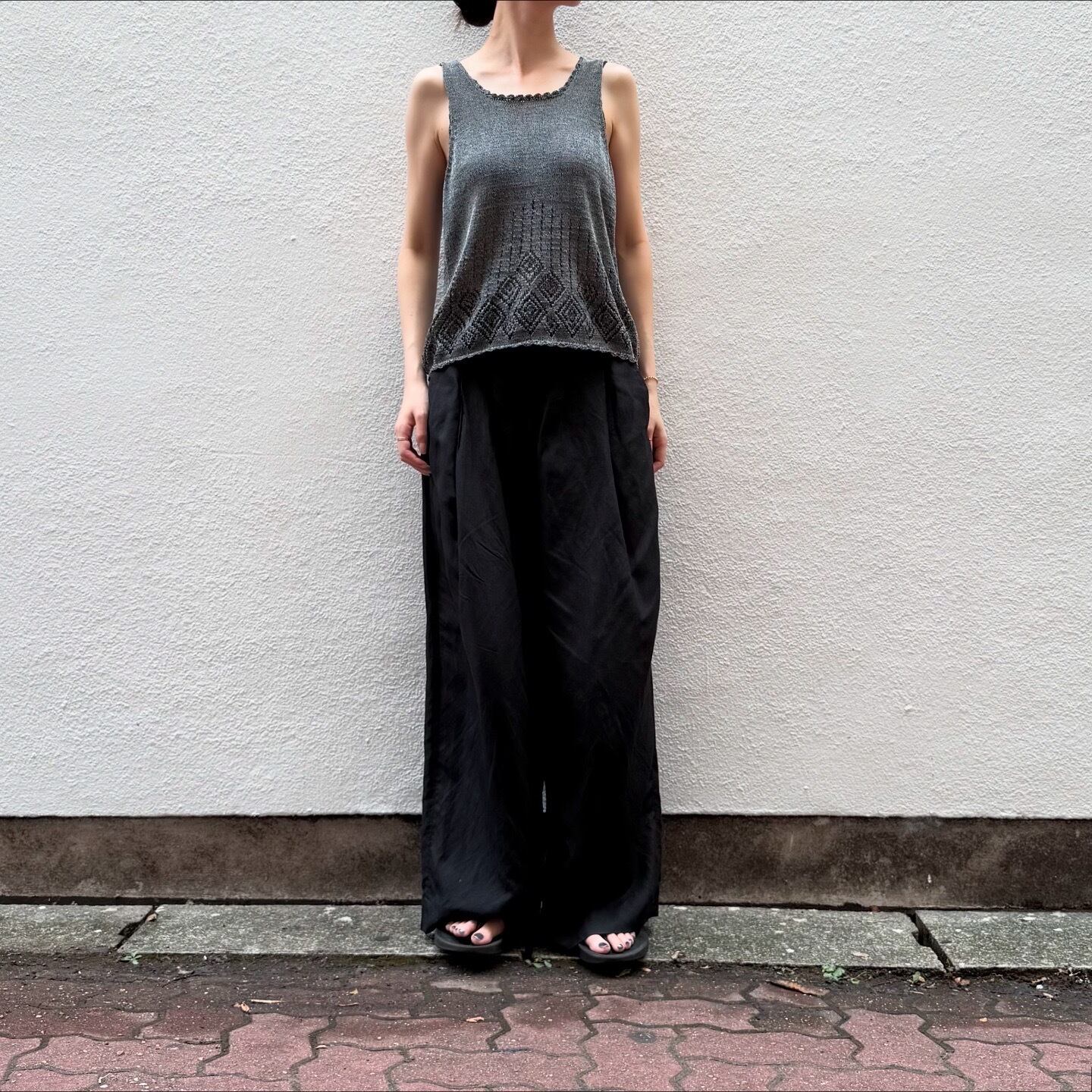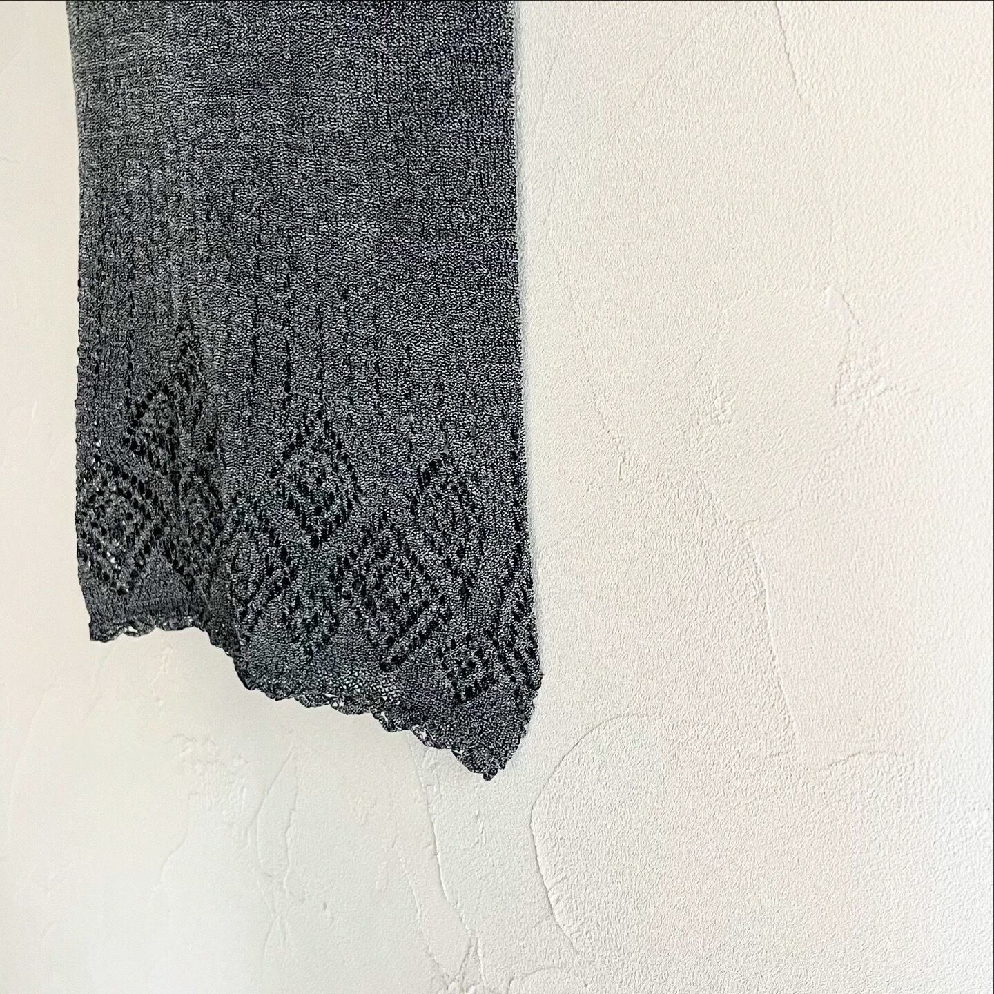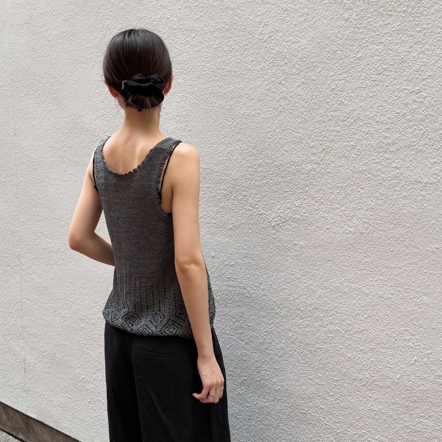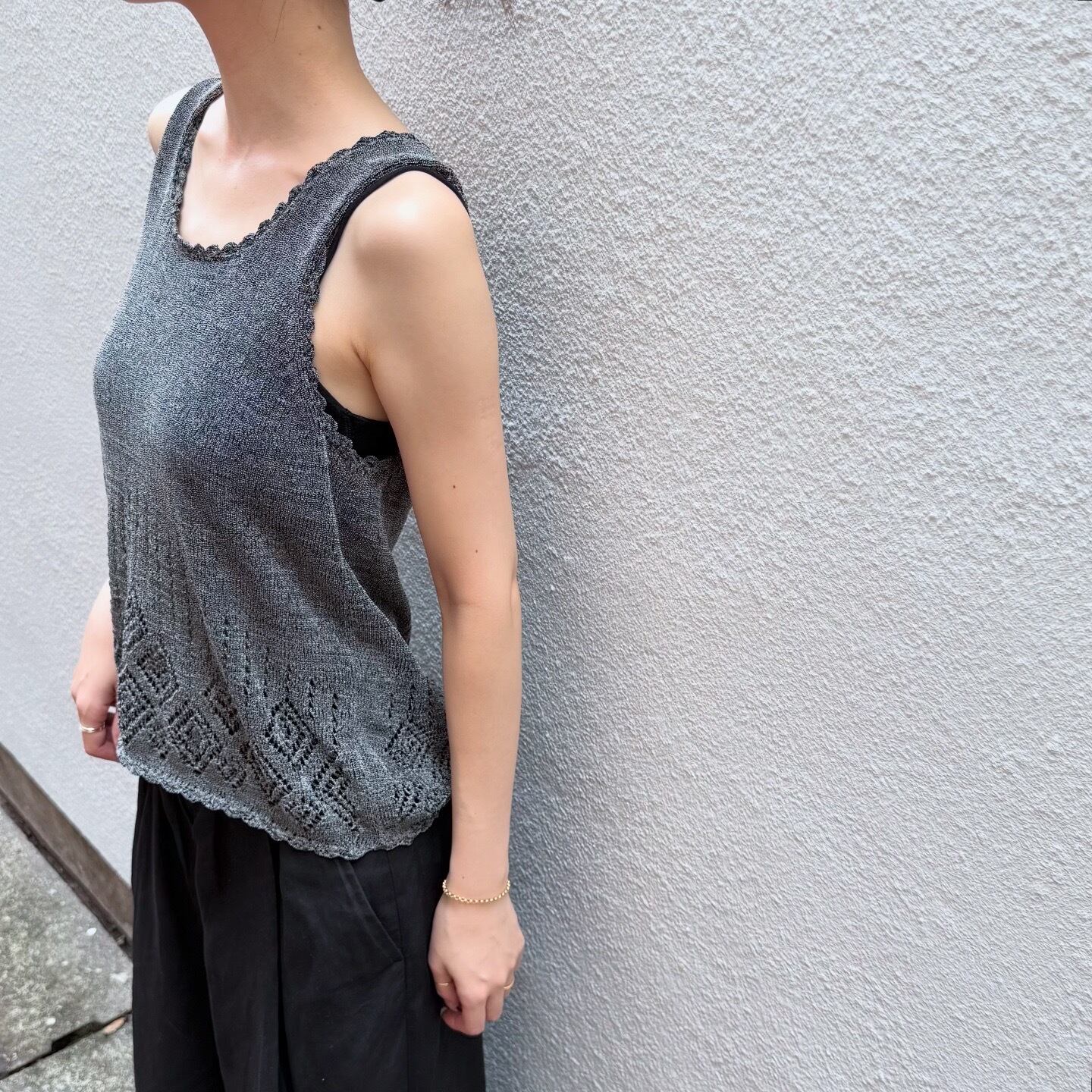 伸縮性のあるサマーニットでさらっと着心地の良いトップスです。裾の透かし編みが一癖あり可愛いです。