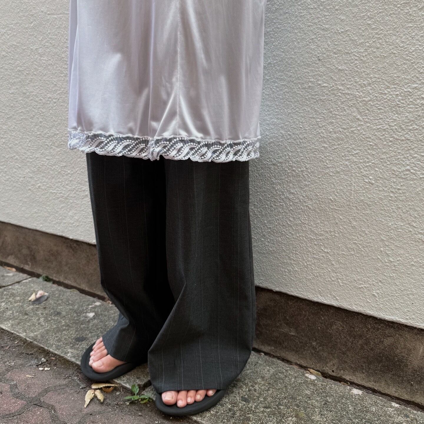 光沢のある生地感や裾のレースがフェミニンな印象のキャミワンピースです。