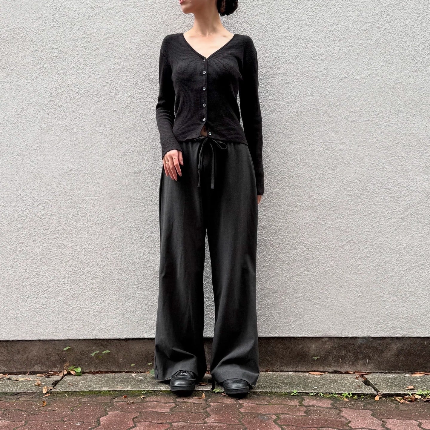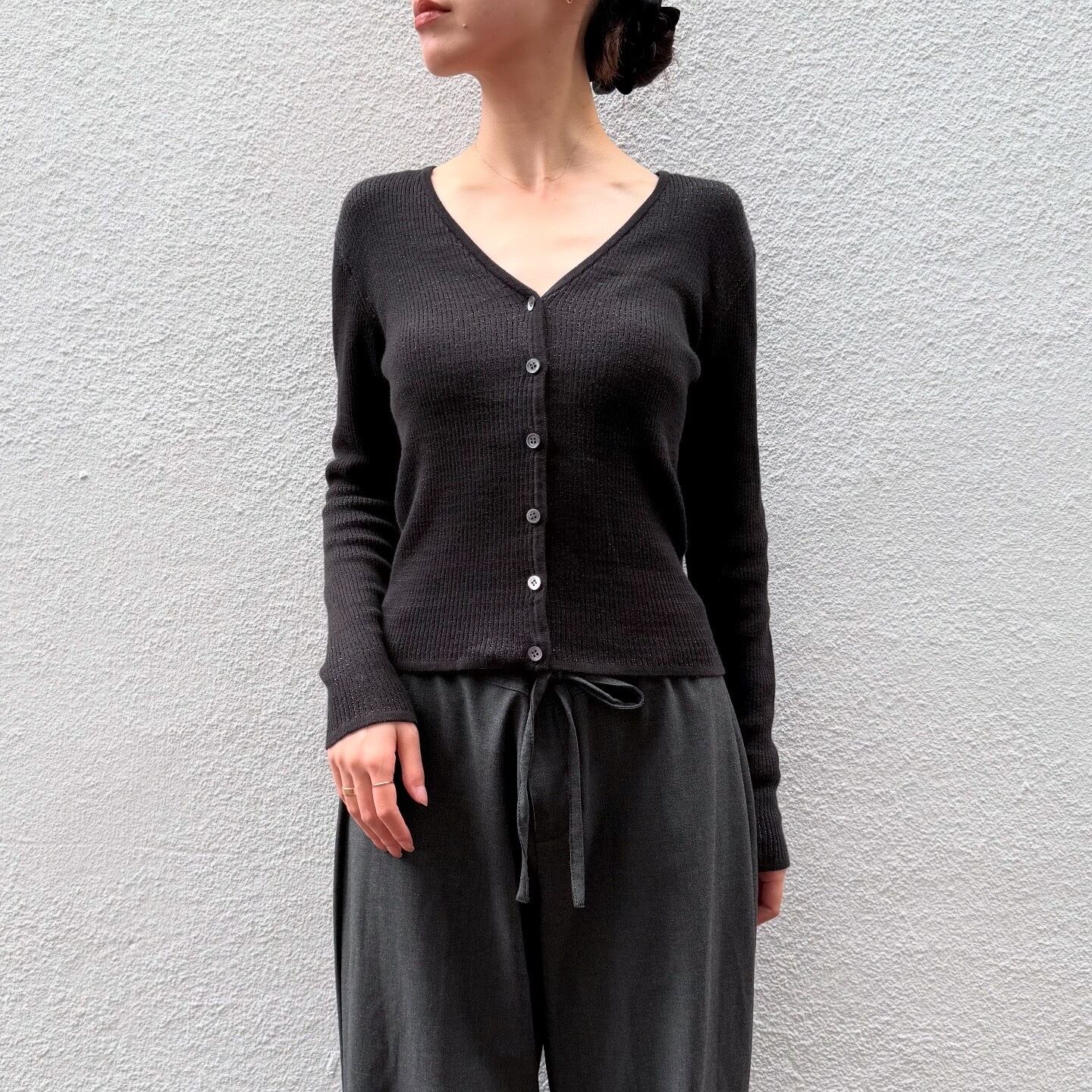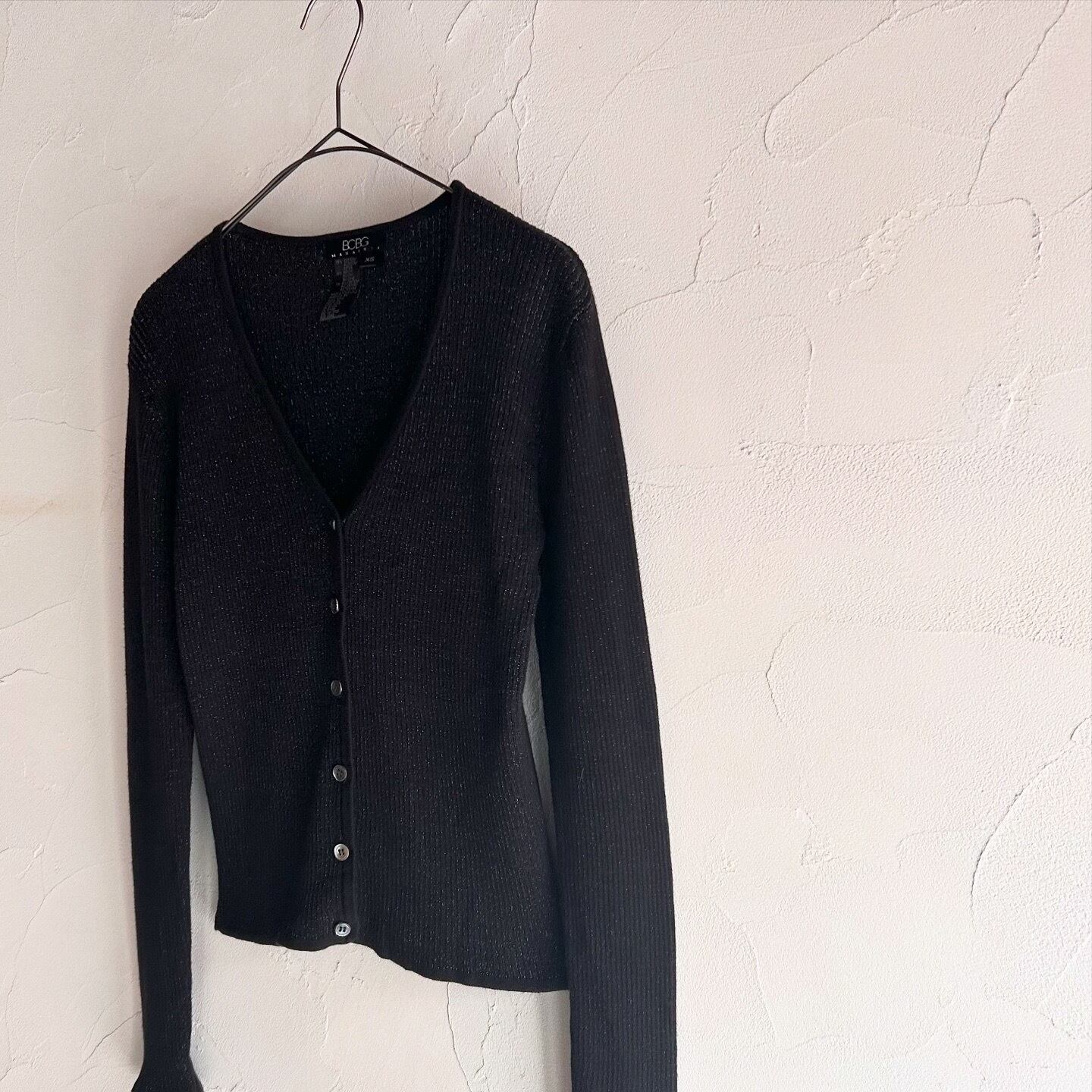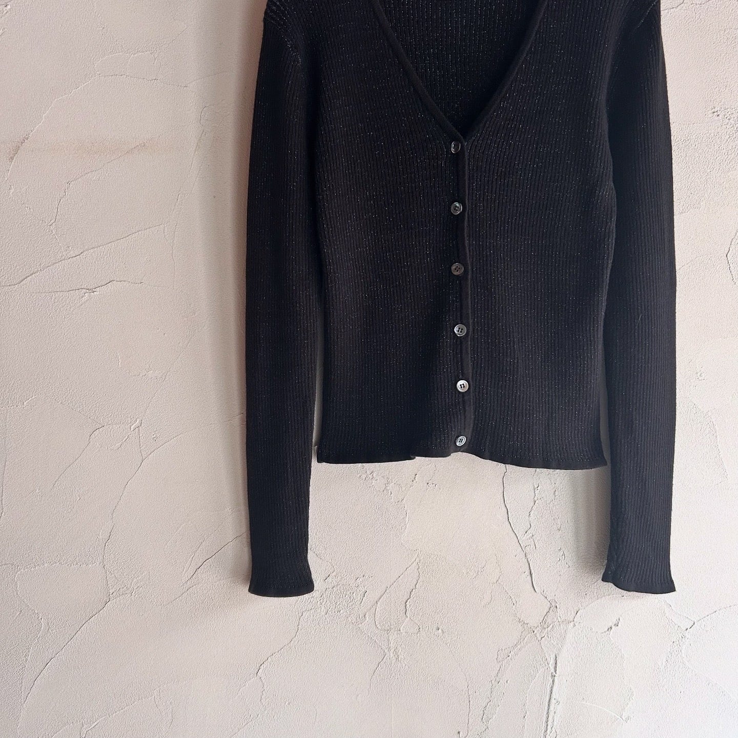 全体にシルバーのラメが編み込まれた華やかなリブニットカーディガンです。