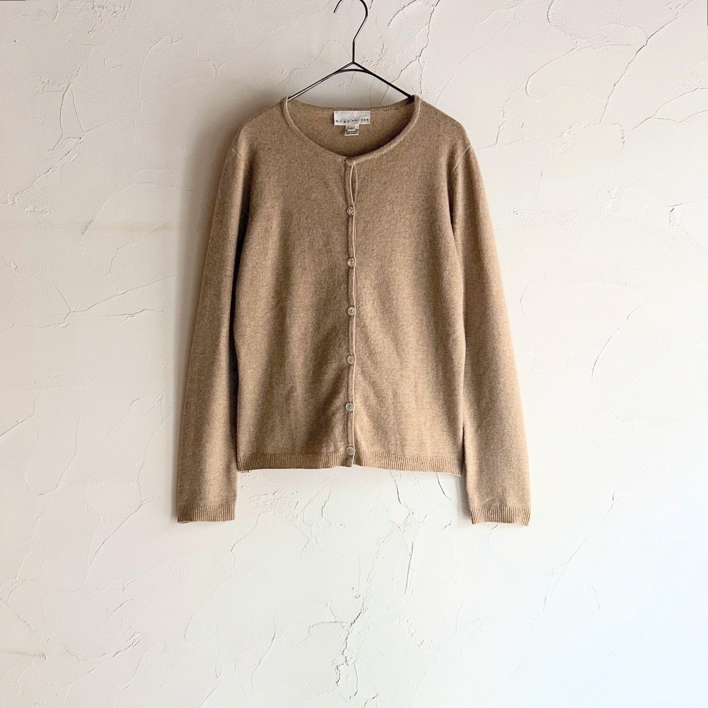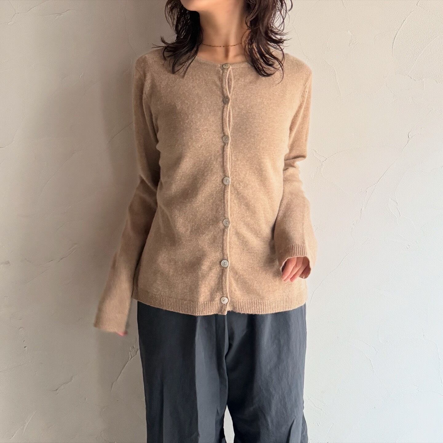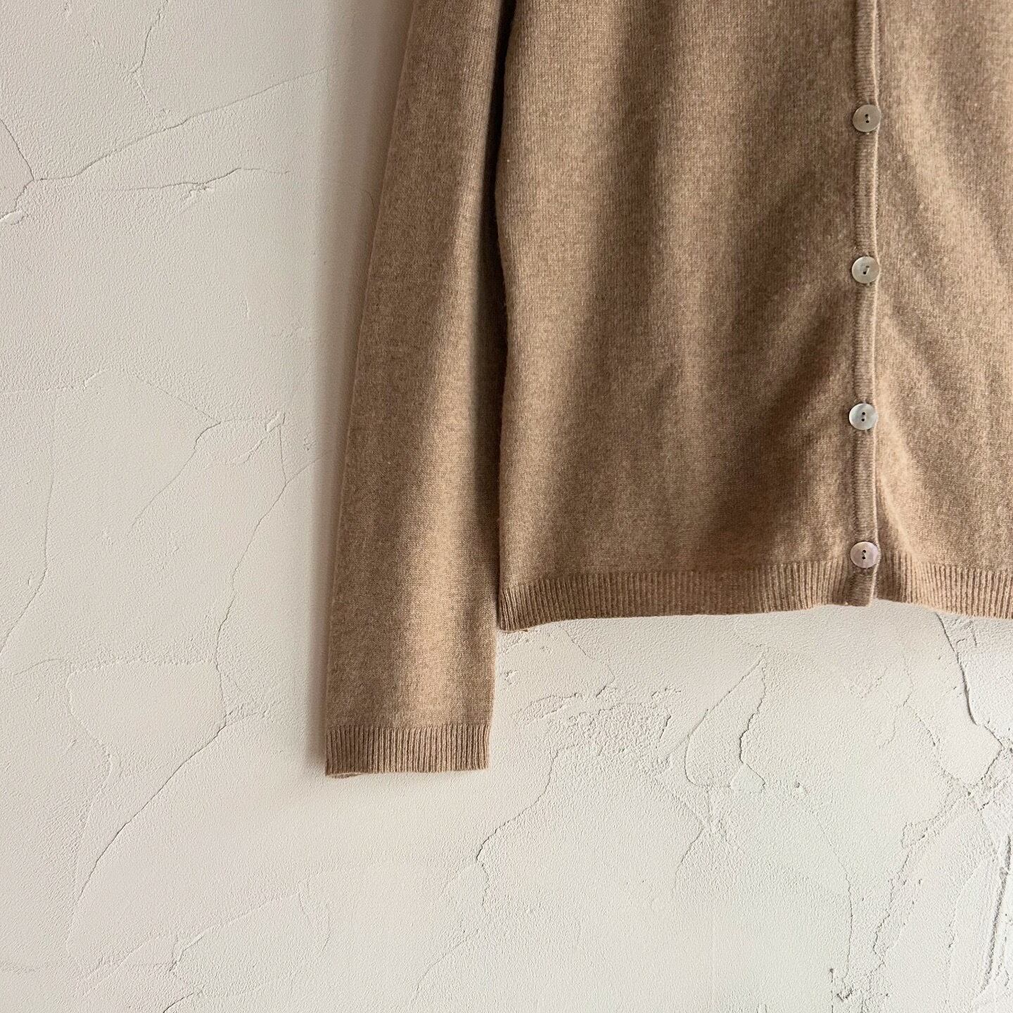 美しいシェルボタンが施された、カシミヤ100%のニットカーディガンです。