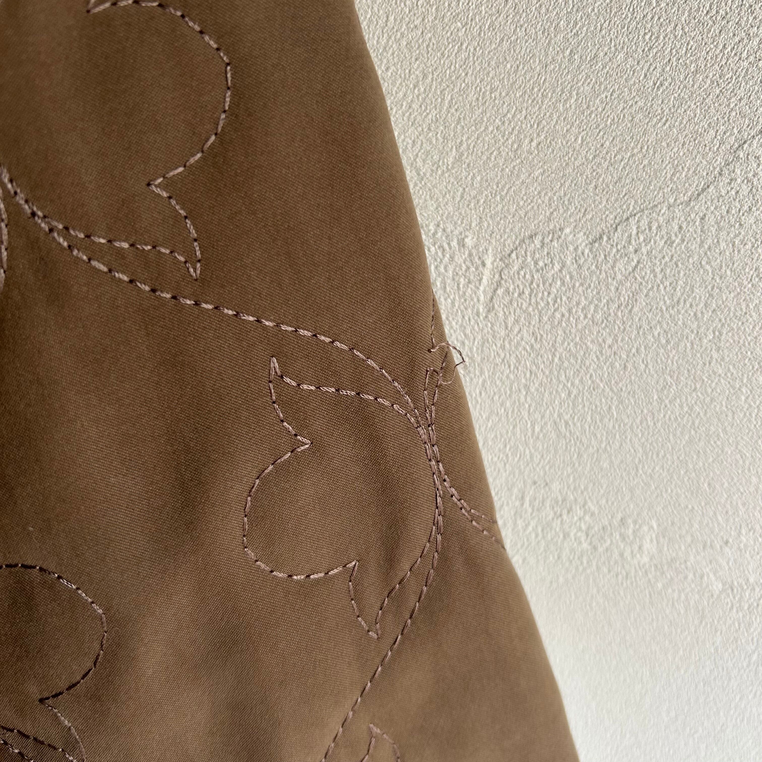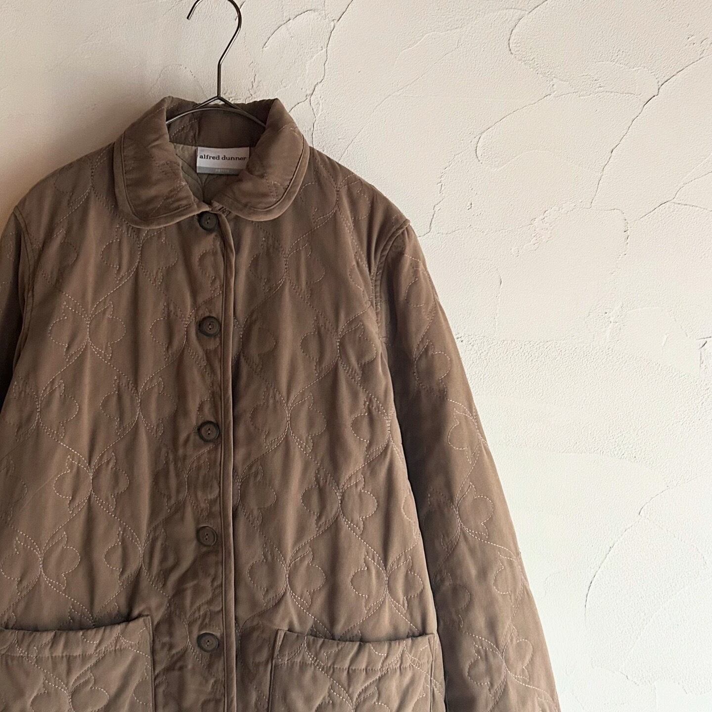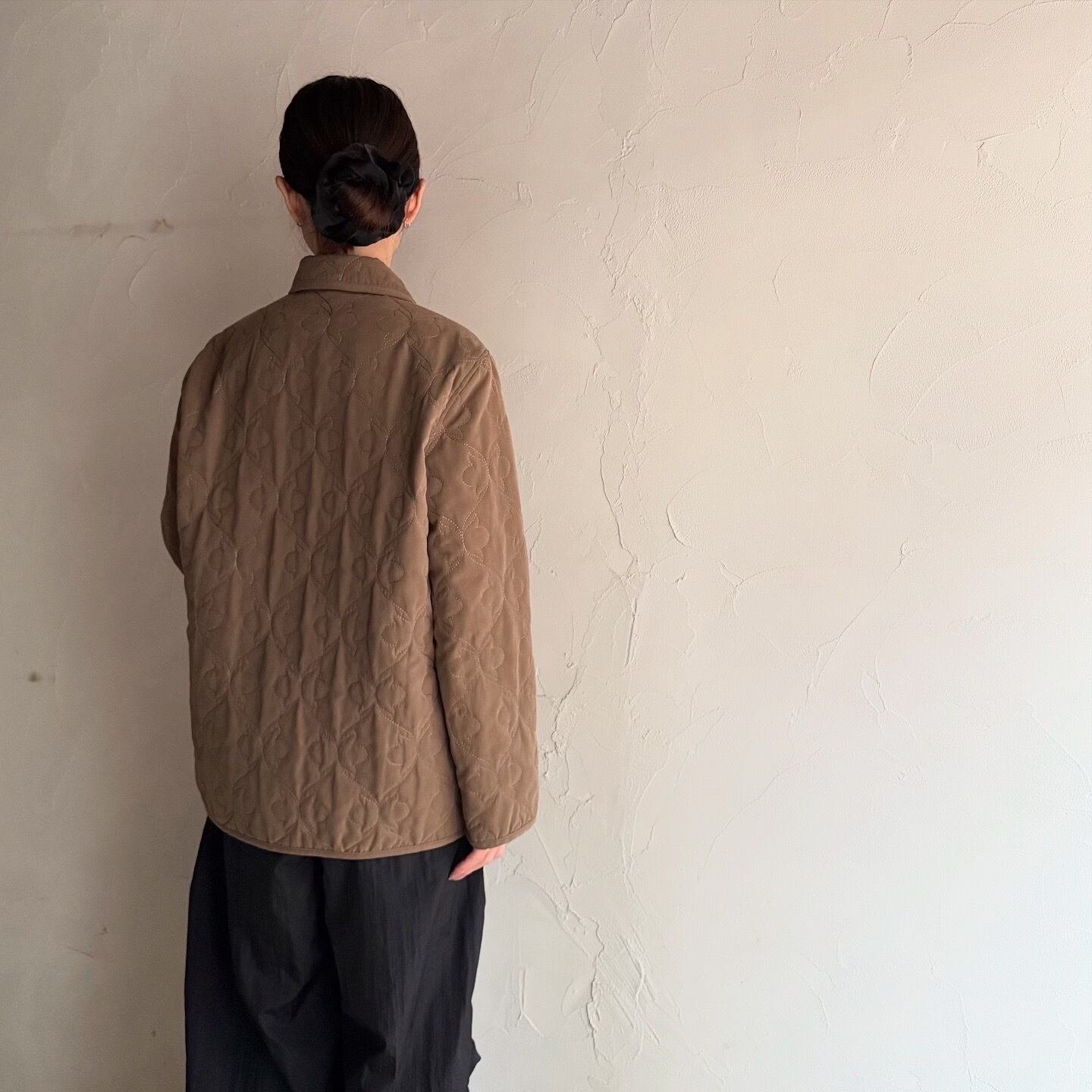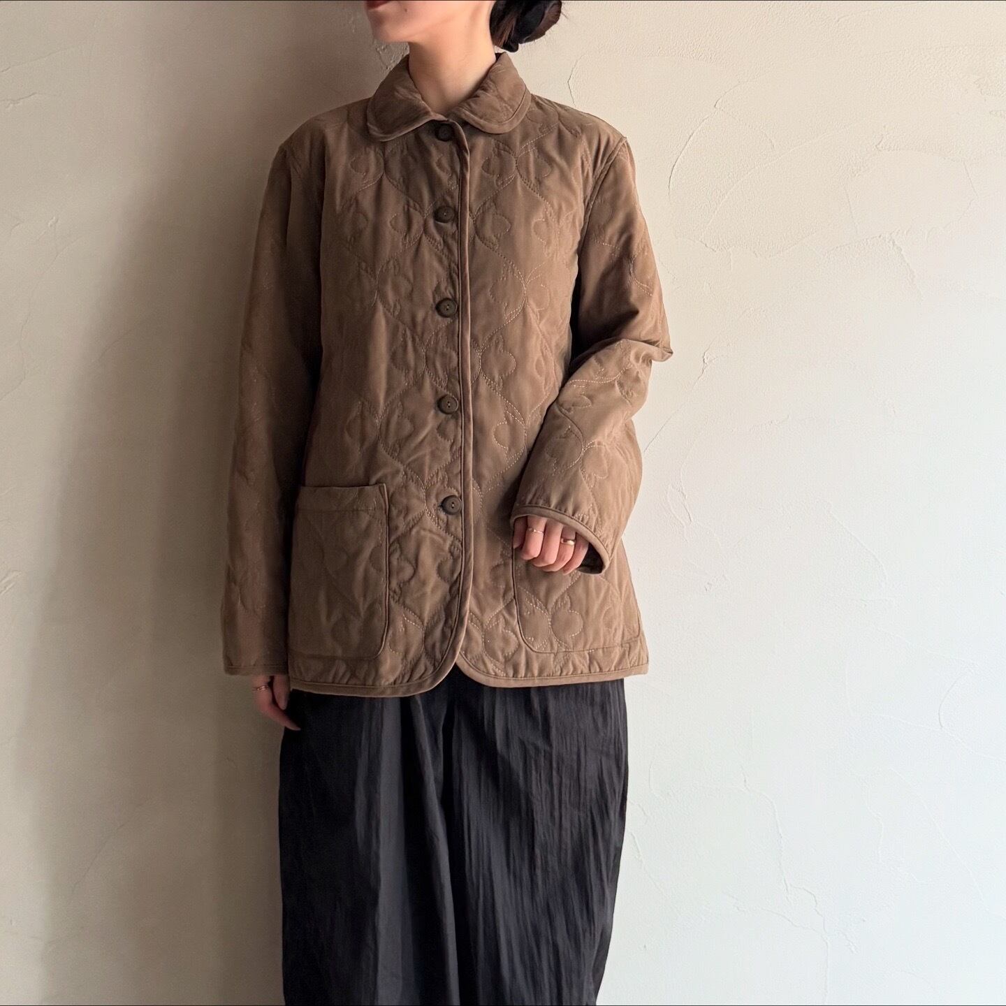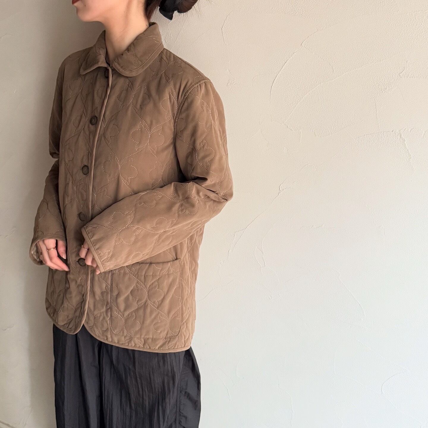 蝶々のような刺繍とマットな素材感が可愛いキルティングジャケットです。