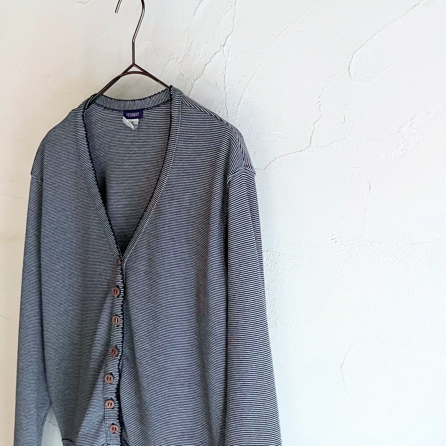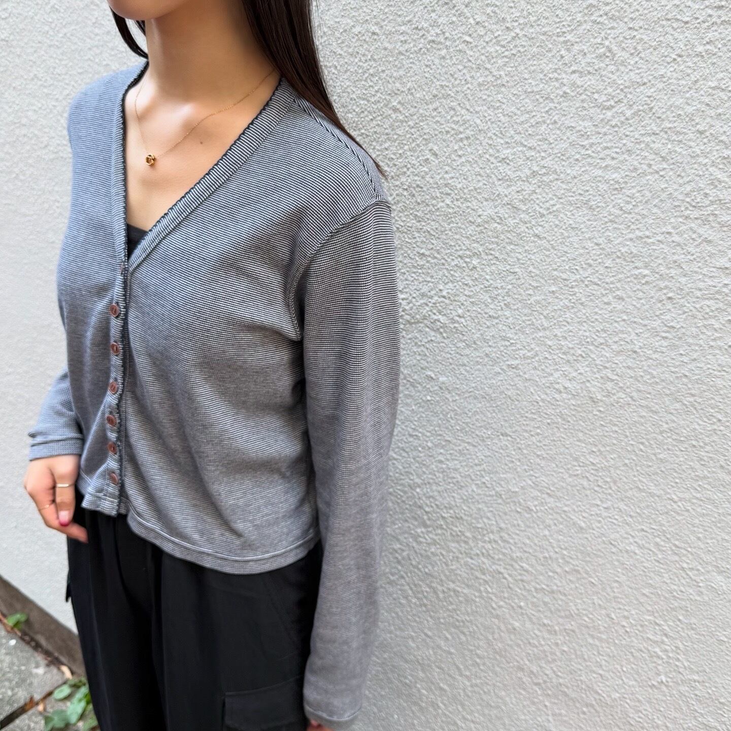 ネイビーとホワイトのとても細いボーダーで、首周りがヒラヒラとしたパイピングになっています。