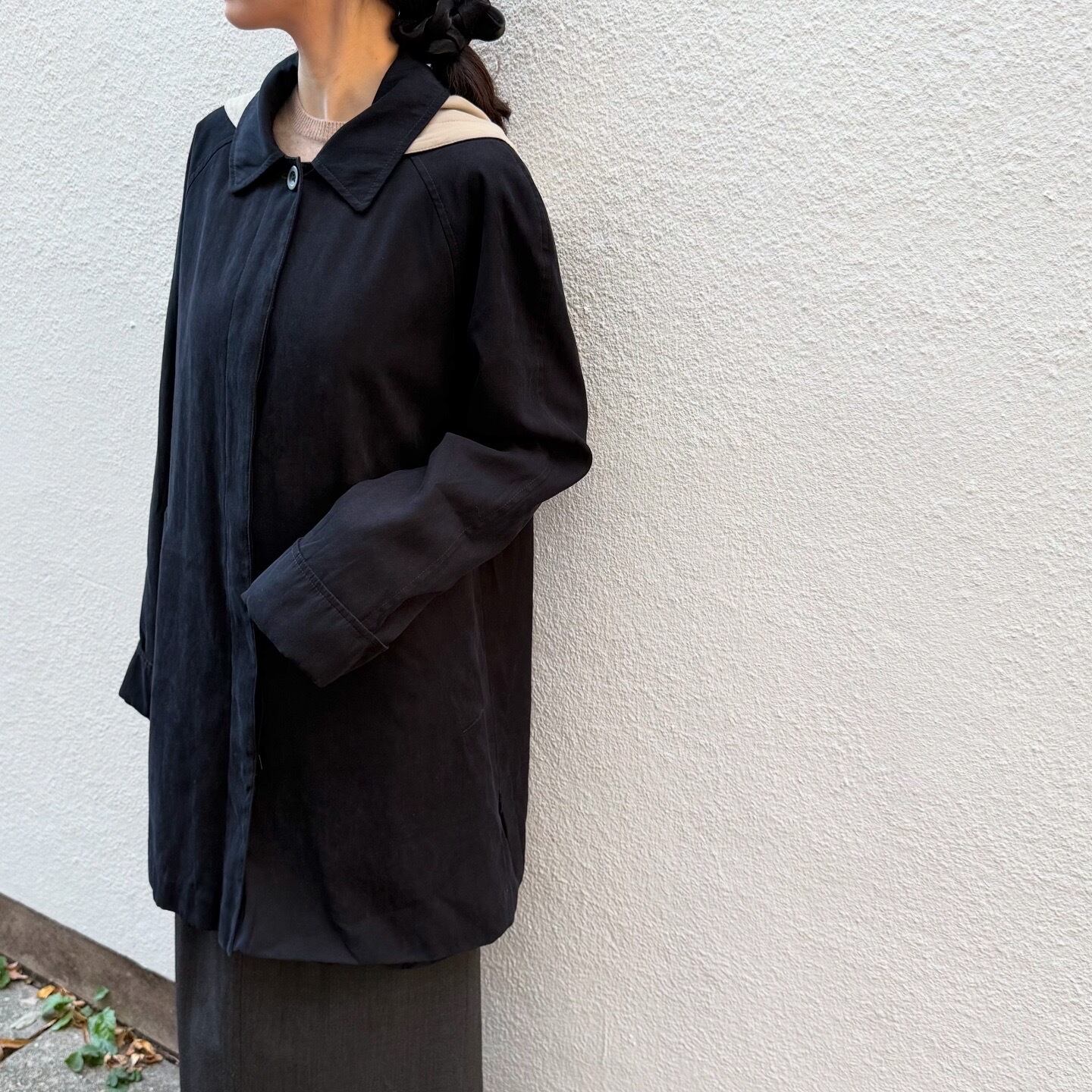 フェイクスエードのコートです。取り外し可能なバイカラーのフードと、ポケットのチャームタグがワンポイントで可愛いです。