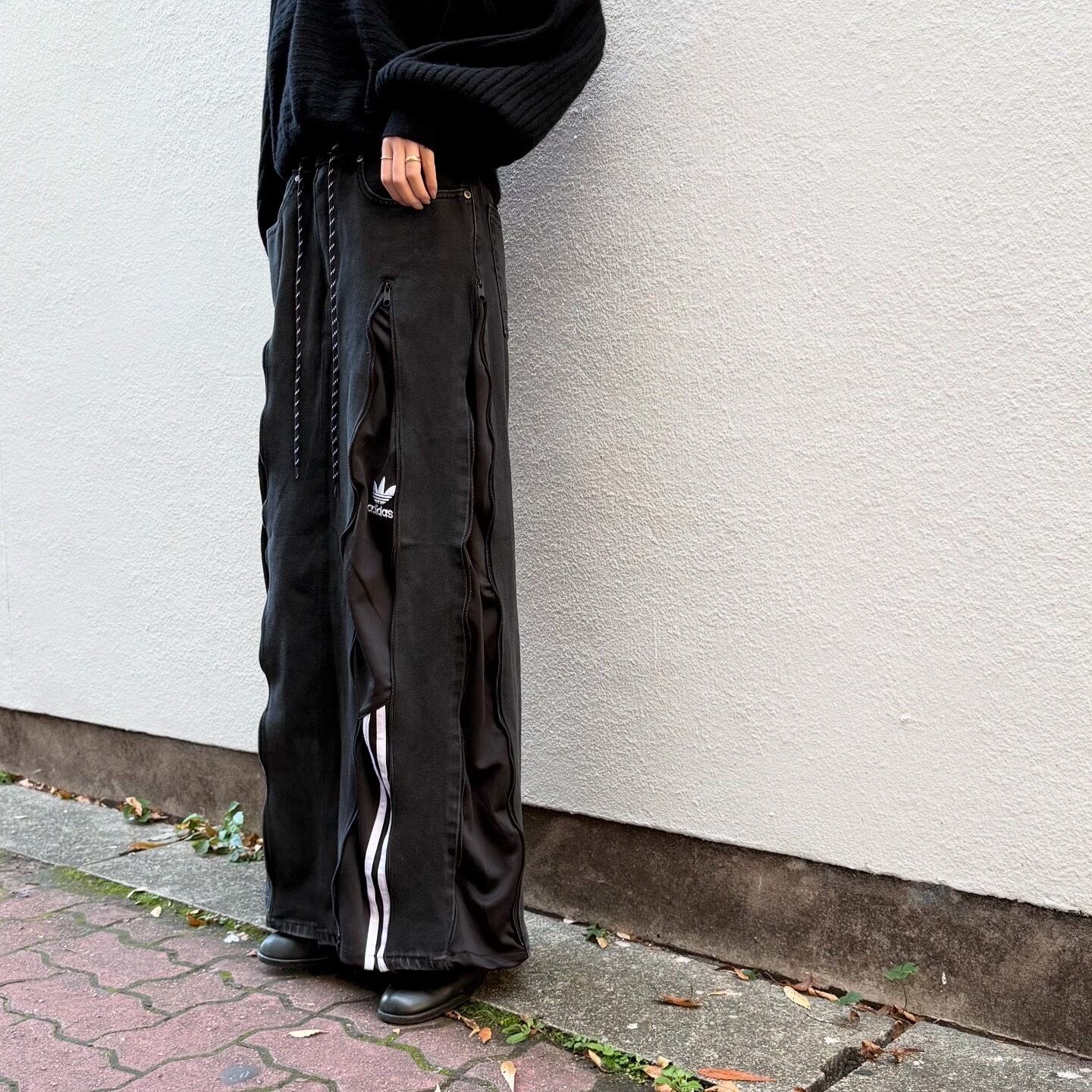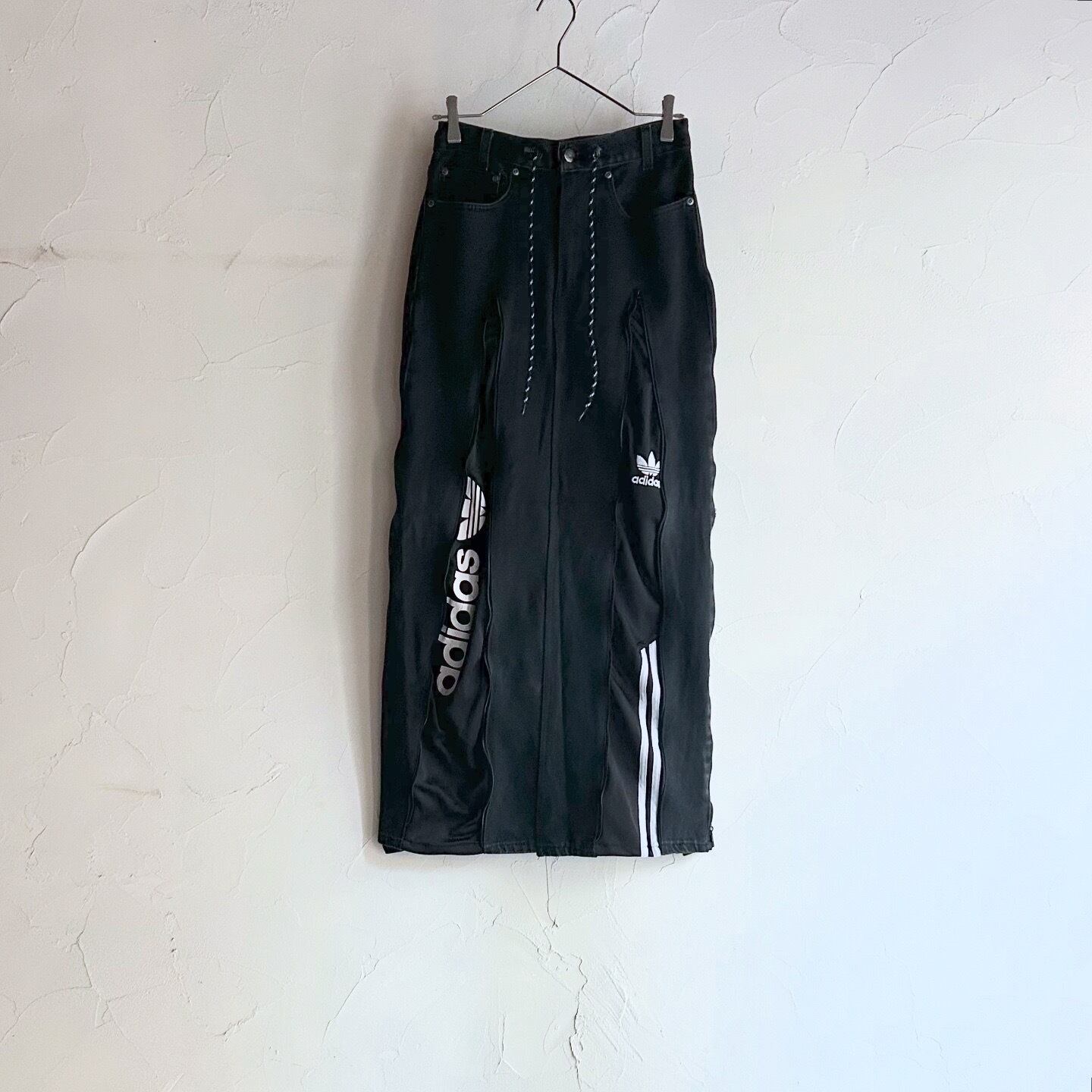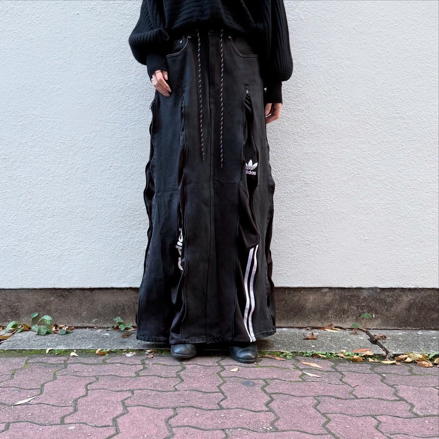 デニムとadidasのトラックパンツを縫い合わせたスカート。