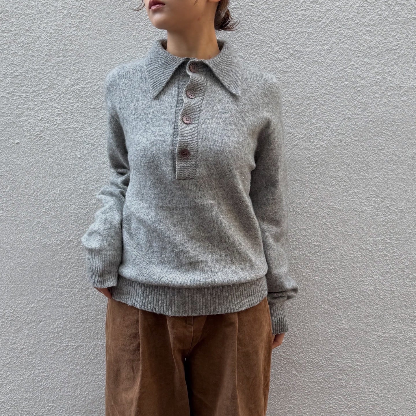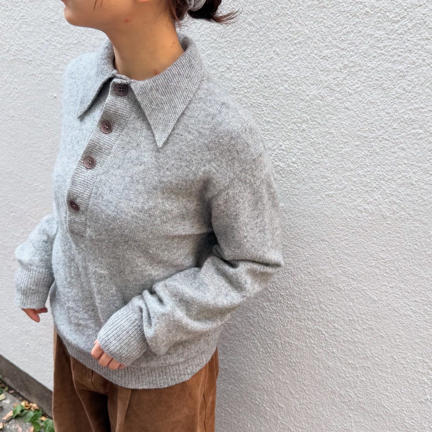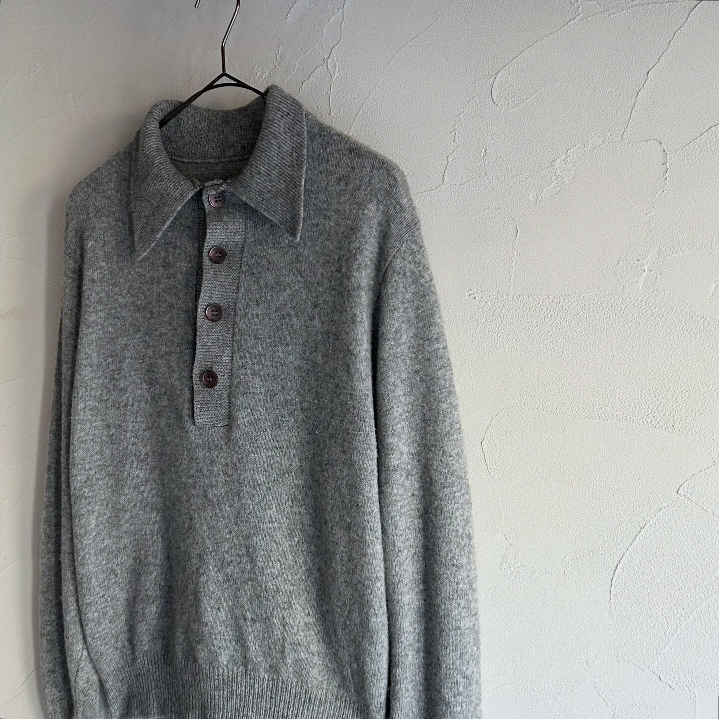 大ぶりの薄紫色のボタンが可愛いニットポロです。