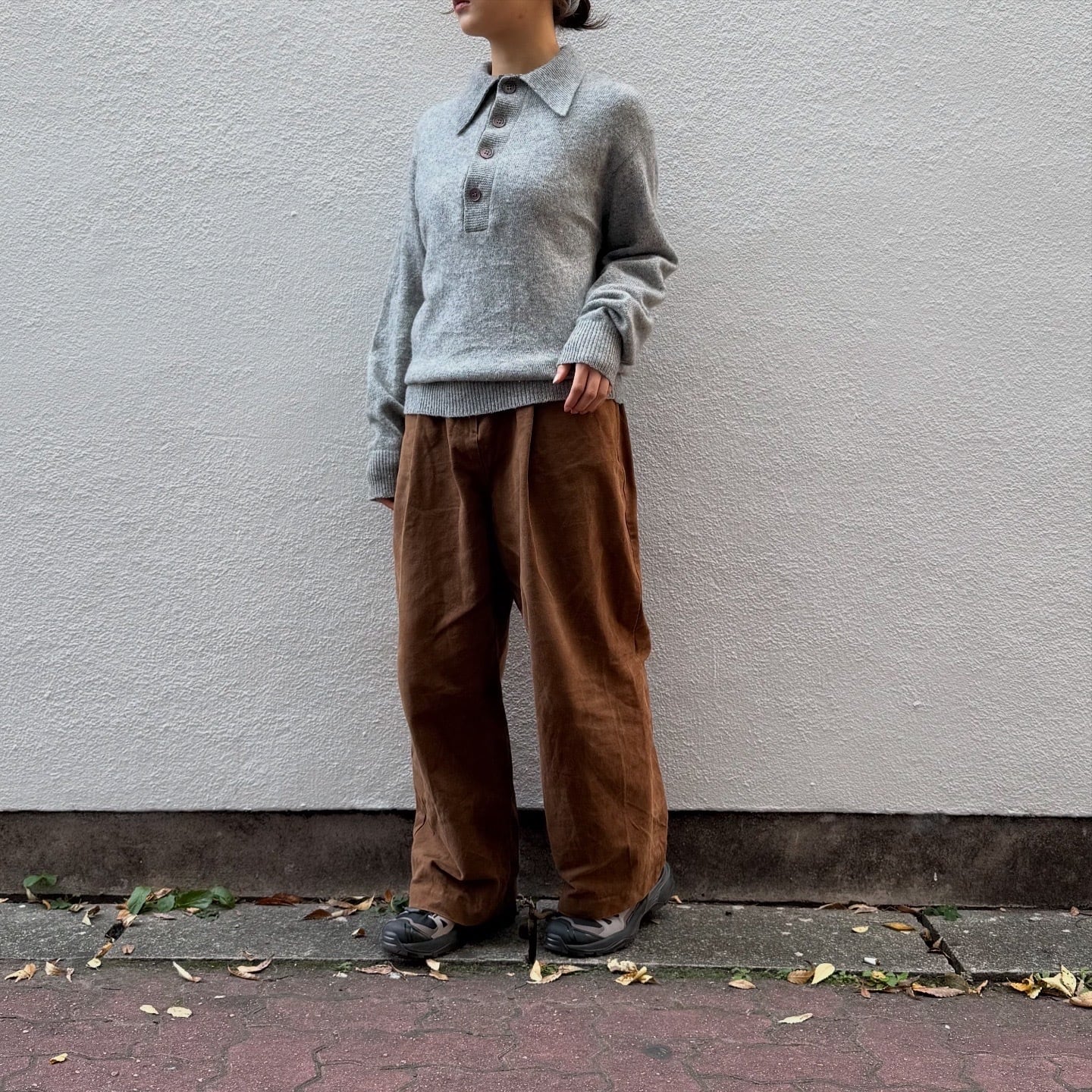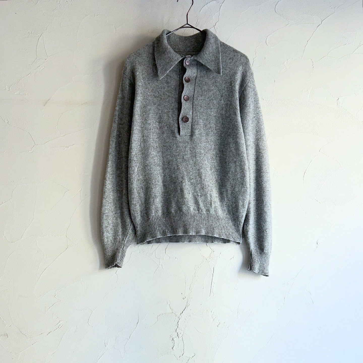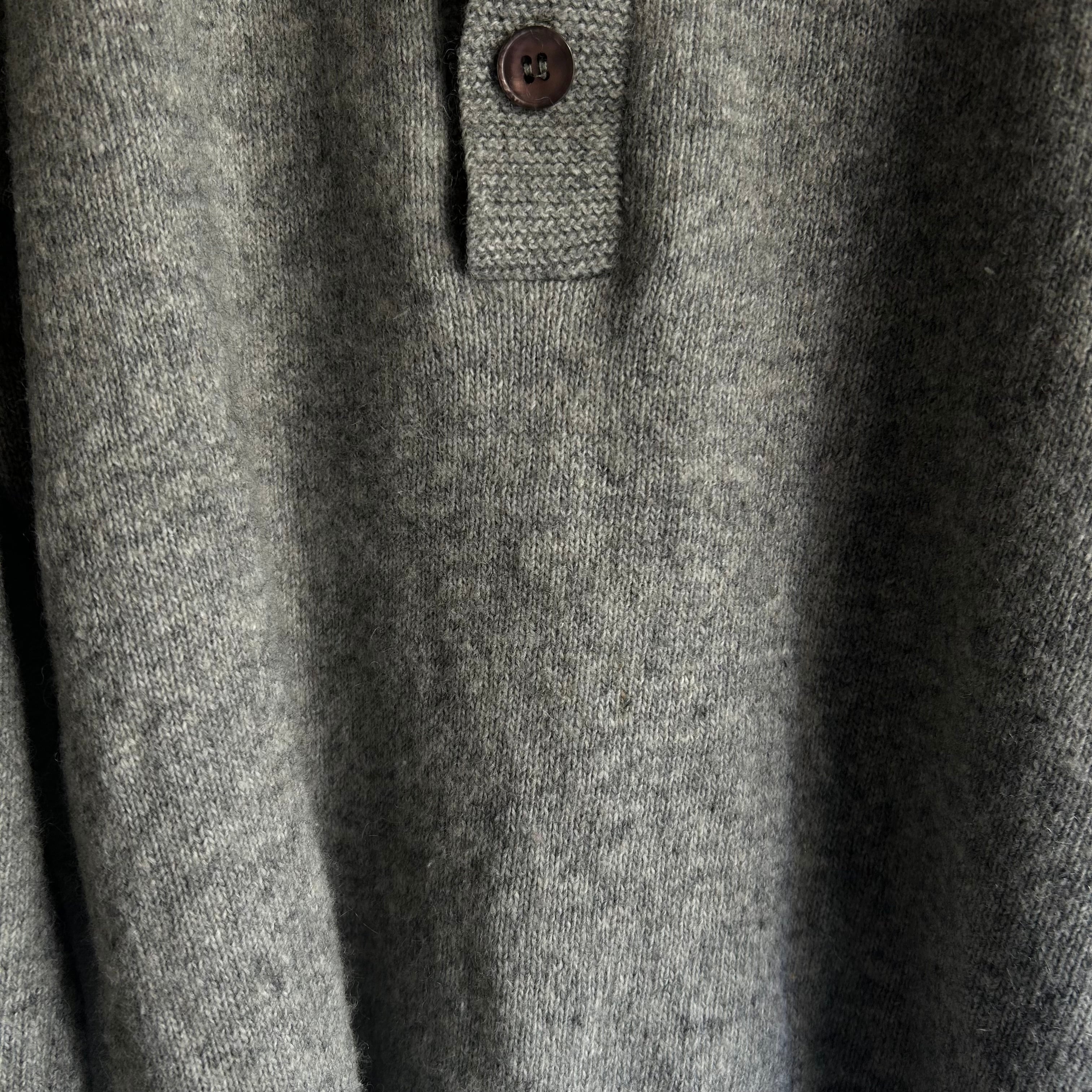 大ぶりの薄紫色のボタンが可愛いニットポロです。