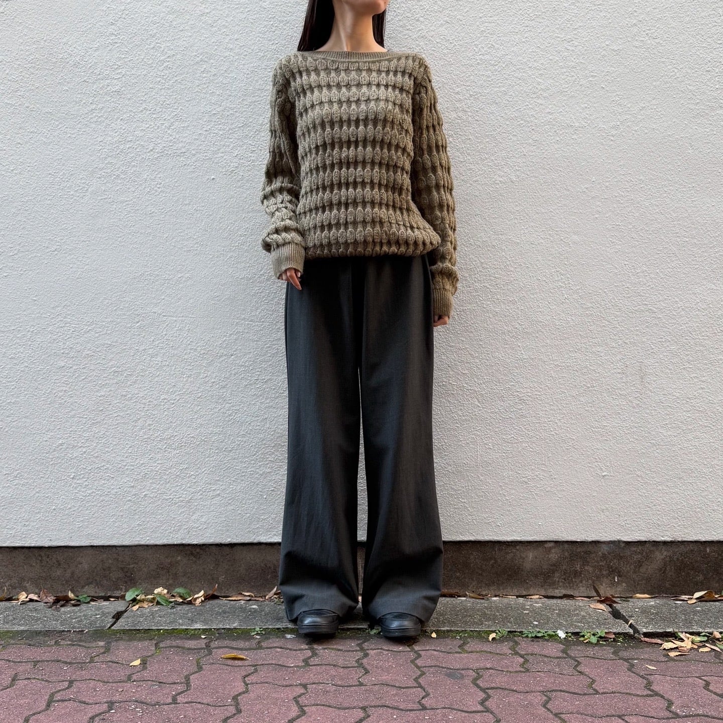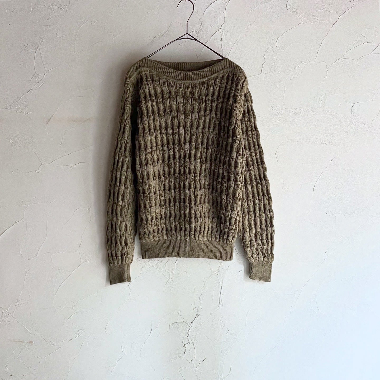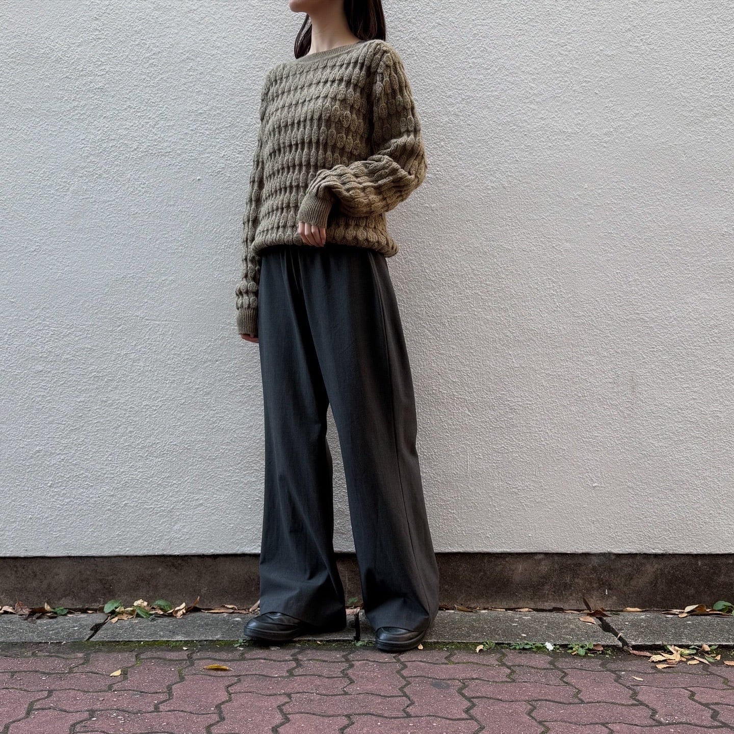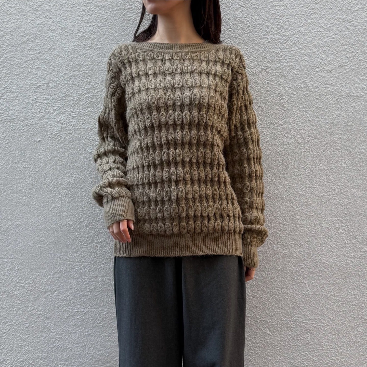 ボートネックがスッキリとした印象のニットです。凹凸のある生地で柔らかく着心地の良い一着です。