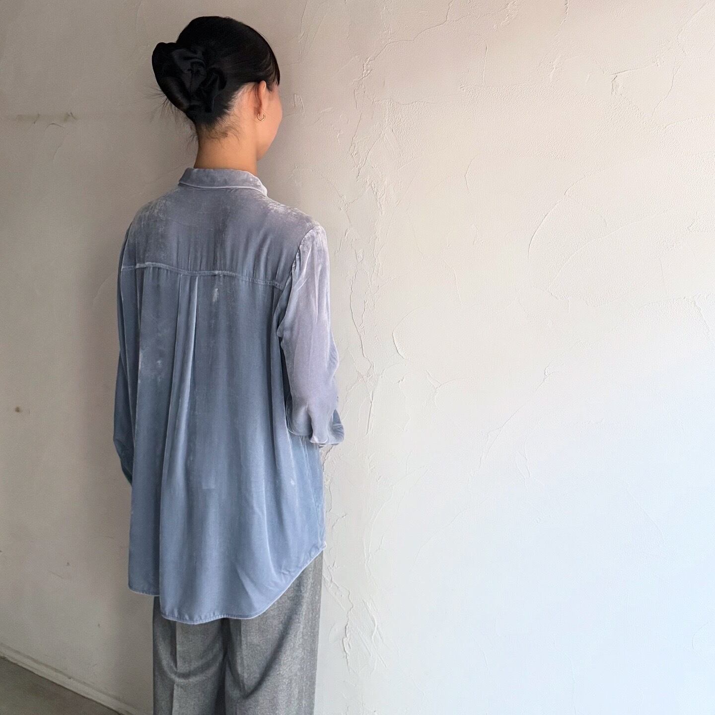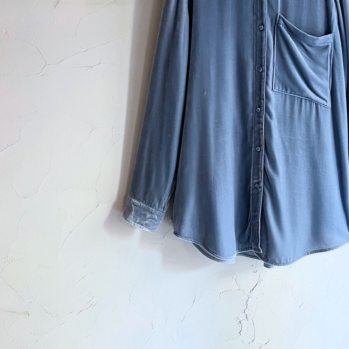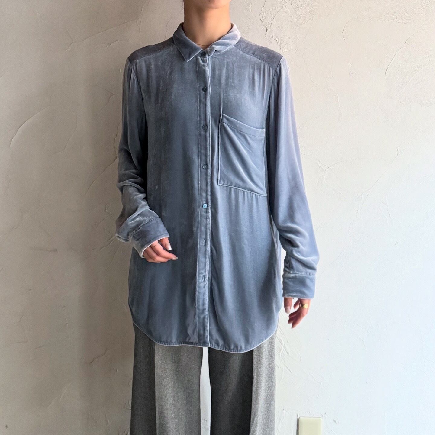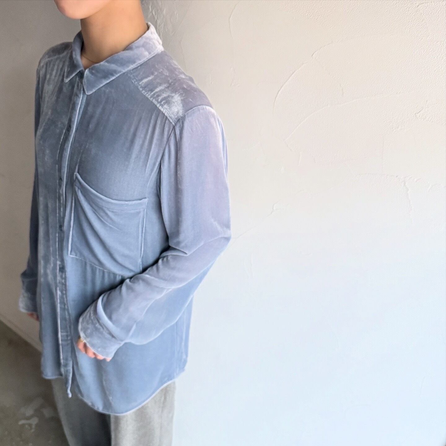 淡いブルーが素敵なベロアシャツです。