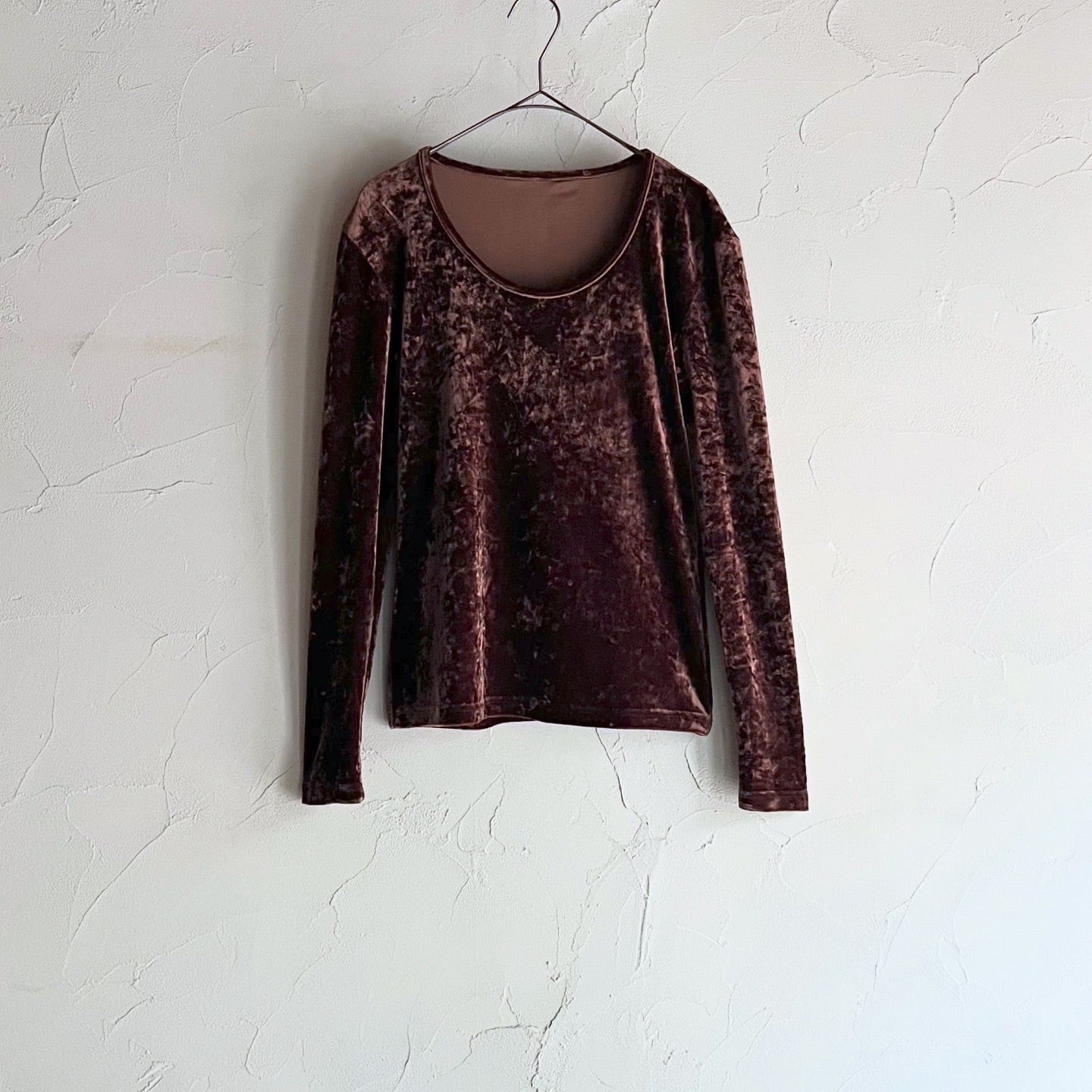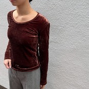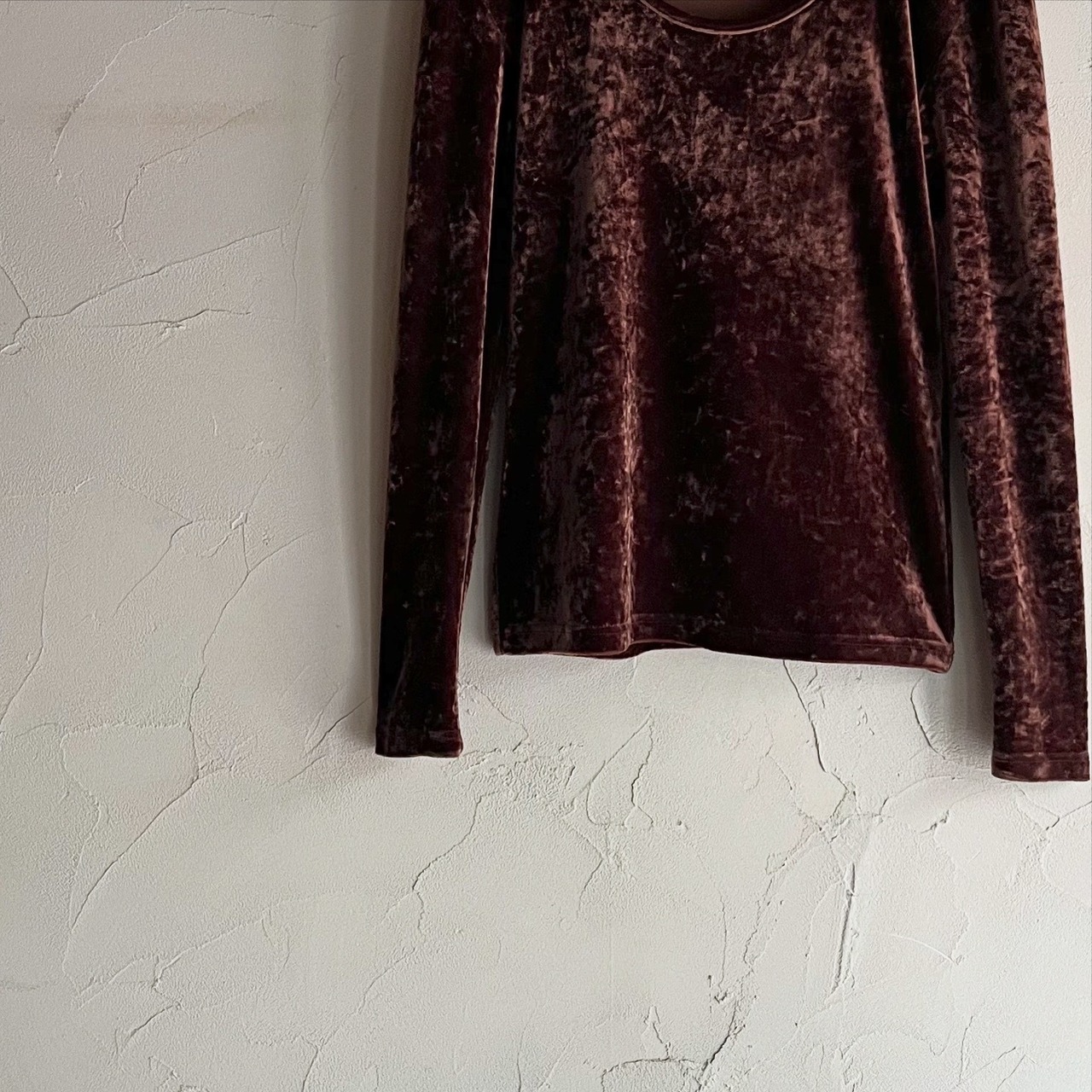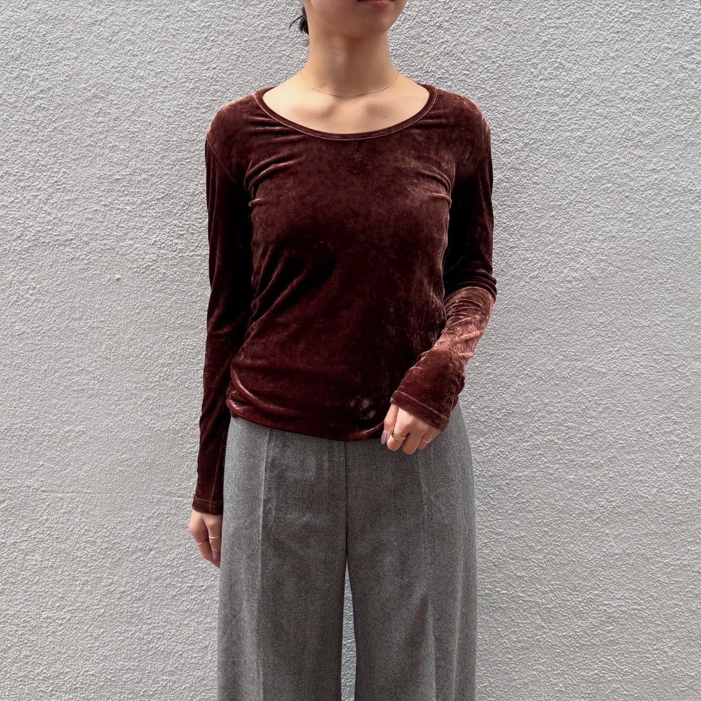 程よい光沢や首周りのスッキリとした形が美しいベロアトップスです。