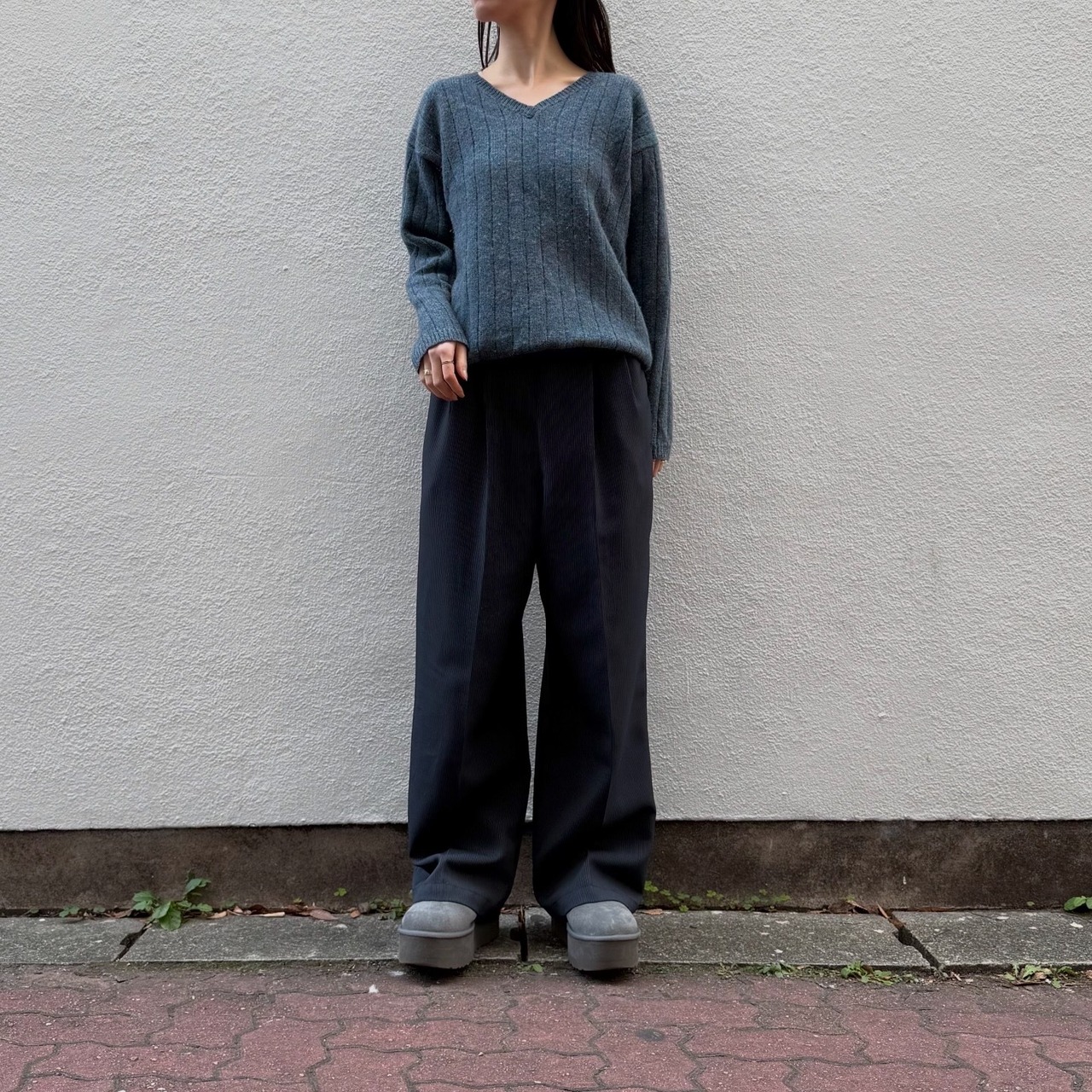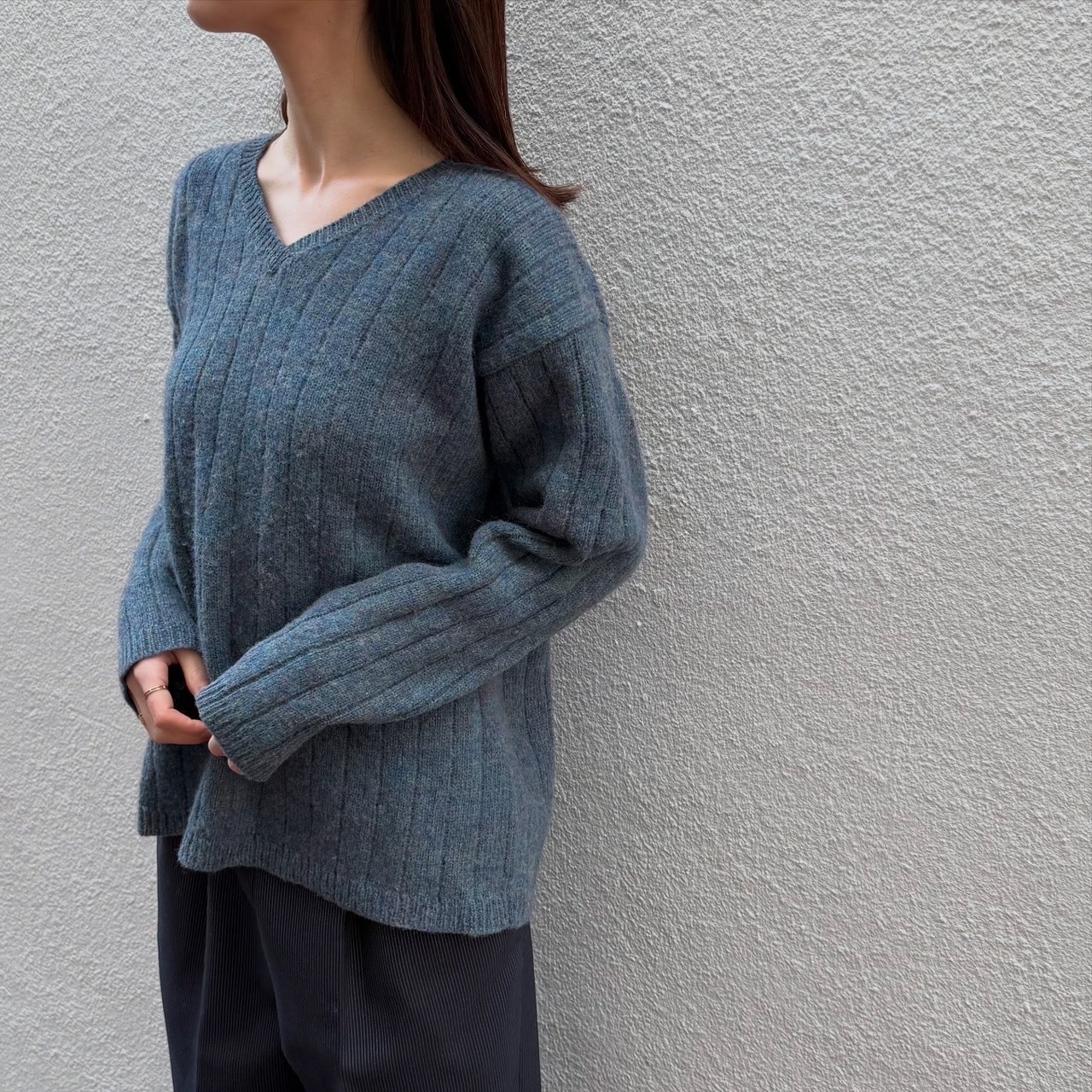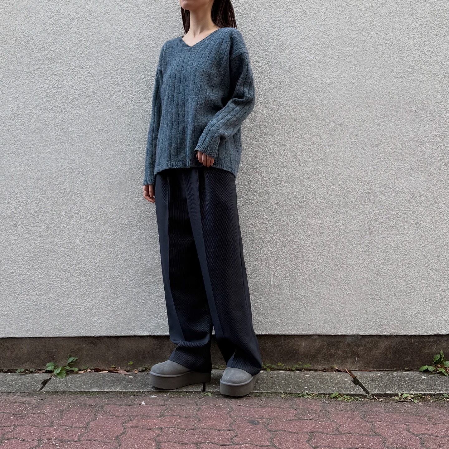 様々な糸が織り交ざった絶妙な色味が素敵なニットです。