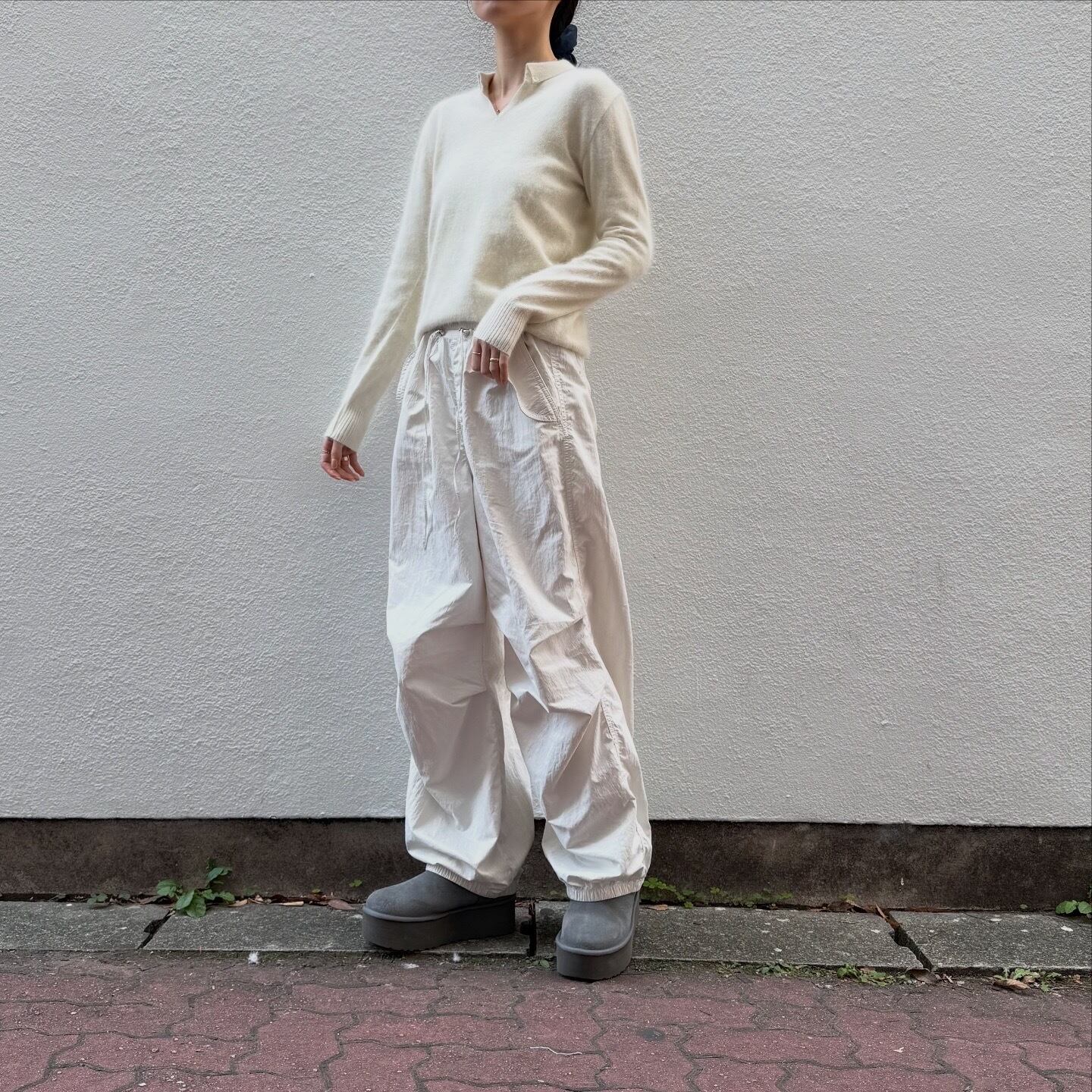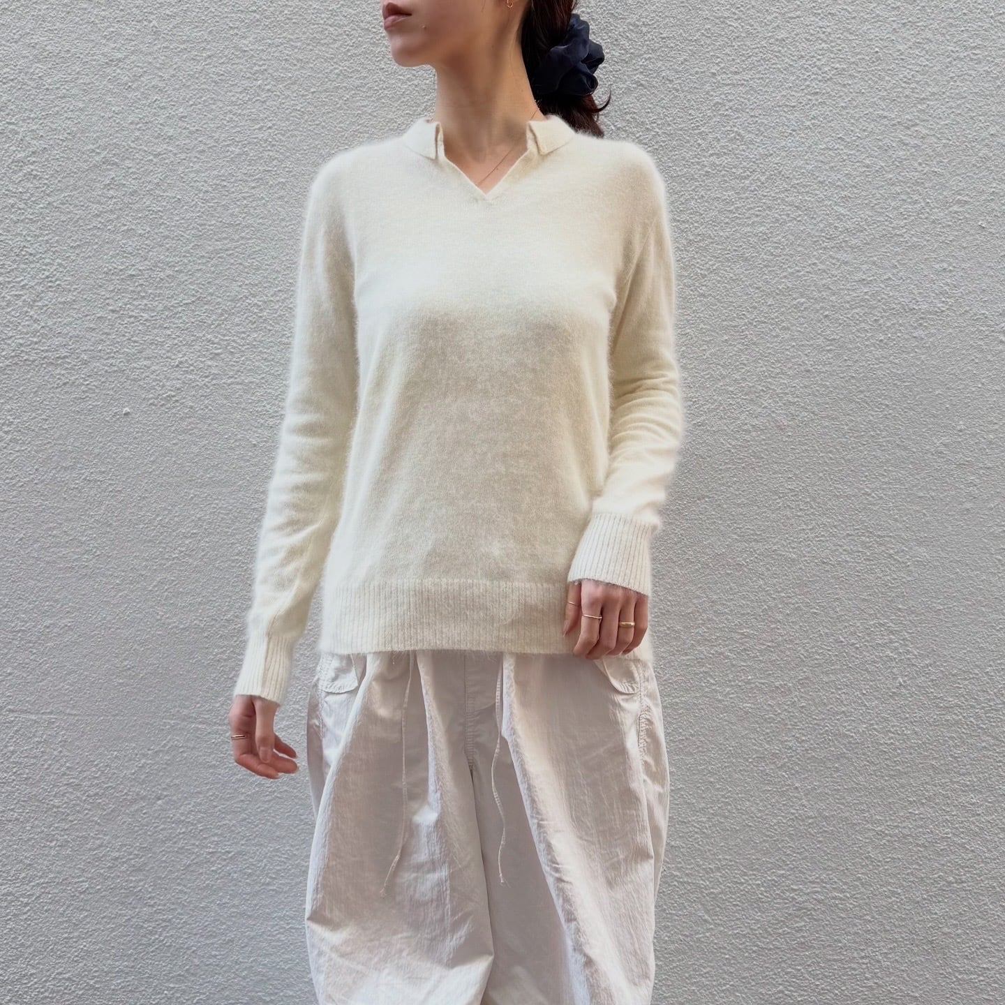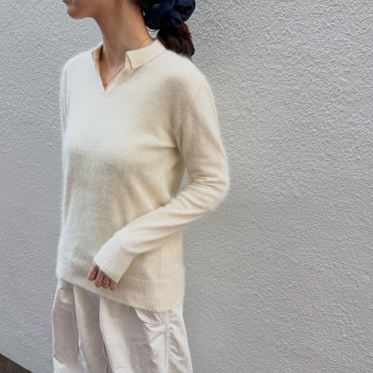 程よく開いた襟にさりげなく施されたボタンが大人可愛い一着です。