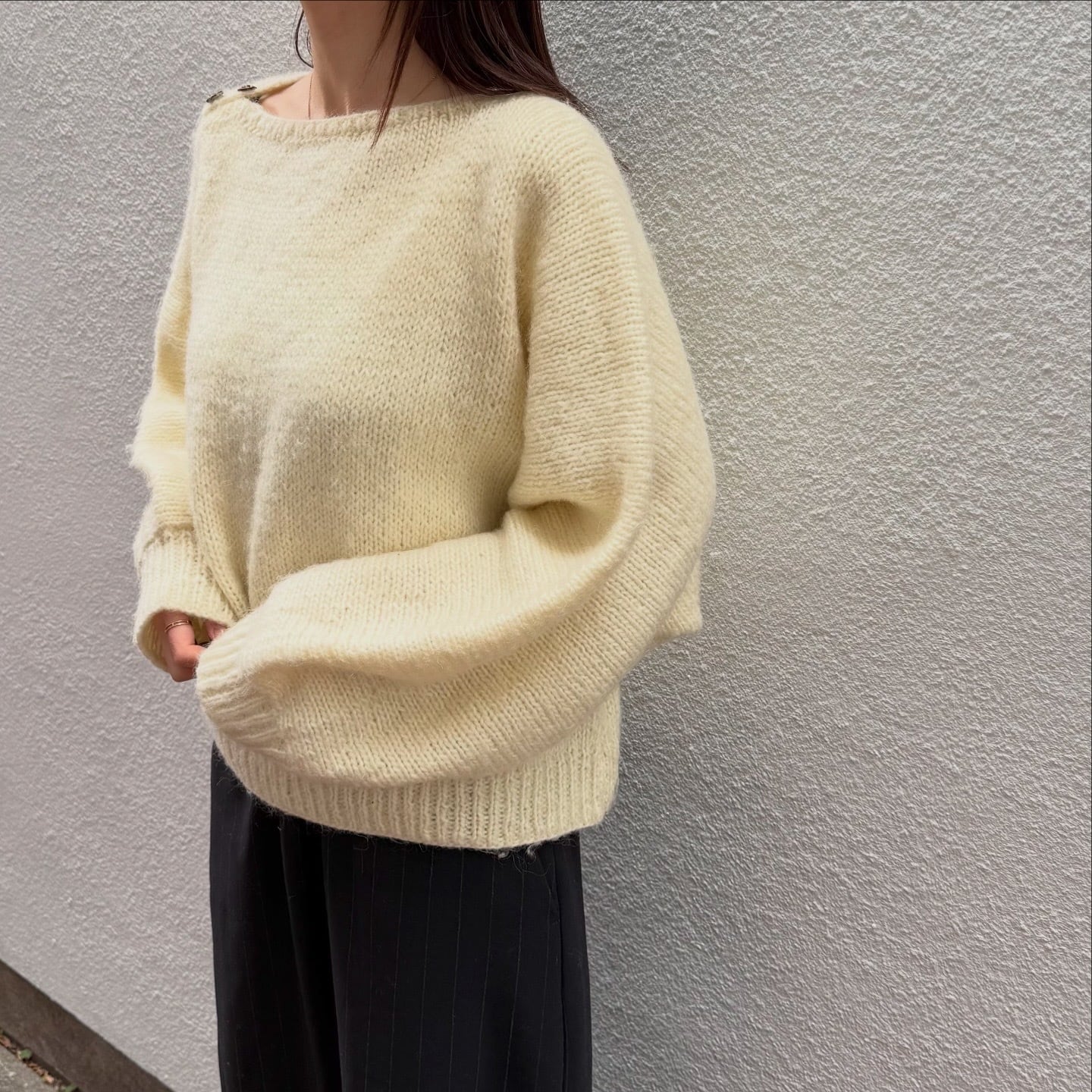 ドルマンスリーブのゆるっとした袖が可愛いニットです。