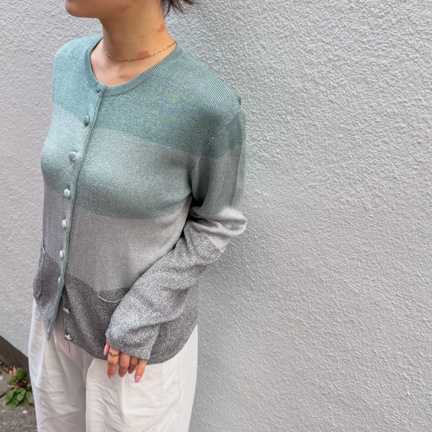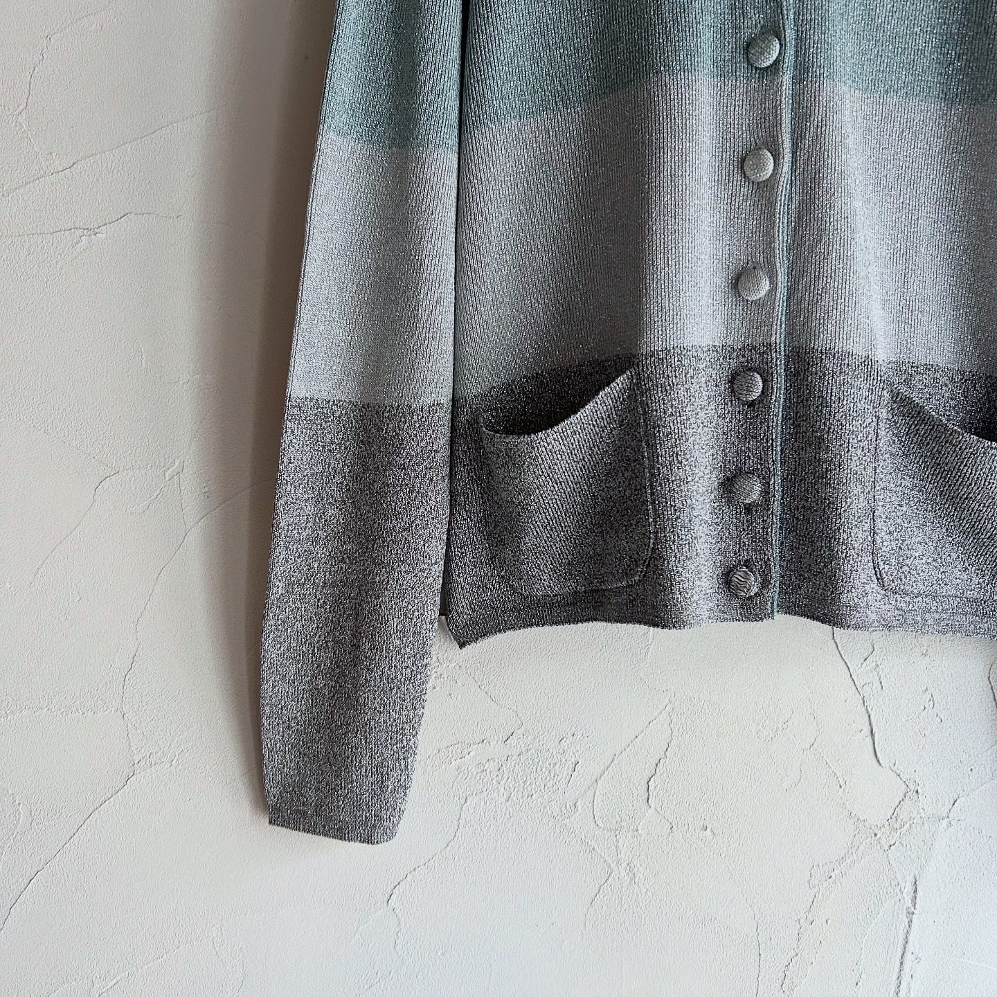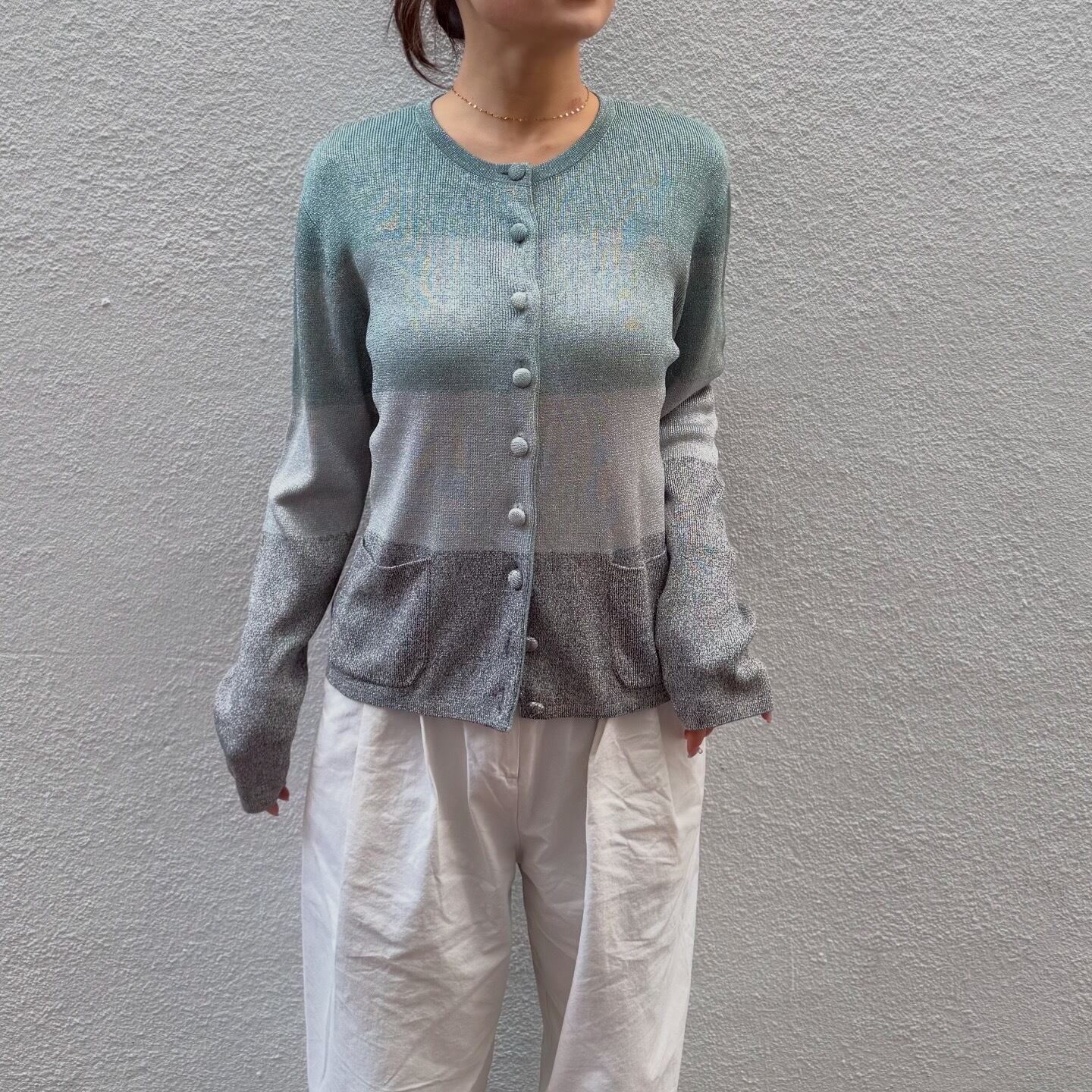 寒色のグラデーションとシルバーラメのバランスが美しいニットカーディガンです。