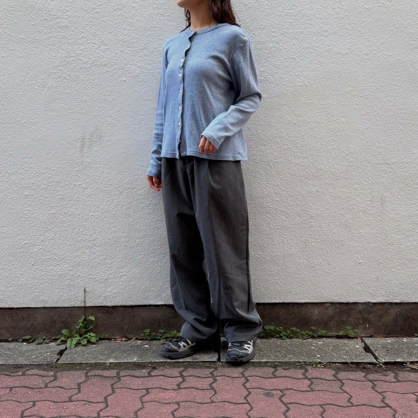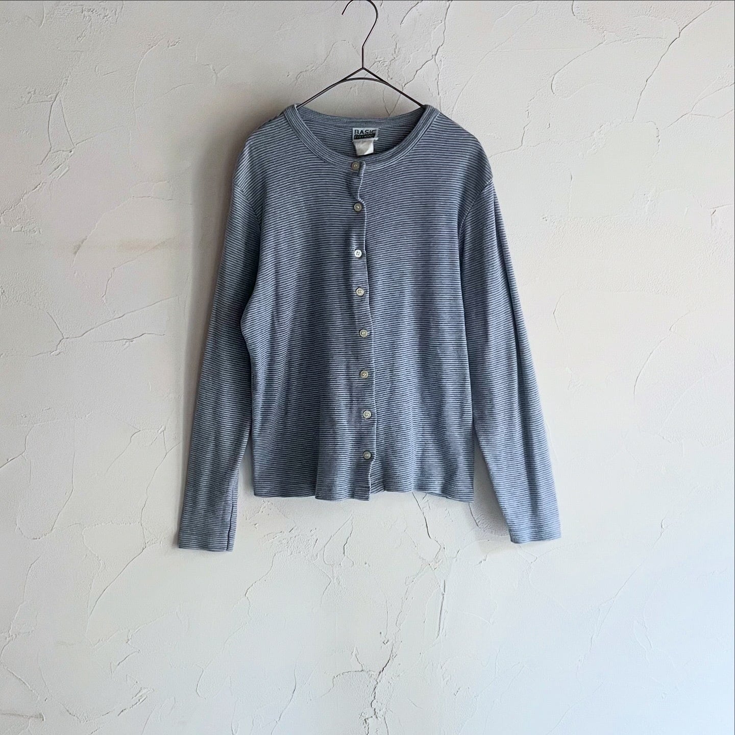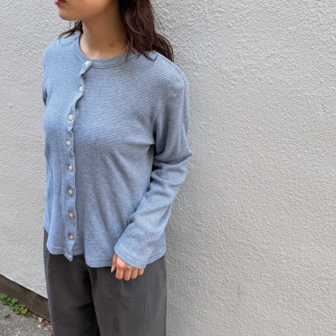 細めのボーダーや配色が落ち着いた印象のカーディガンです。