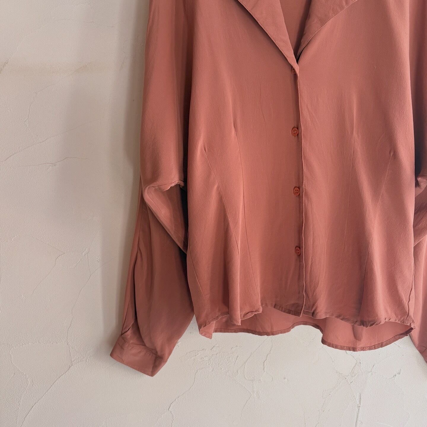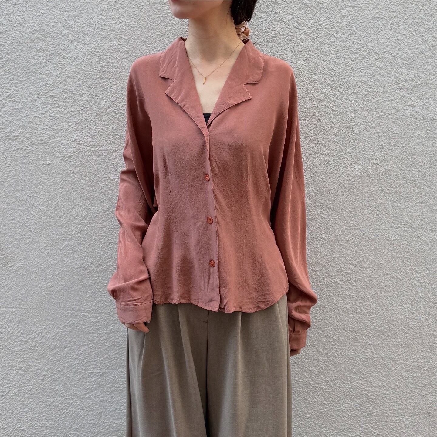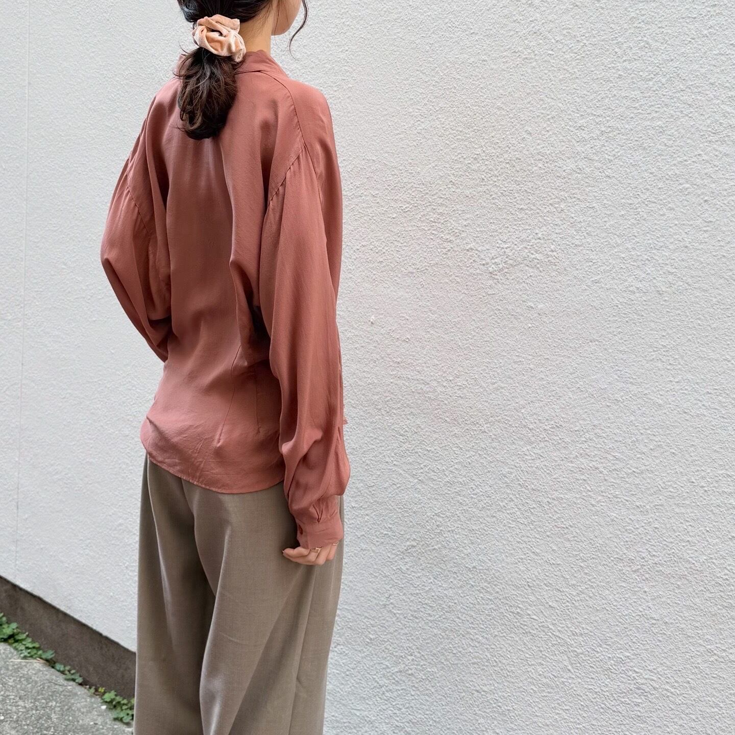 100%シルクで肌触りの良いシャツです。ウエストにダーツ、ドルマンスリーブのディティールが他にはない一着です。