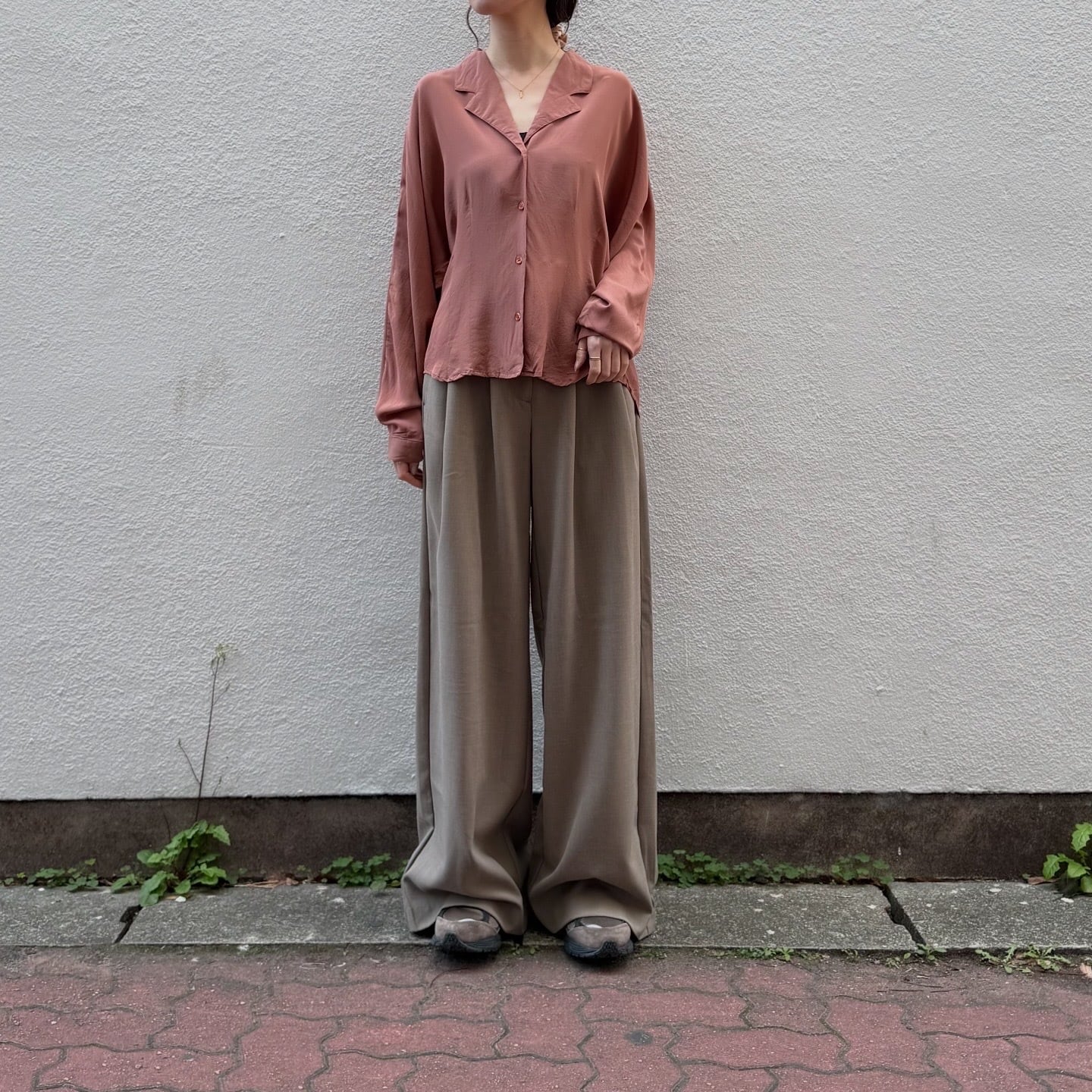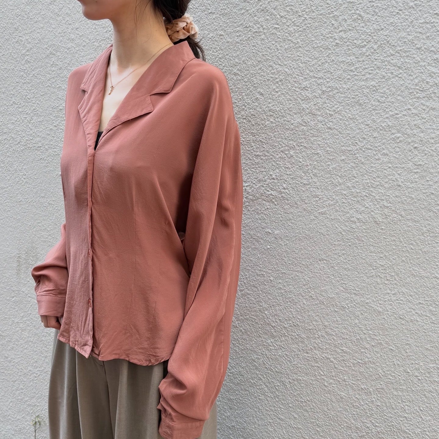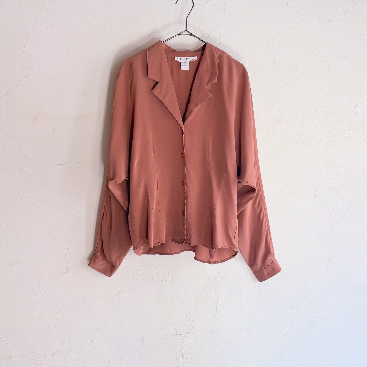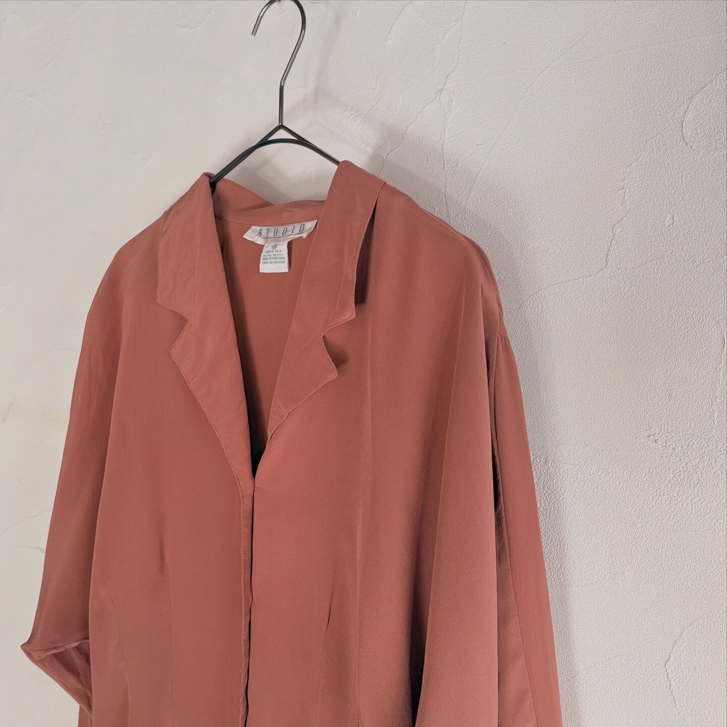 100%シルクで肌触りの良いシャツです。ウエストにダーツ、ドルマンスリーブのディティールが他にはない一着です。