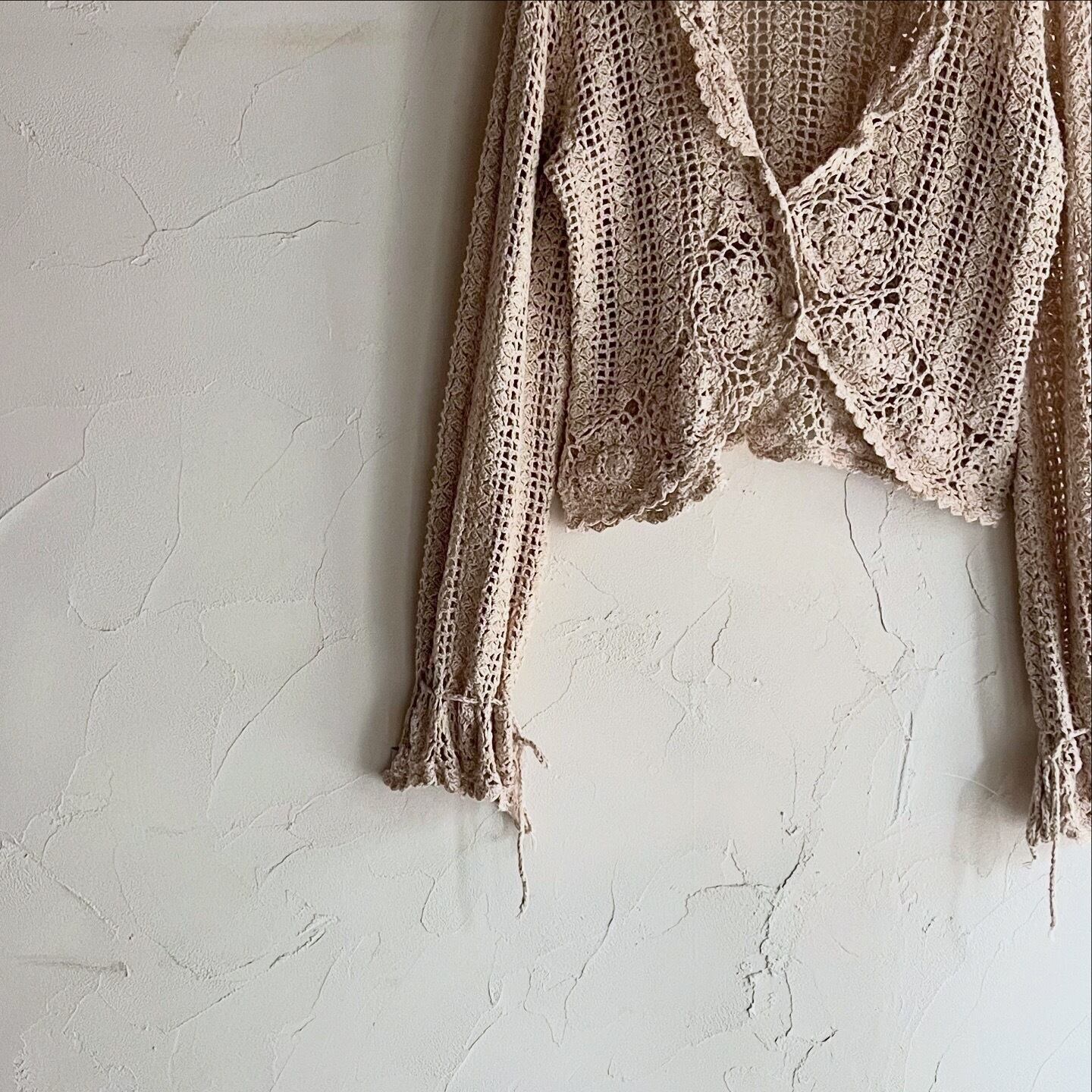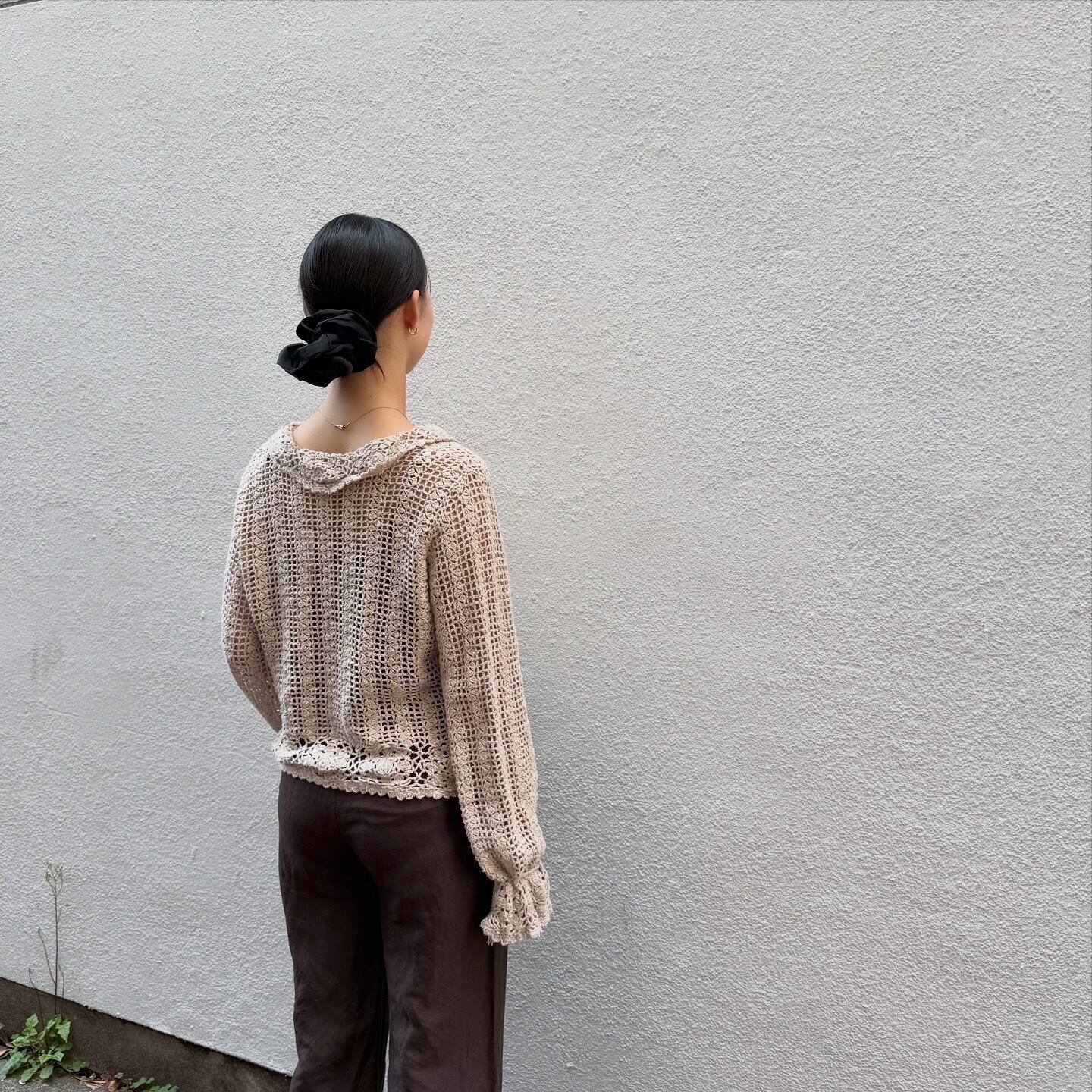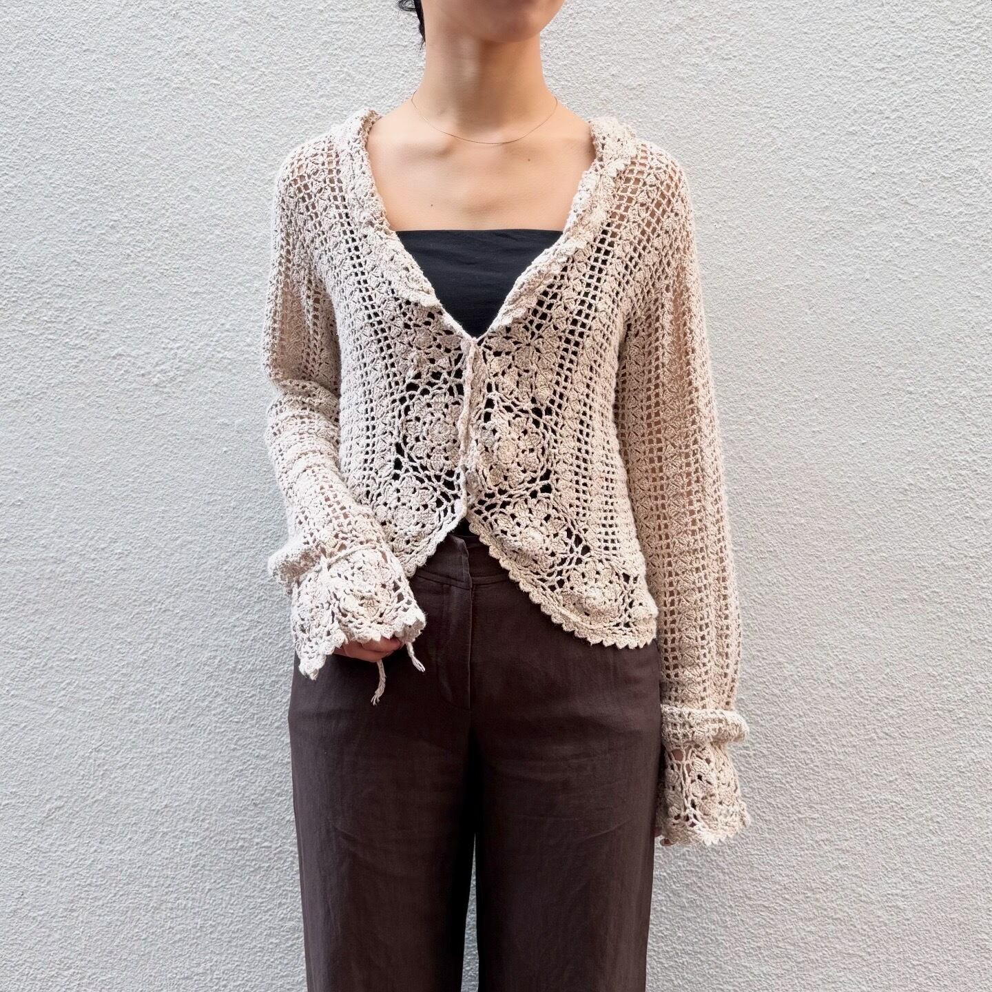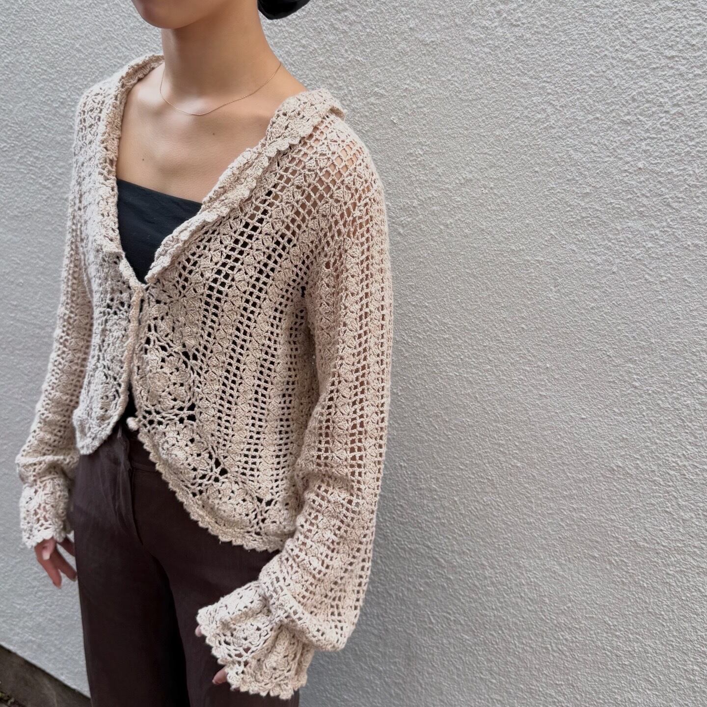 袖にボリュームのあるデザインがフェミニンな印象のクロシェカーディガンです。
