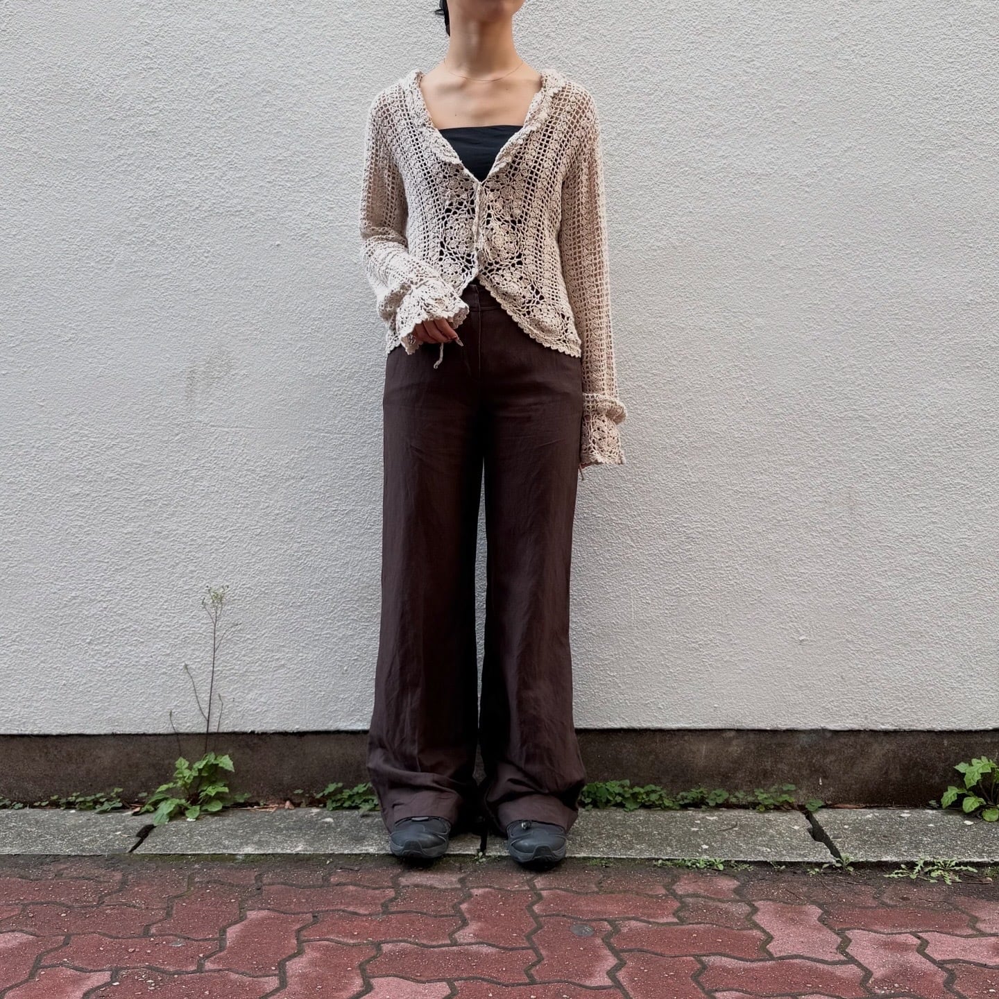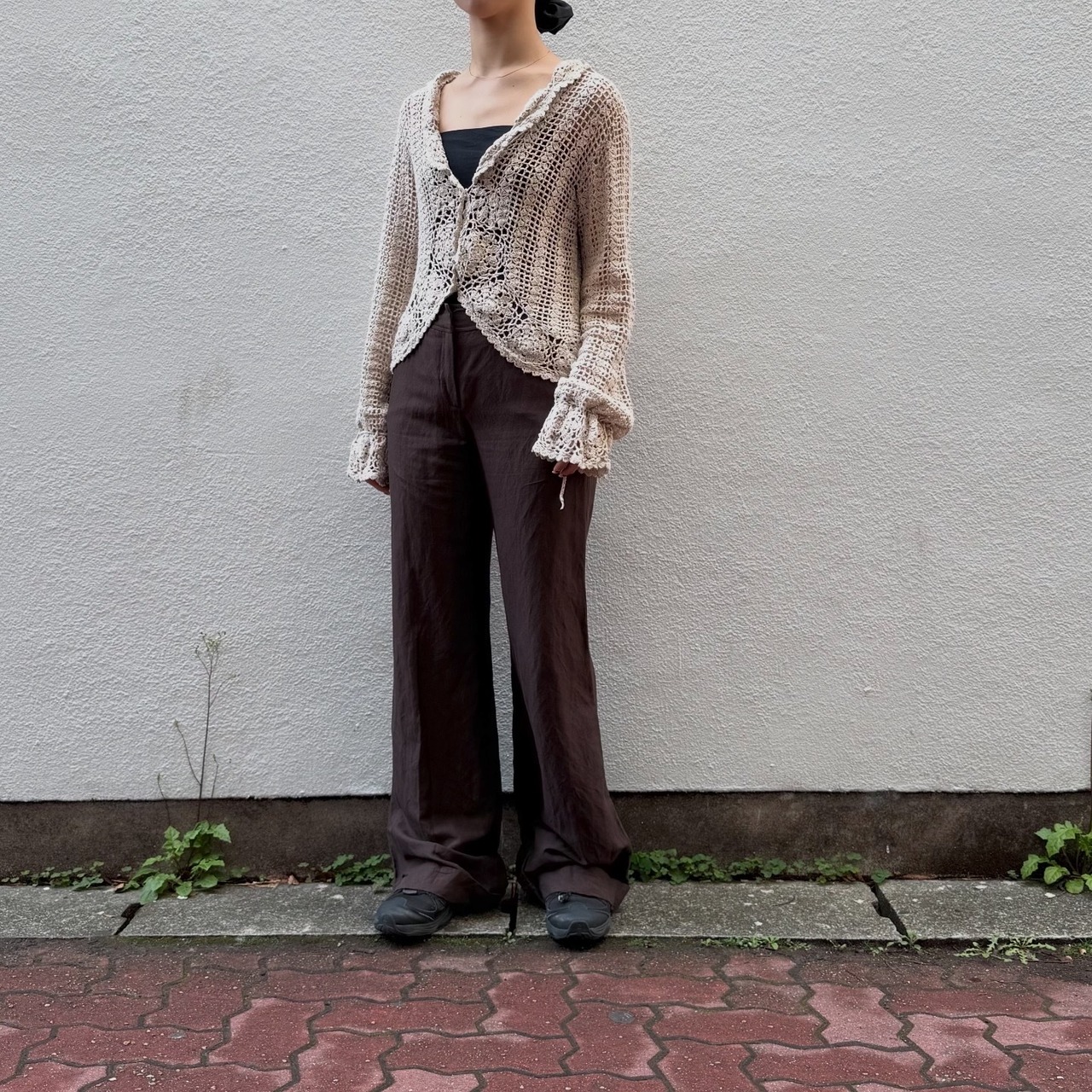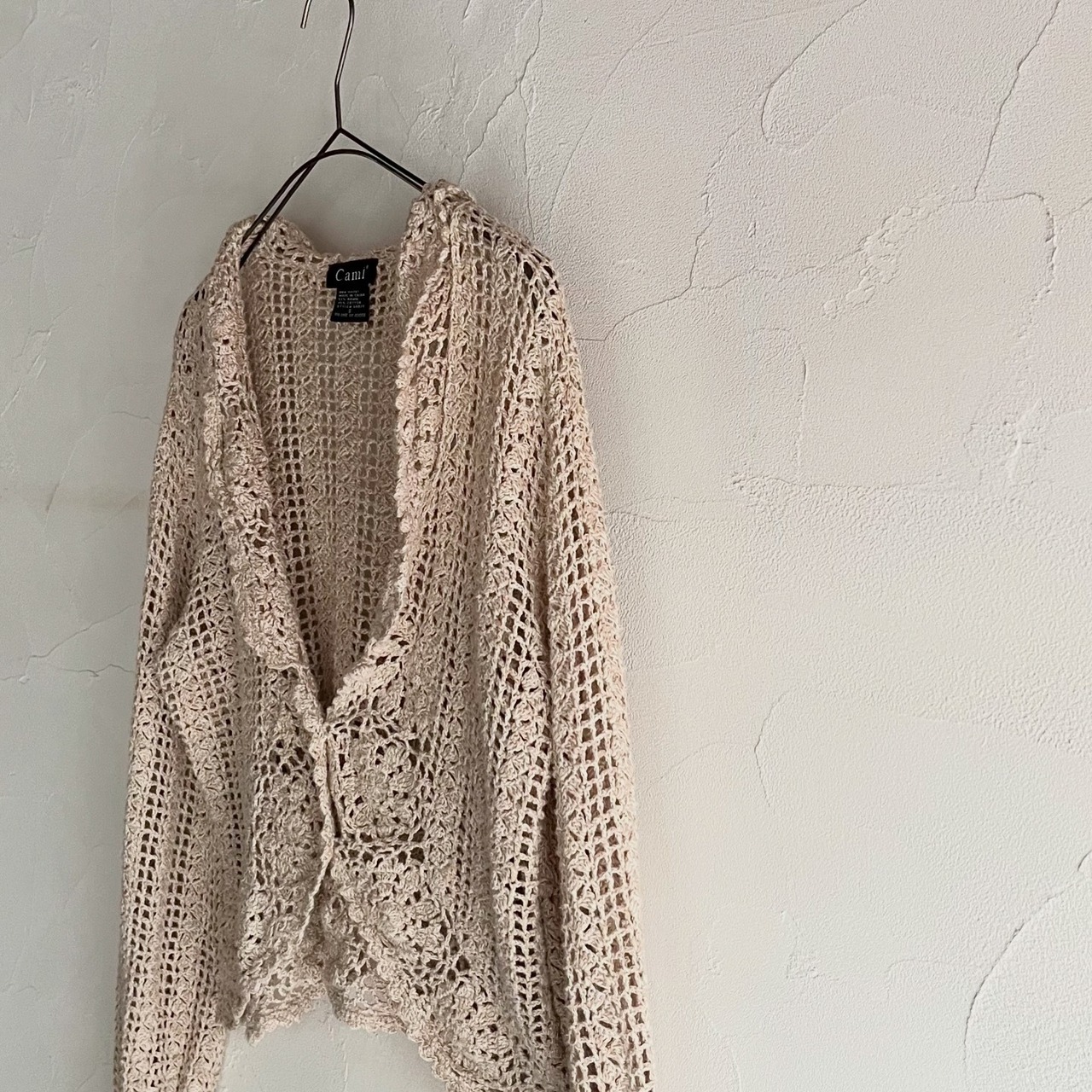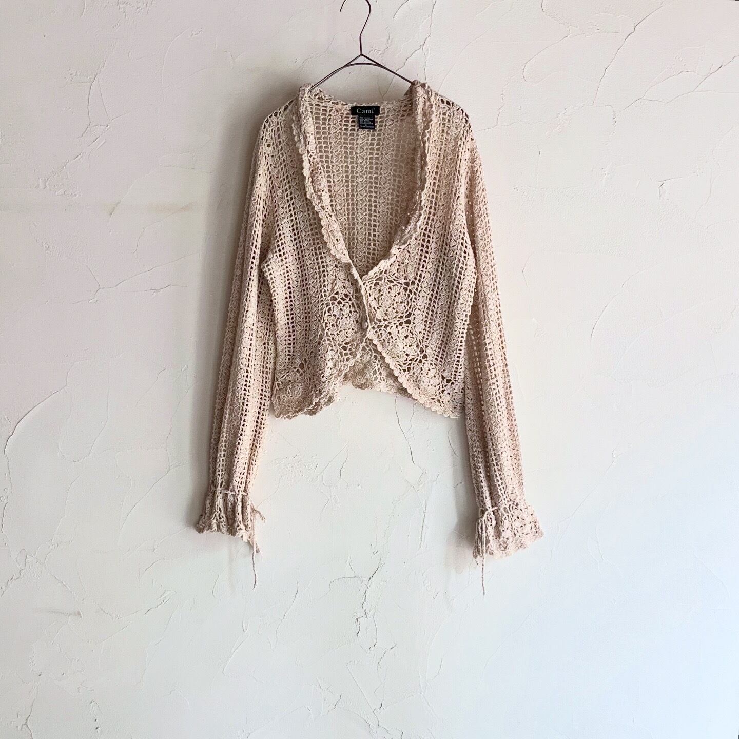 袖にボリュームのあるデザインがフェミニンな印象のクロシェカーディガンです。