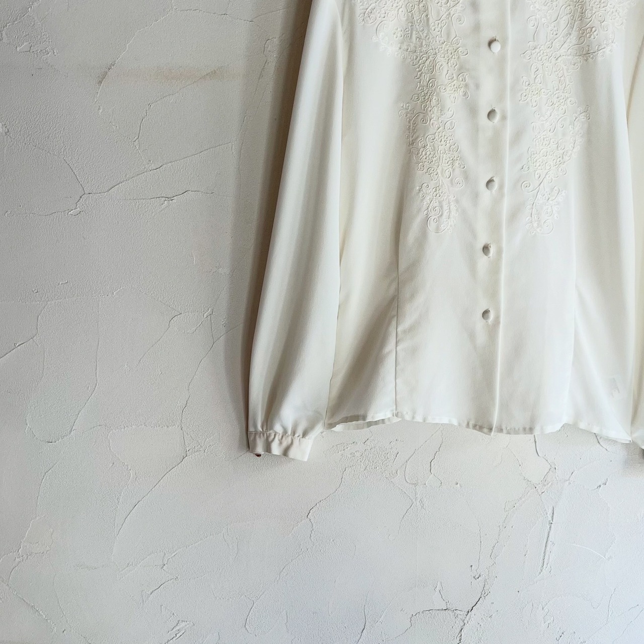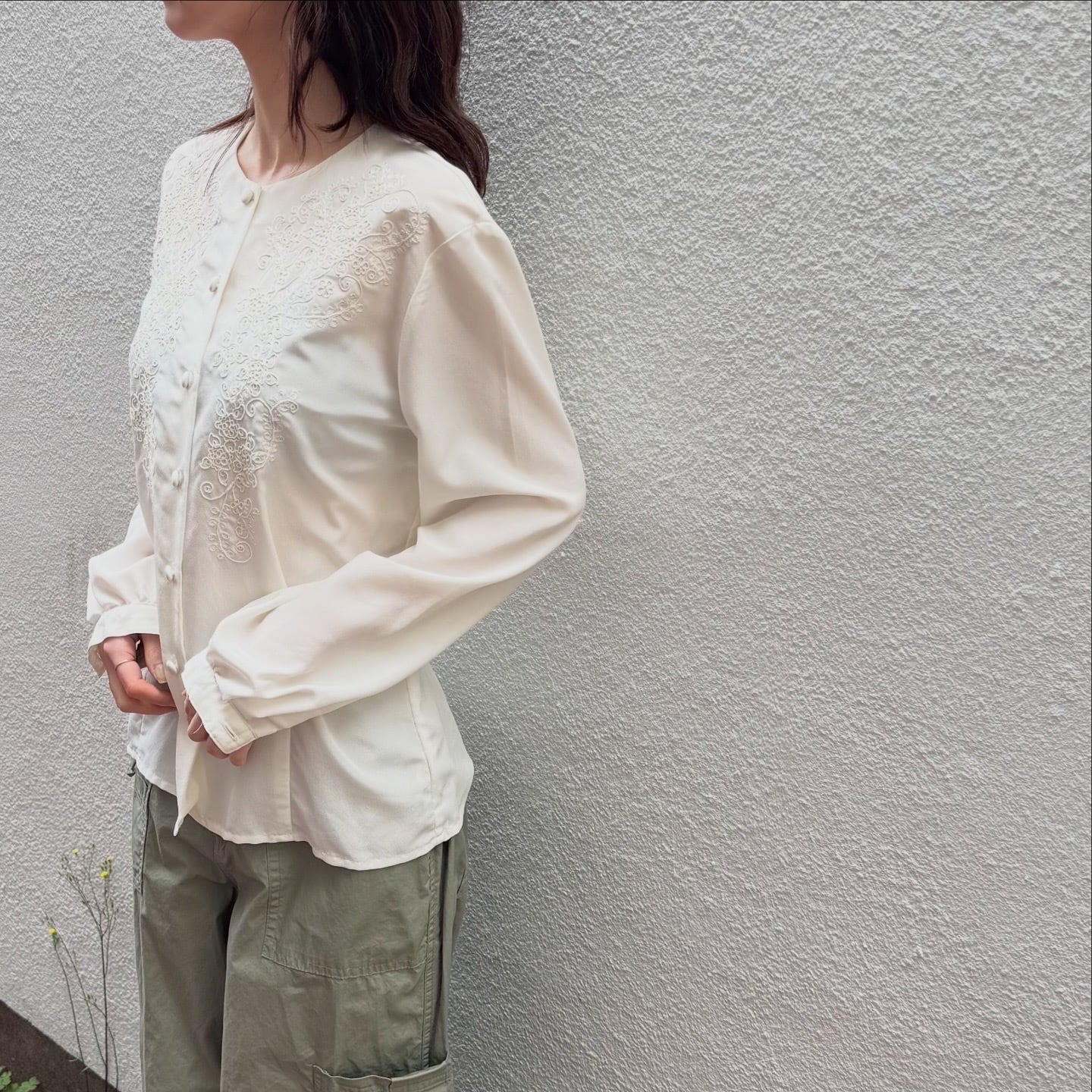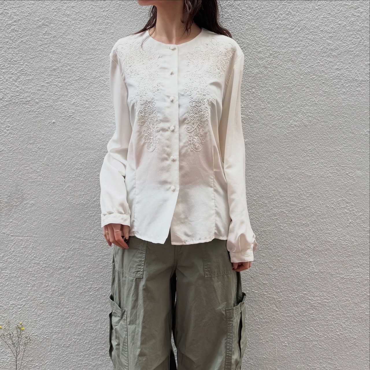 前身頃の繊細なお花の刺繍が素敵なブラウスです。