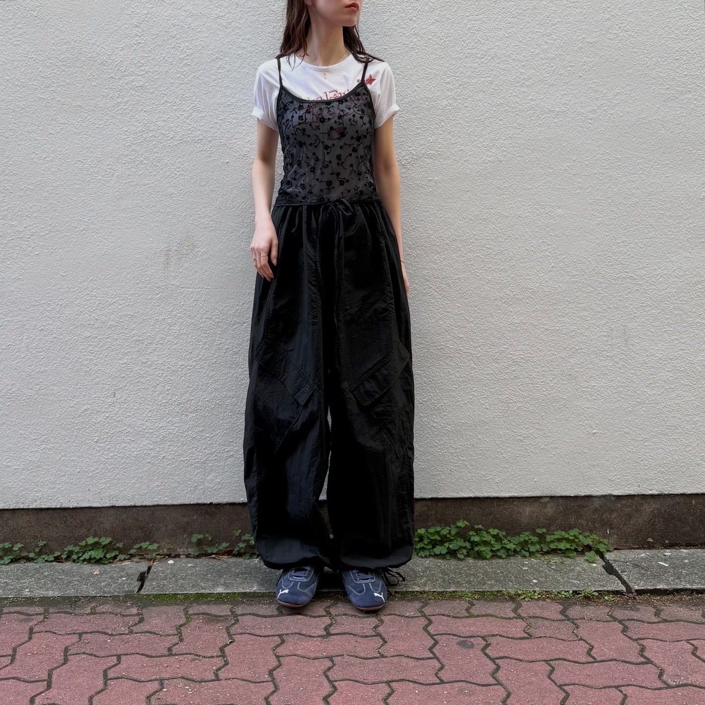 前身頃にベロア素材の花柄とラメが施されたキャミソールです。透け感があり、伸縮性のあるコンパクトなサイズ感です。