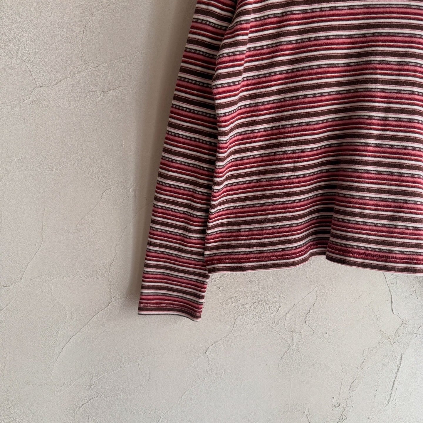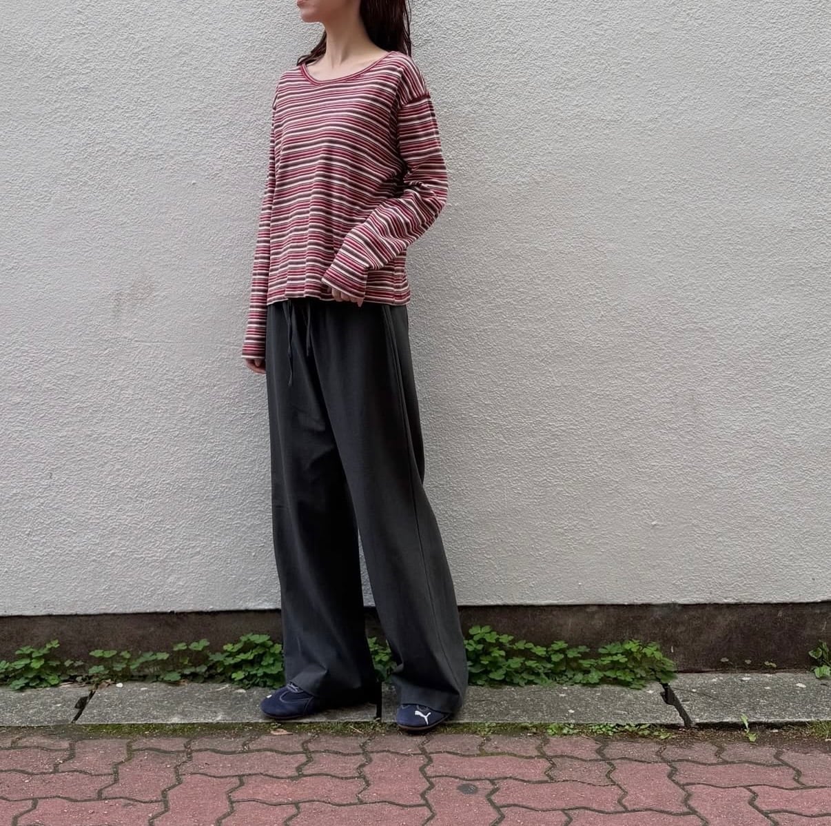 コットン100%のロングTシャツです。太さの違うボーダーが可愛い一着です。