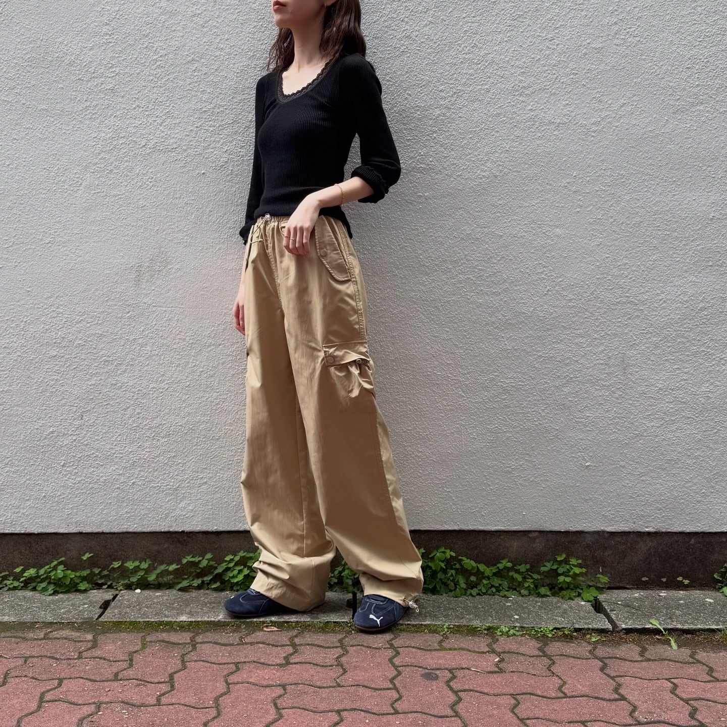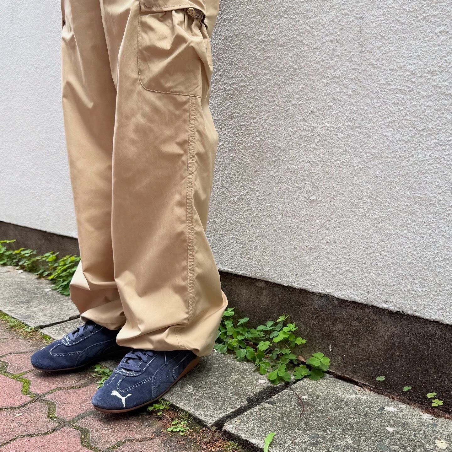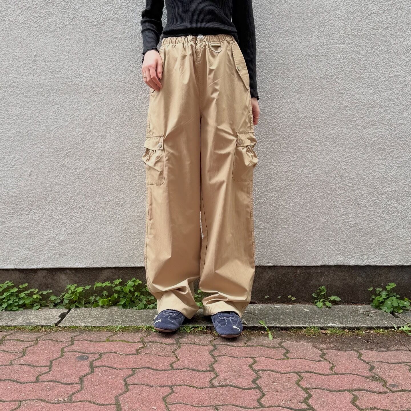 丸みのあるポケットのデザインやイエローの色味が可愛いカーゴパンツです。