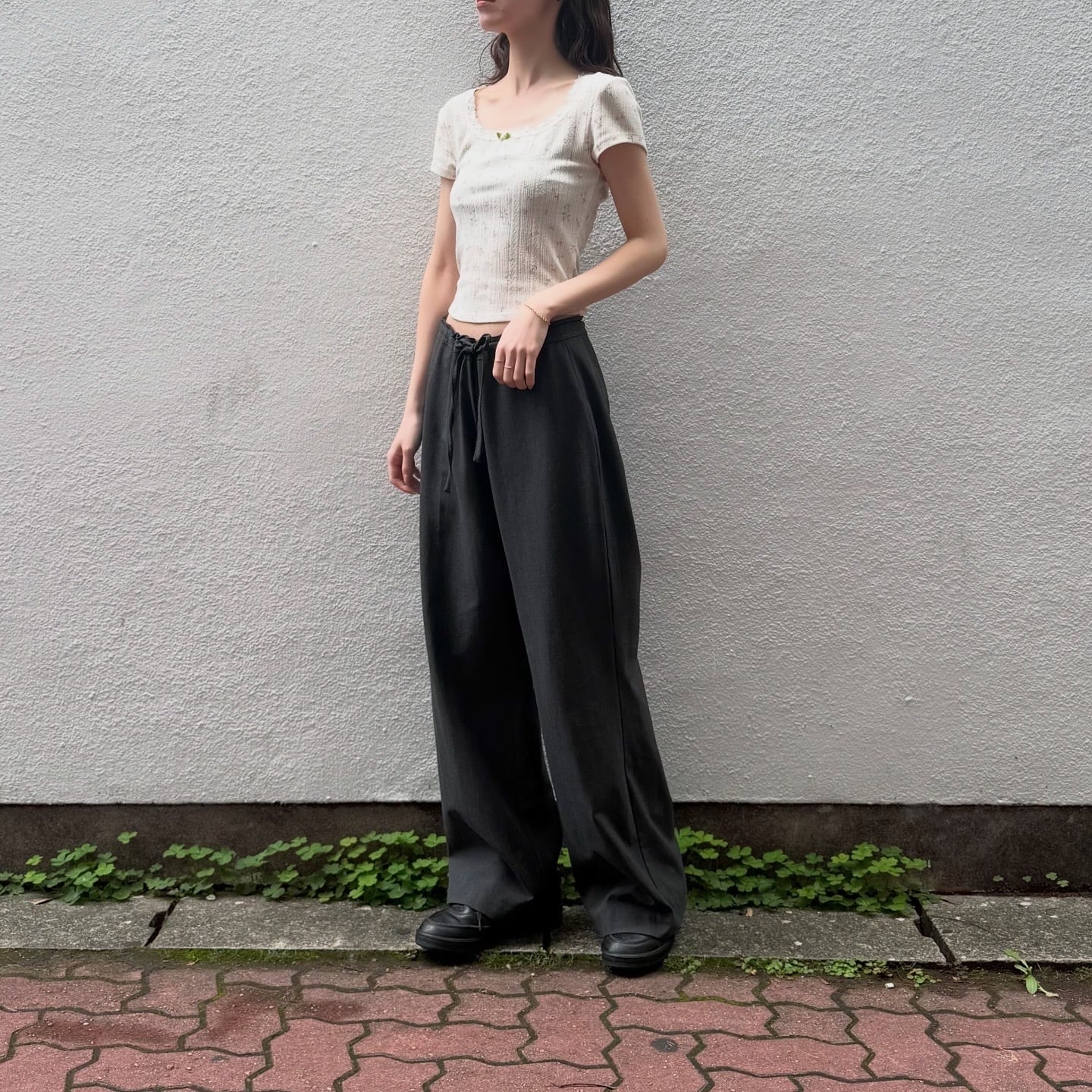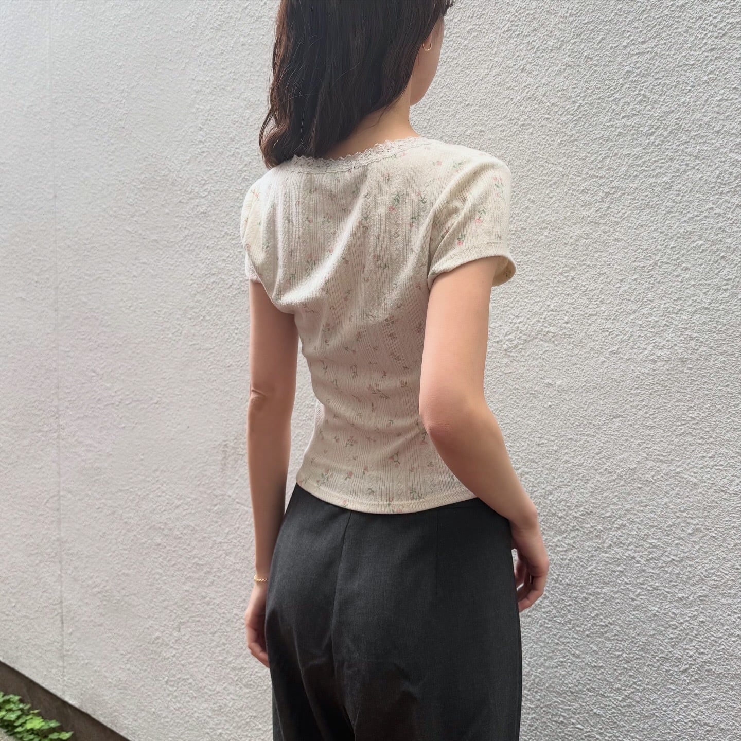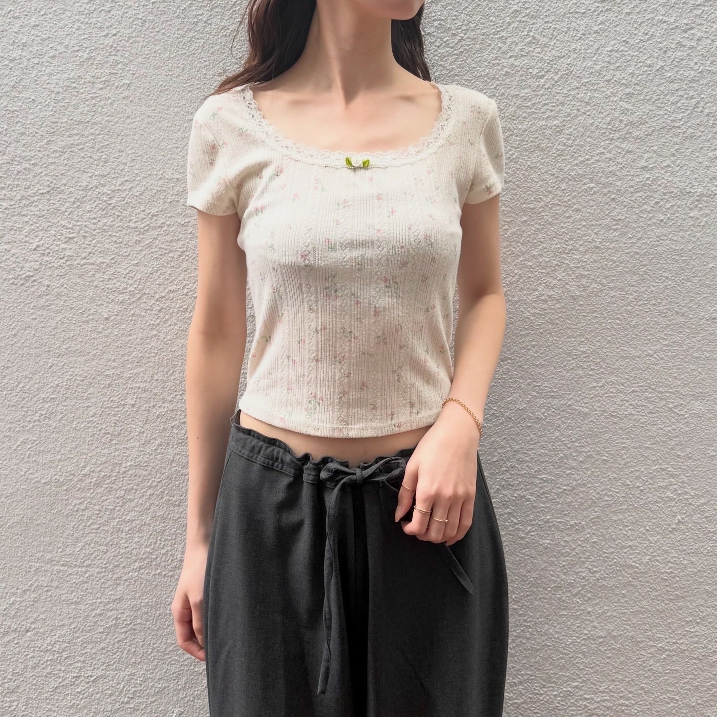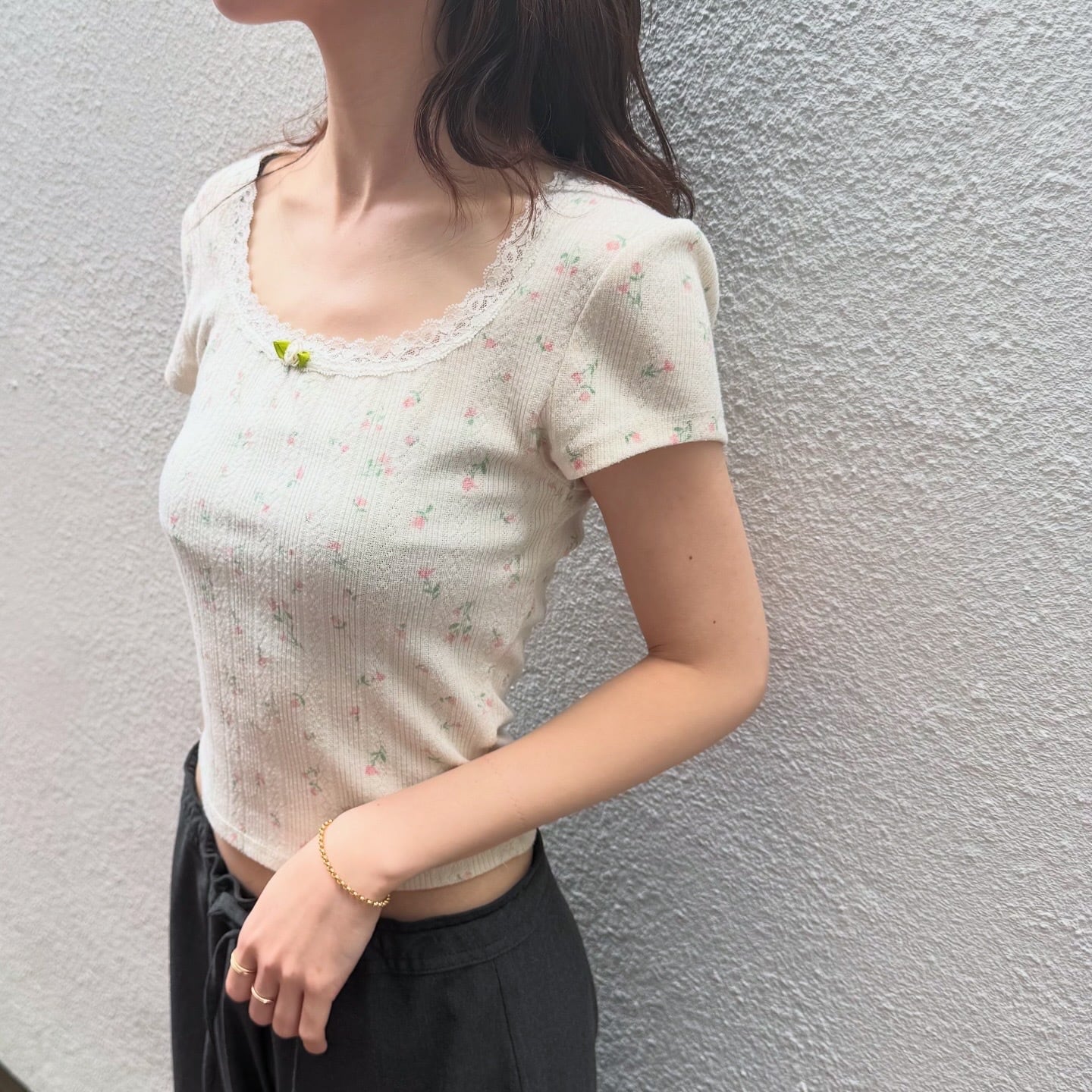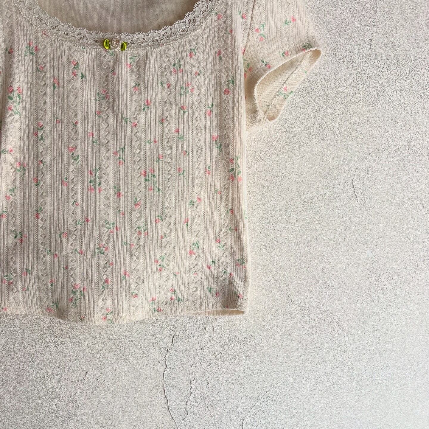 小花柄と首元のレースが可愛いコンパクトなトップスです。やわらかな素材感で着心地も良いです。