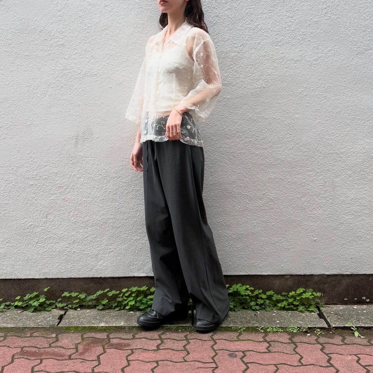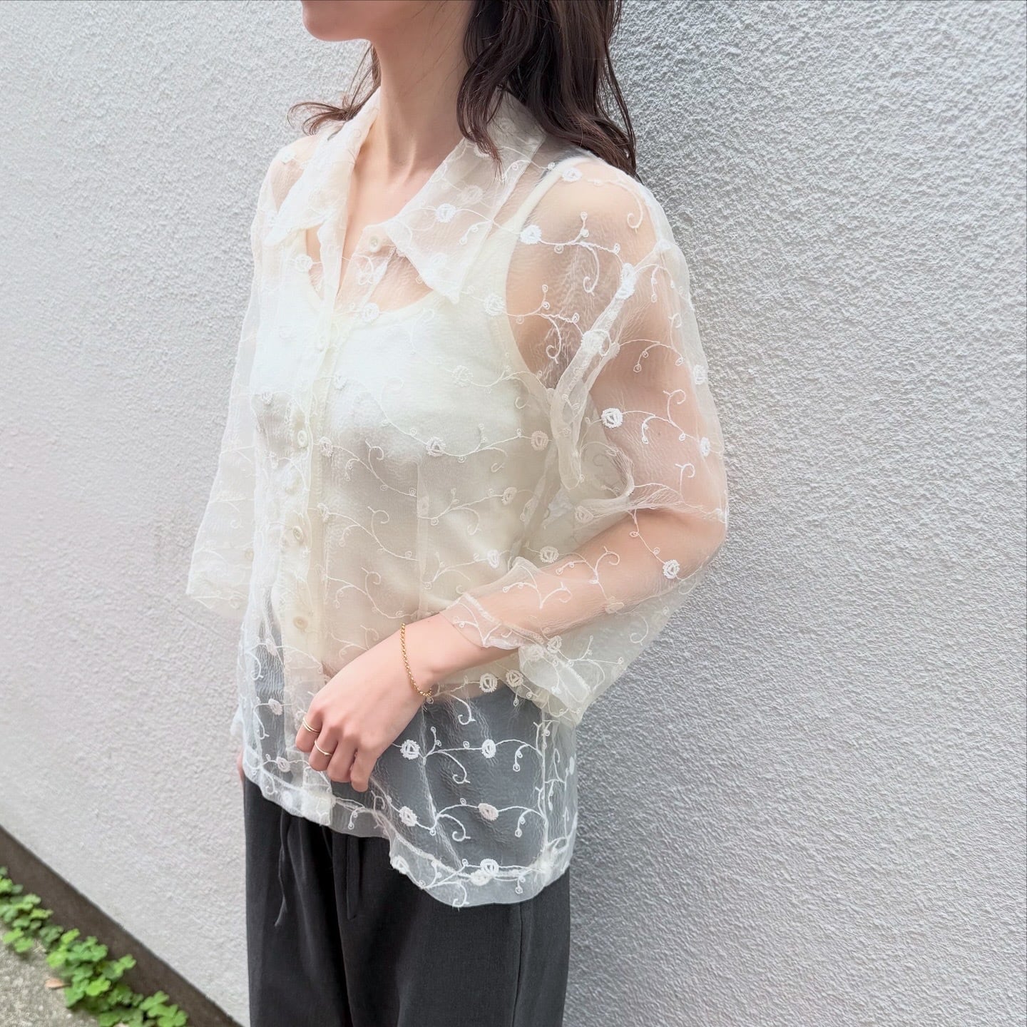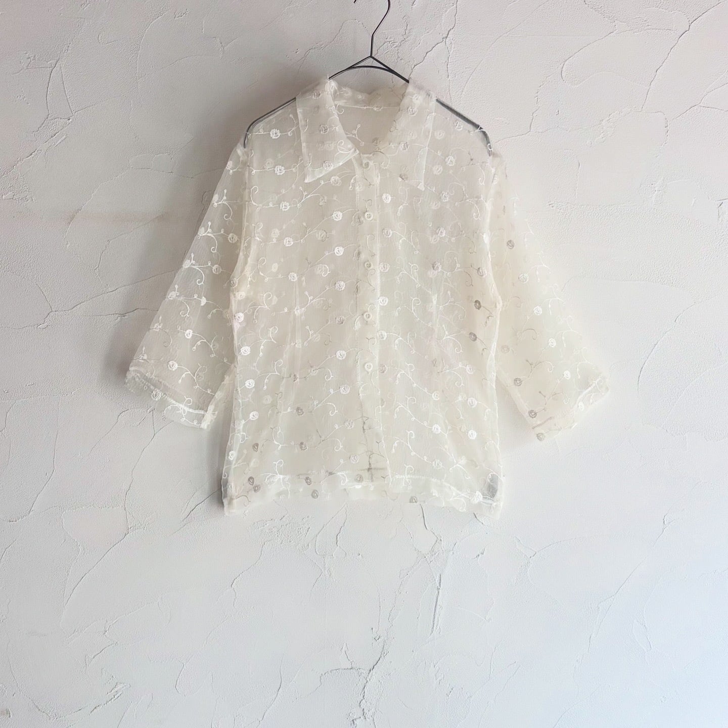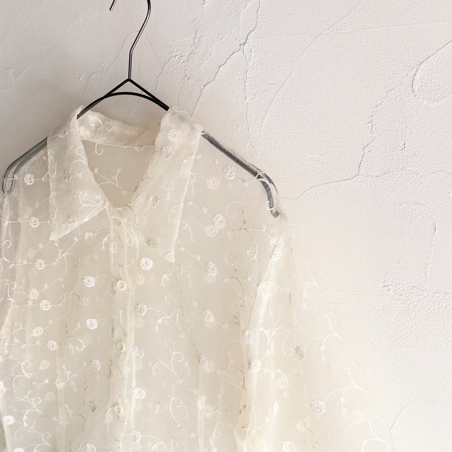 透け感のある生地に刺繍が施された、軽やかな印象のシャツです。春夏の羽織としてもおすすめです。