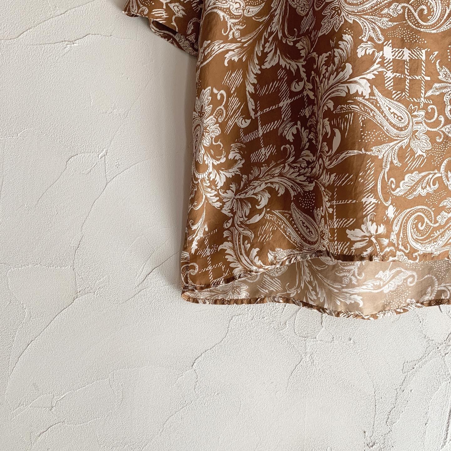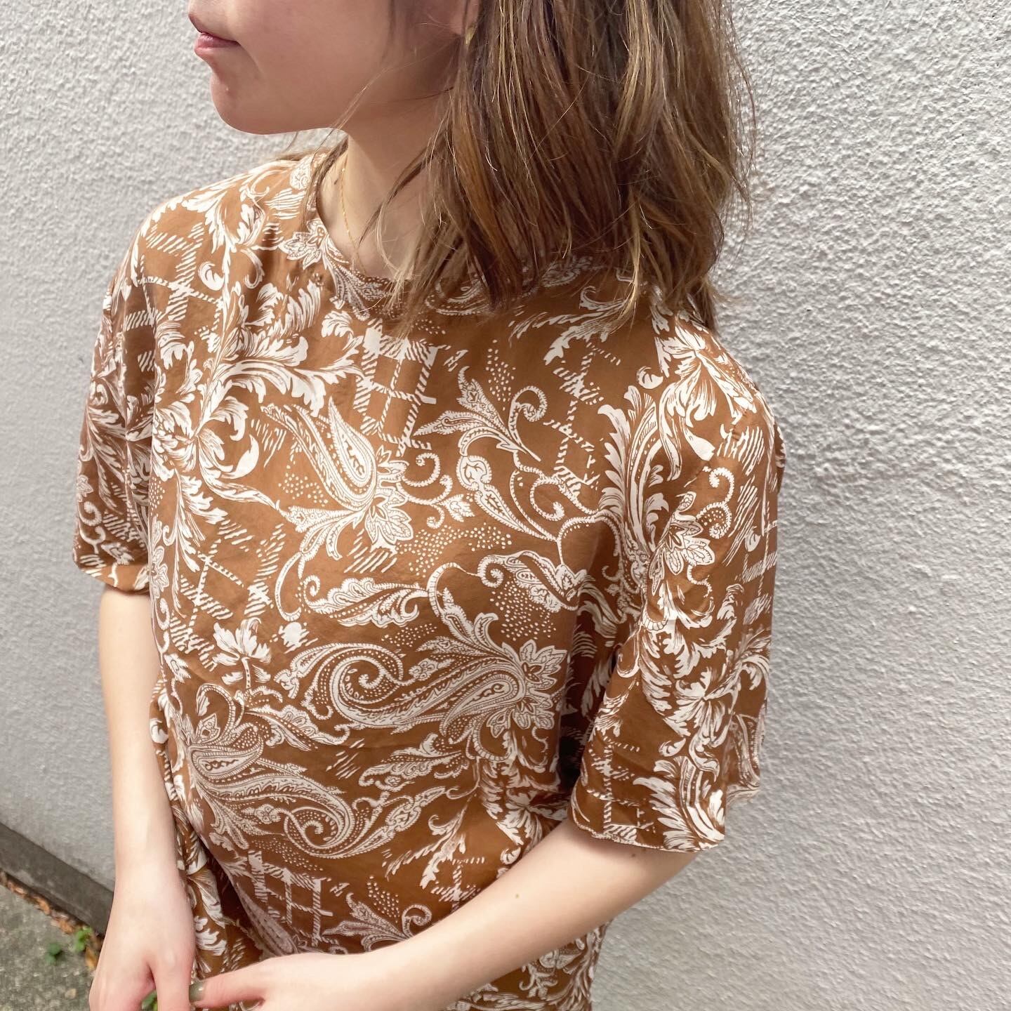 夏らしいプリントが目を惹くトップス。シルクの質感が上品です。