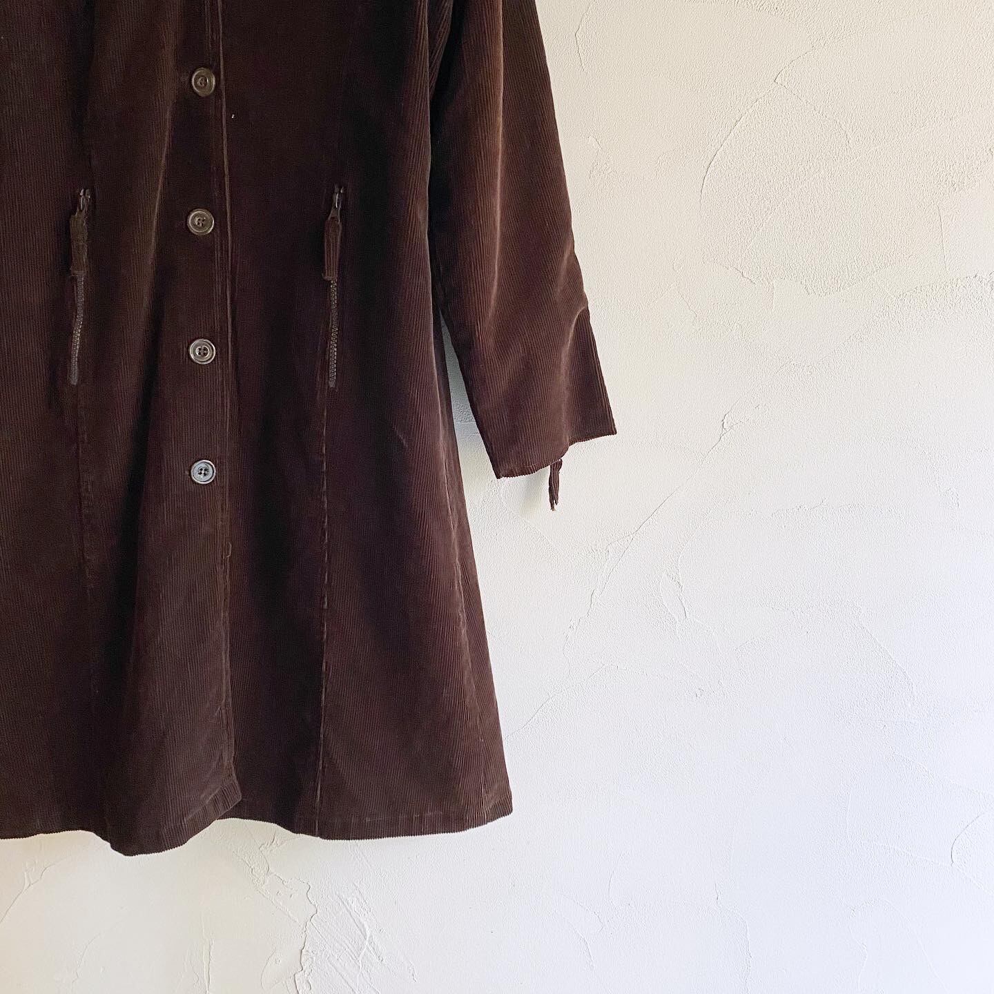 大きめの襟やファスナーのポケットがお洒落で、膝下丈でバランスよく着こなせるコーデュロイコートです。