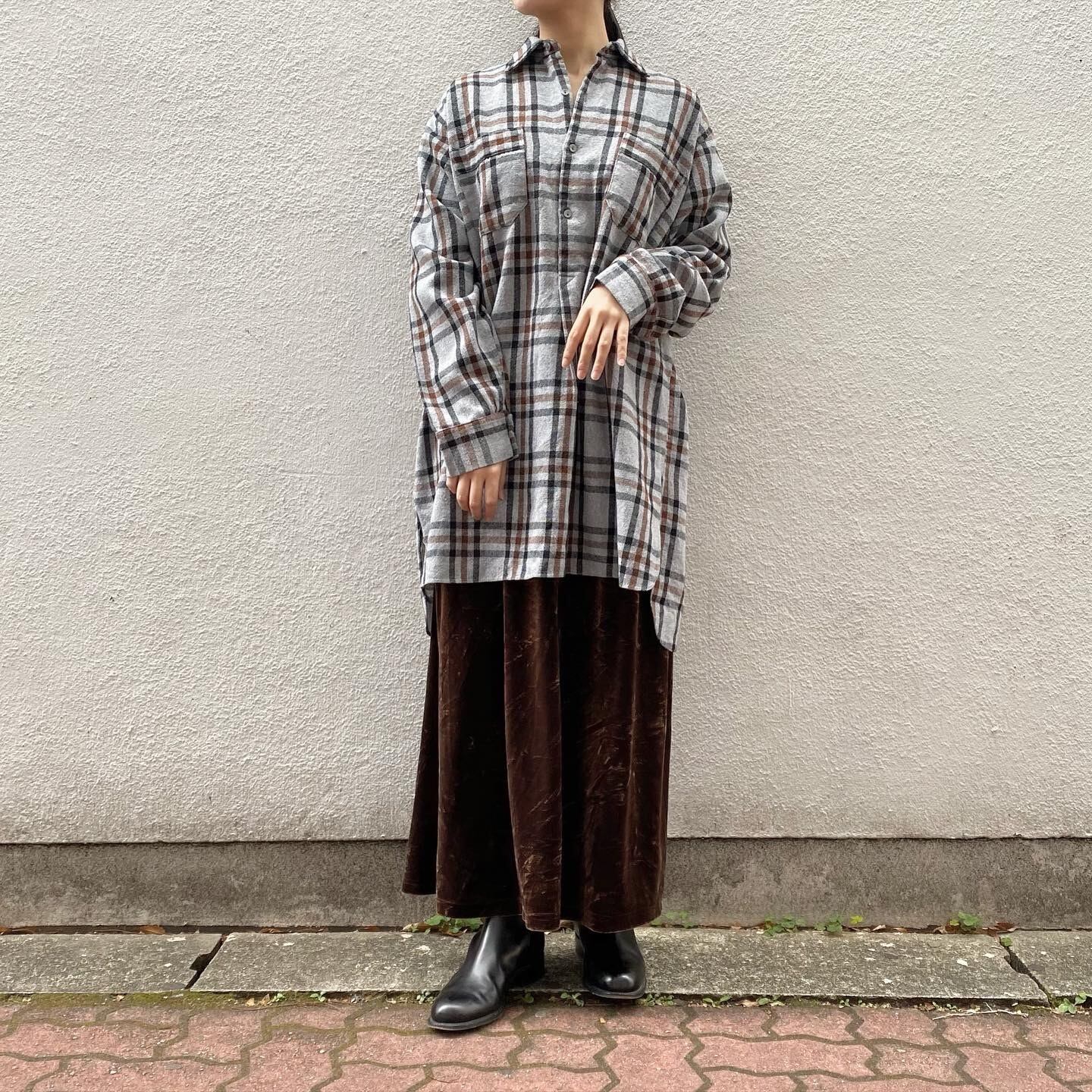 グレーを基調としたチェックが落ち着いた印象で、サラッとした素材感なので、春までお召しいただけるロングシャツです。