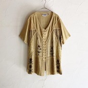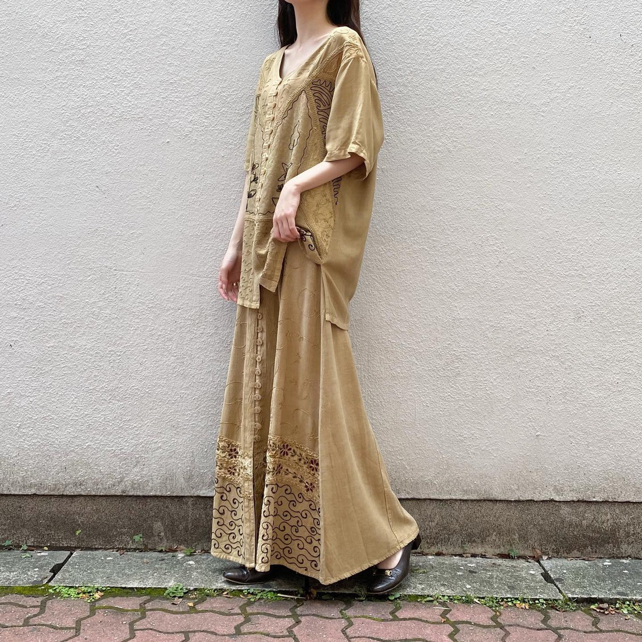 雰囲気たっぷりの刺繍セットアップです。裾の一部分にはベロア生地に繊細な刺繍が施されています。別々でも着用できるため様々な着こなしを楽しんで頂けます。