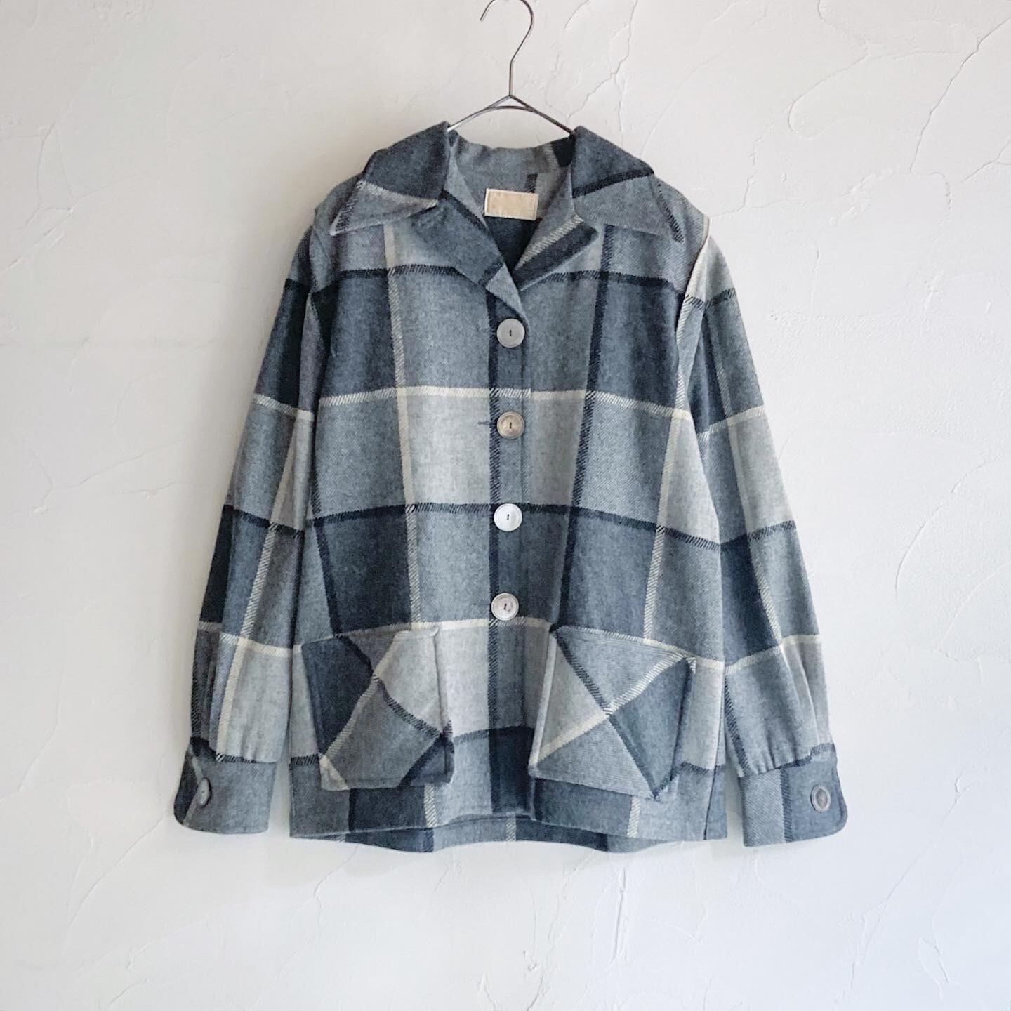 大きめのシェルボタンが可愛いく、落ち着いたお色味で着回しのしやすいチェックジャケットです。