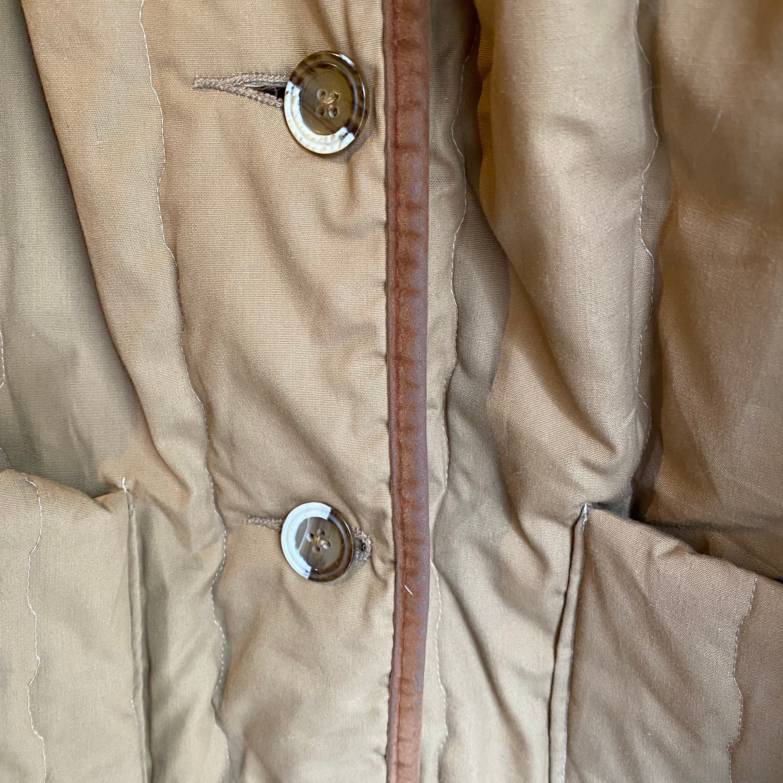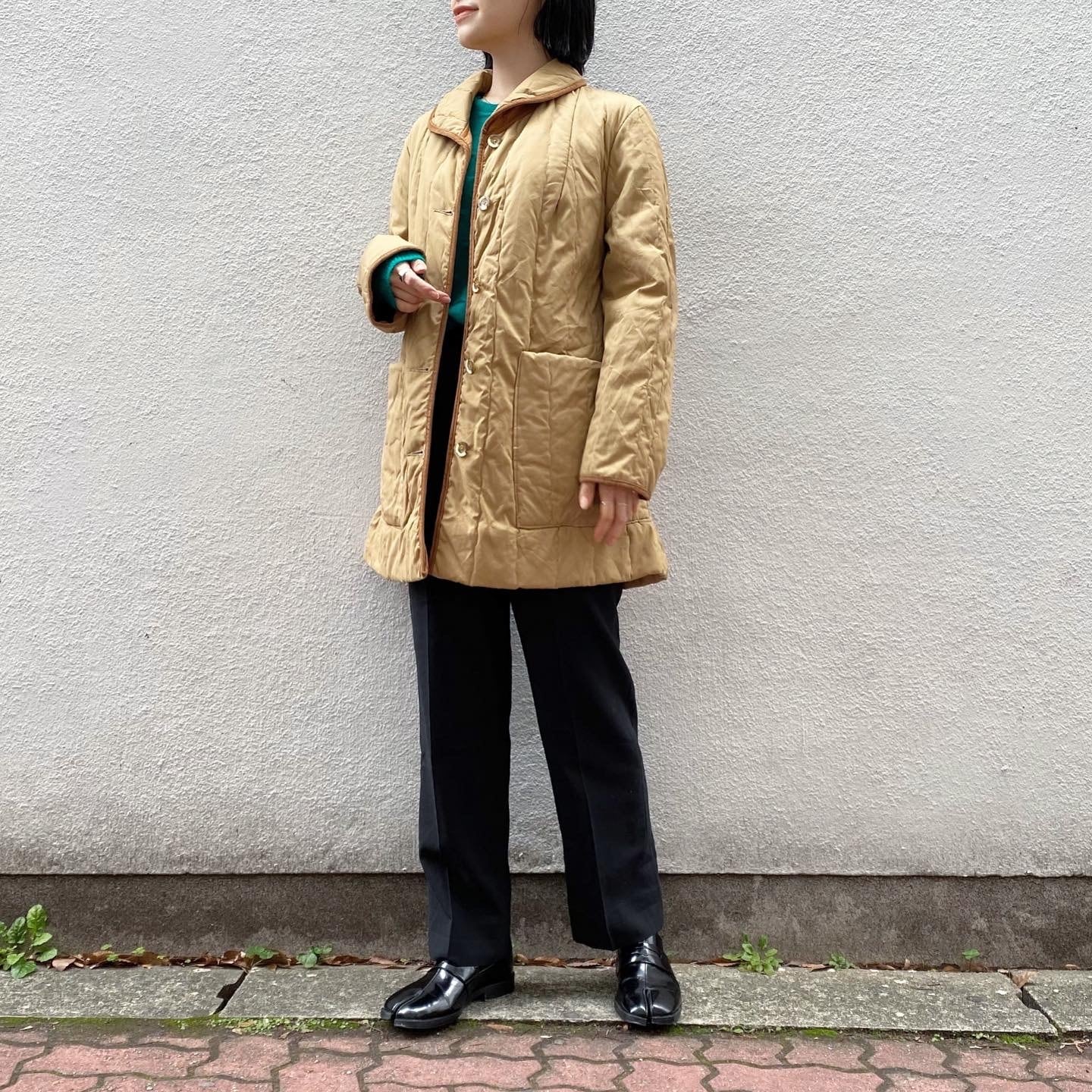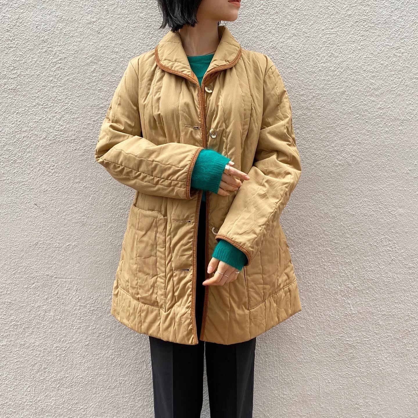 丸襟が可愛らしい印象のキルティングジャケットです。分厚すぎず、薄すぎない生地感で、ベロア地のパイピングがアクセントです。