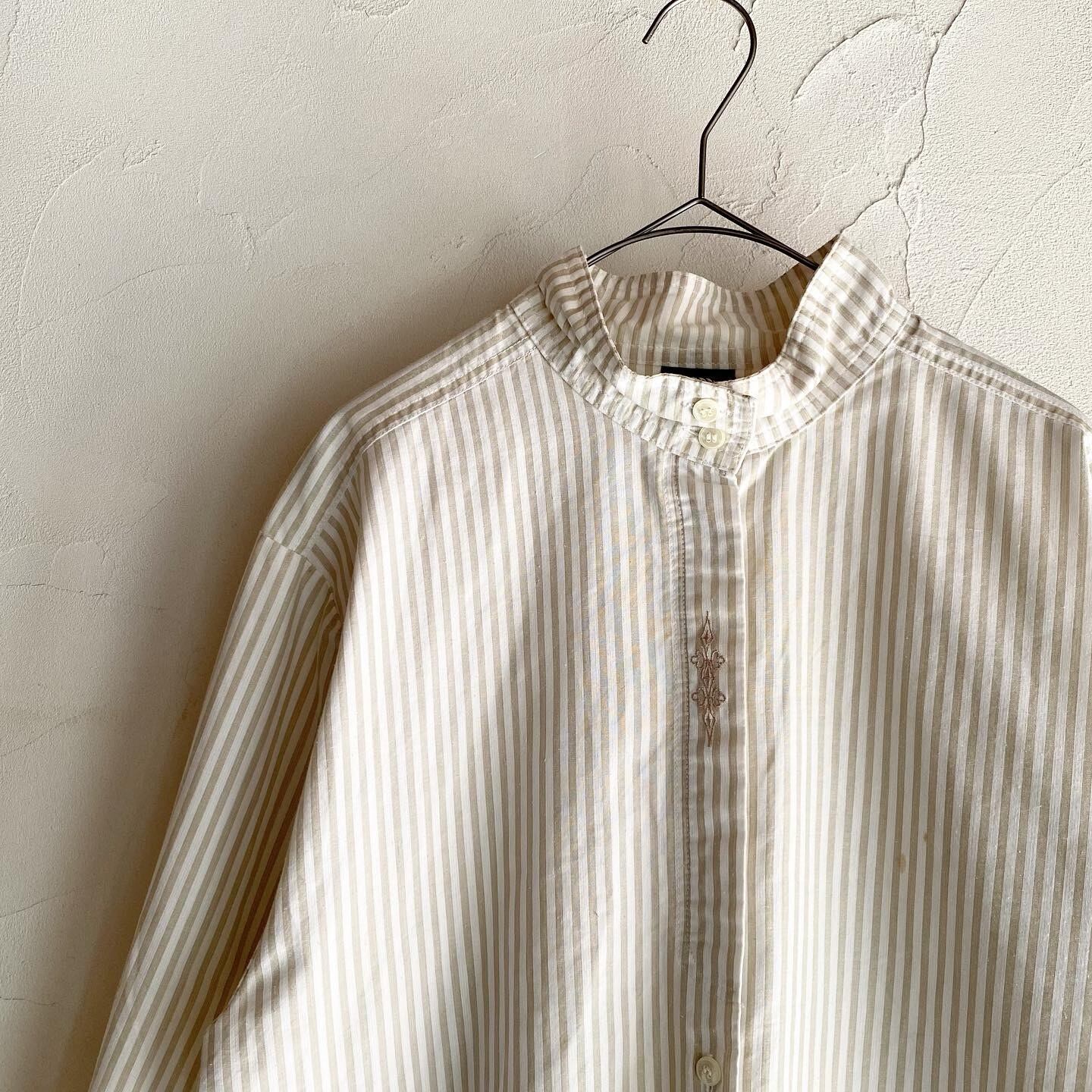 ナチュラルなスタンドネックとフロントの刺繍が可愛らしいストライプシャツです。ベージュとアイボリーのカラーリングも素敵です。