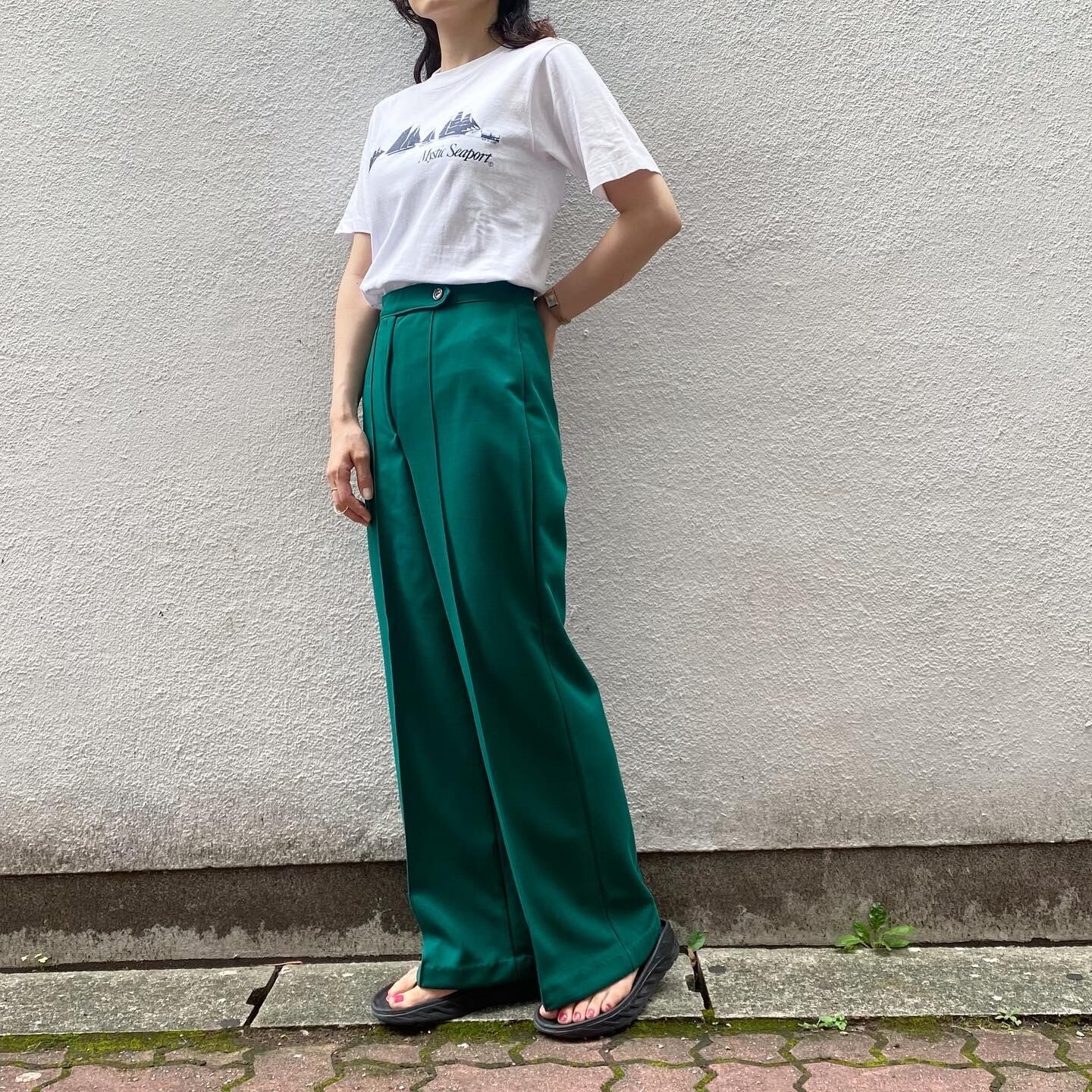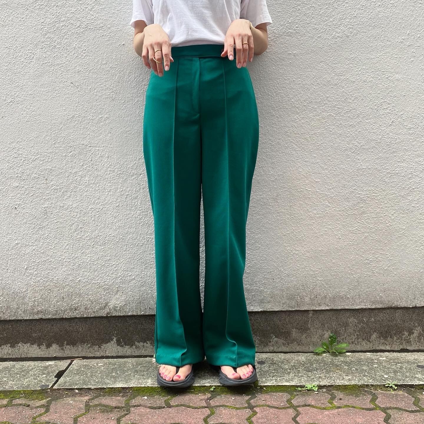 パキッとしたグリーンカラーが目を惹くセンタープレスパンツです。シワになりにくくセンタープレスがしっかり入っているため綺麗なシルエットが魅力の1着です。