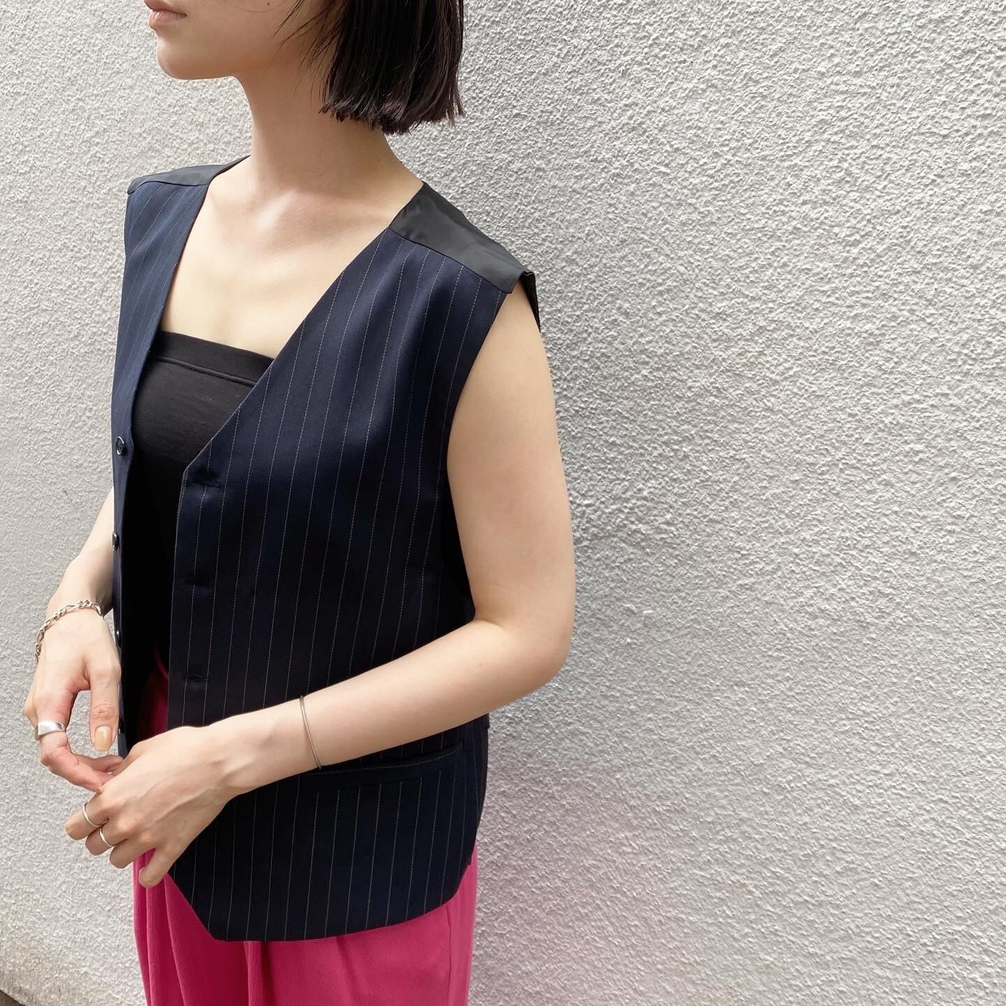 バックが薄手の生地のストライプベストです。ウエストの調節コードが付いている為、シルエットを変えることができます。