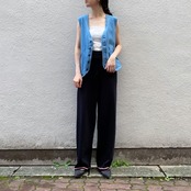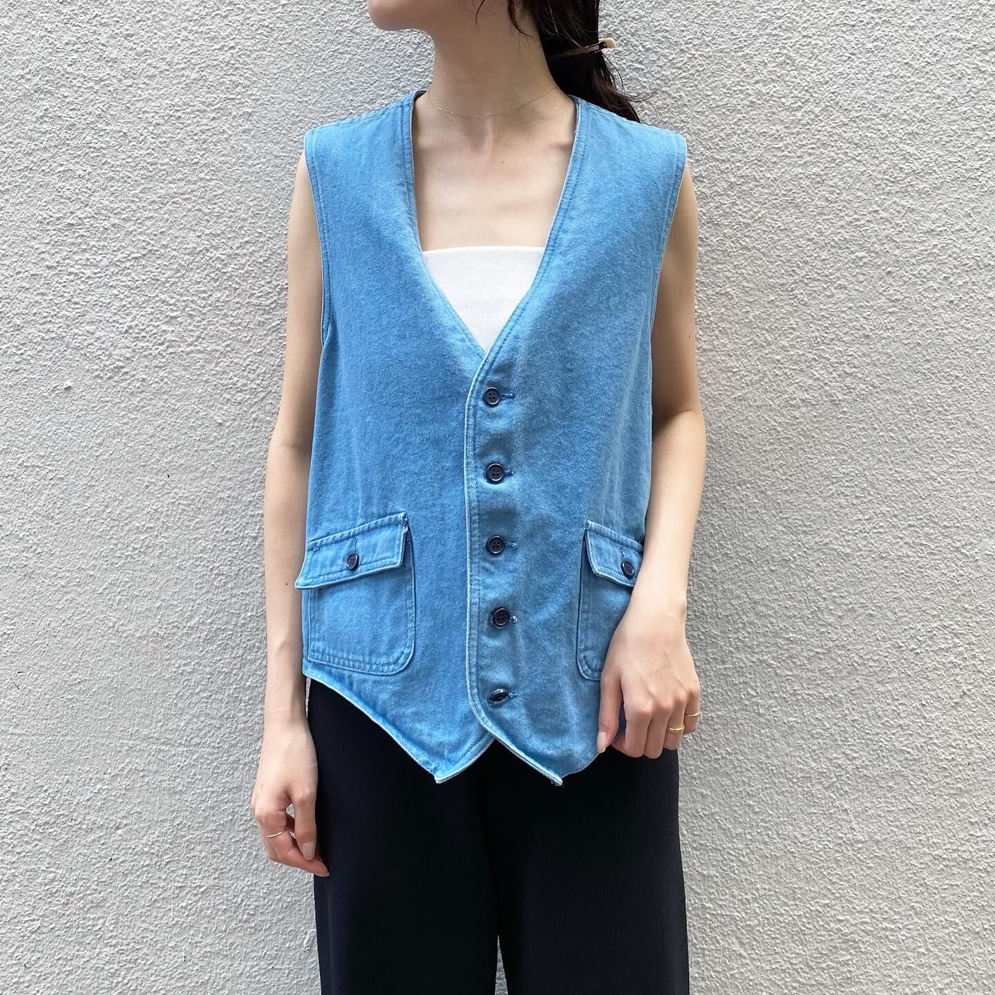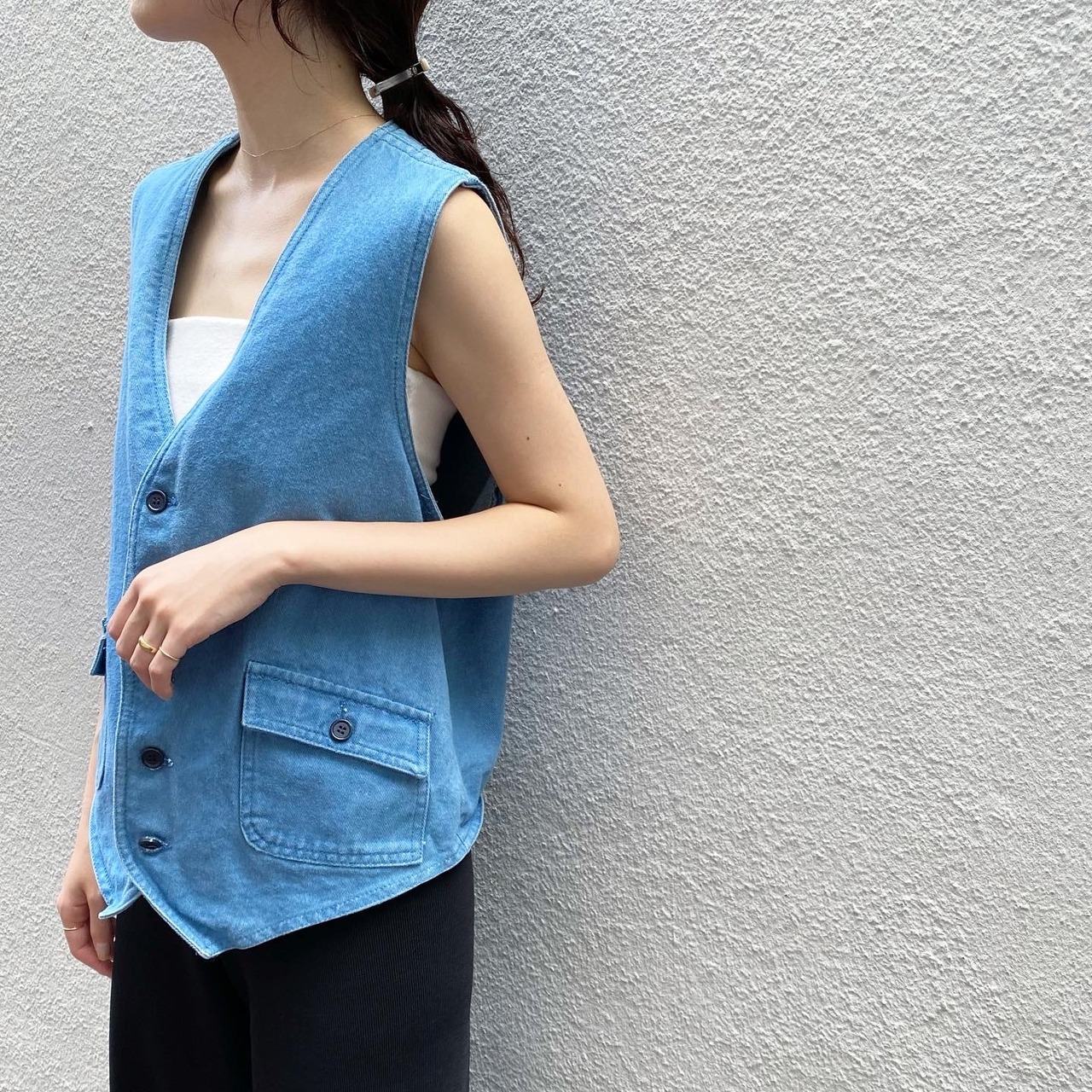裾のカッティングやフロントのポケットなどにデザイン性のあるデニムベストです。インナー次第で様々な着こなしをお楽しみ頂けます。