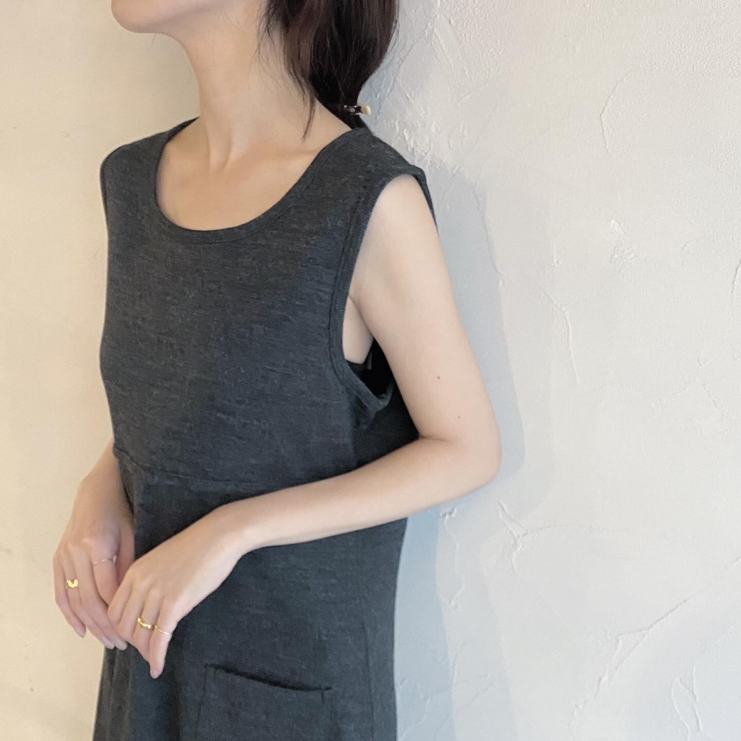 シンプルで使い勝手の良いワンピースです。ノースリーブのためさまざまな着こなしを楽しんで頂けます。切り返し位置が高くスタイルアップして見える1着です。