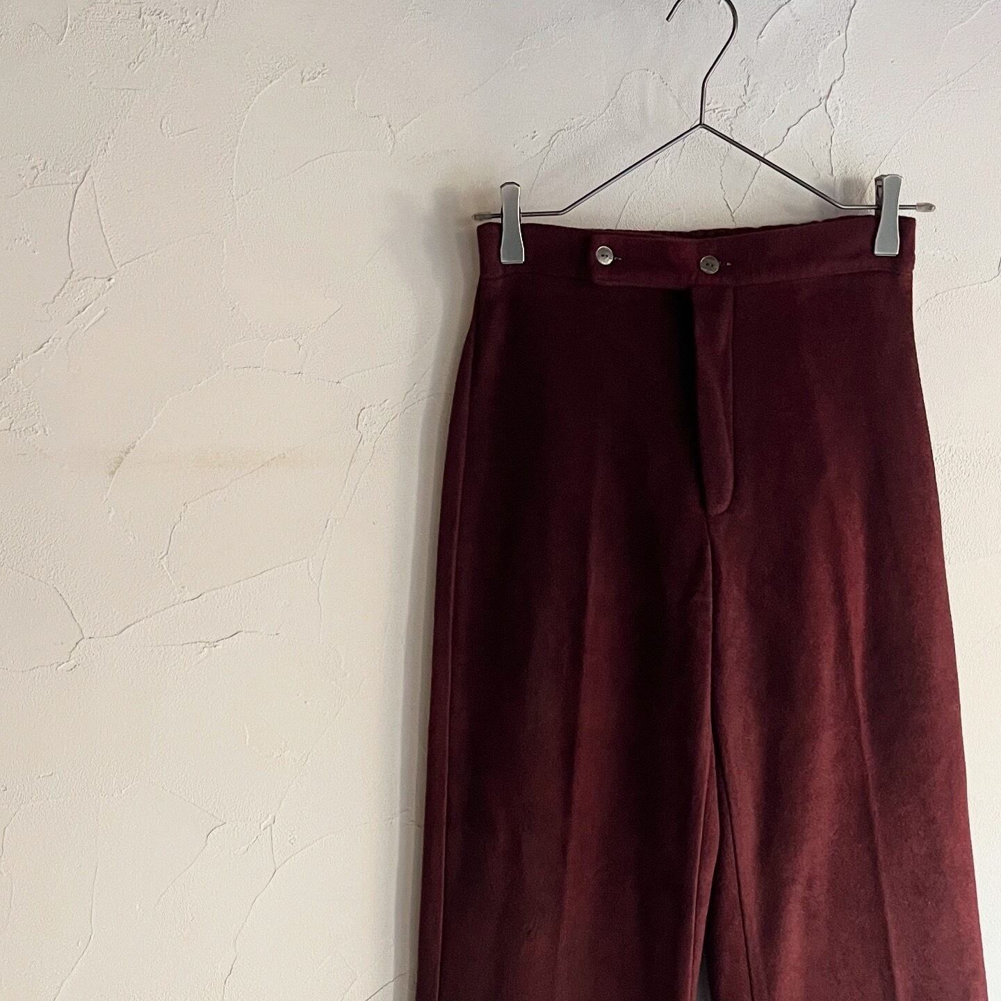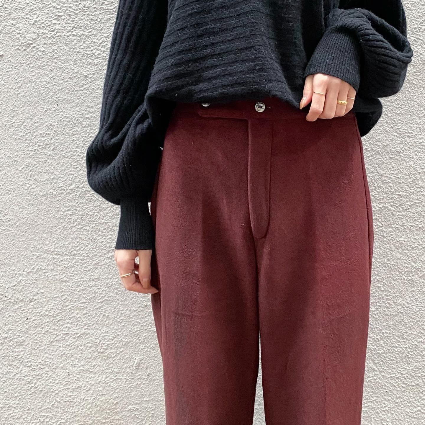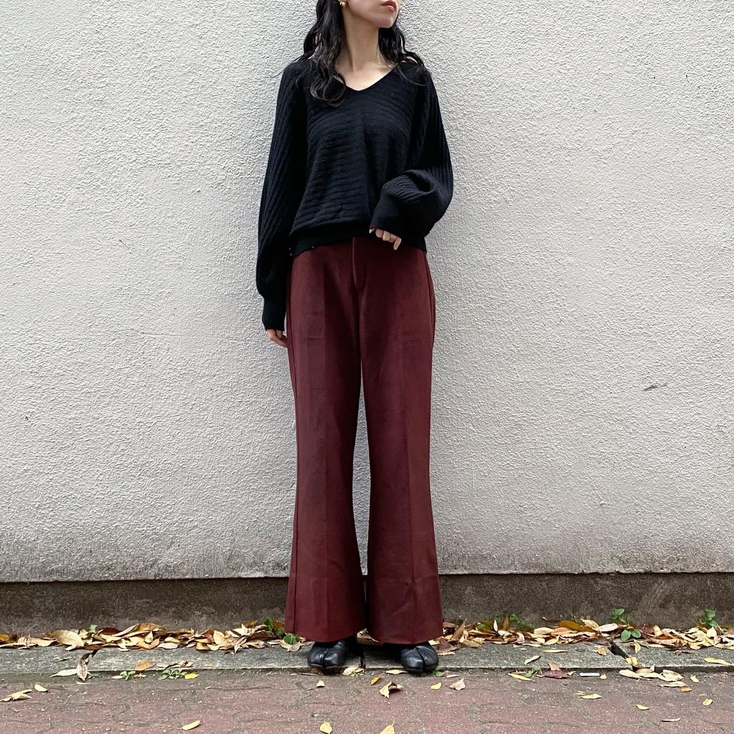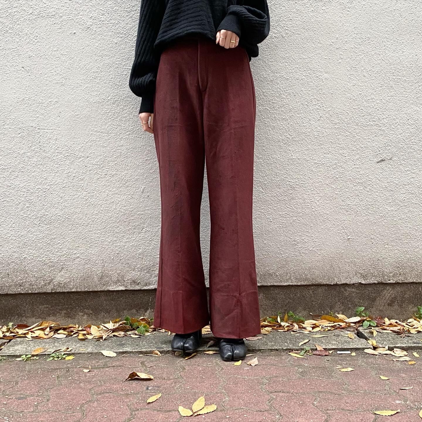 フリースのような暖かみのある素材感のフレアパンツです。ウエストの後ろ半分がゴム仕様になっています。