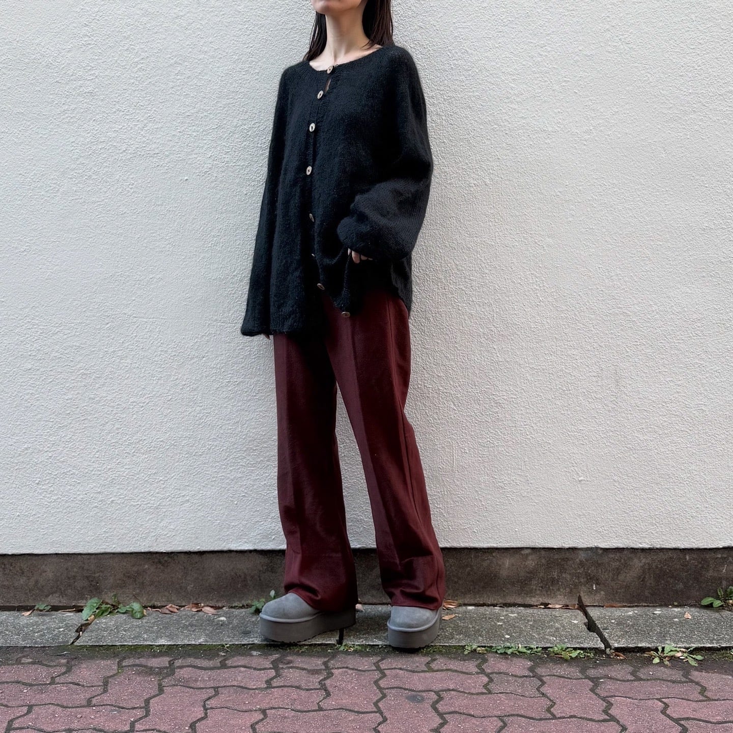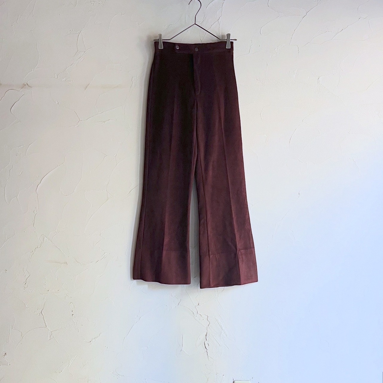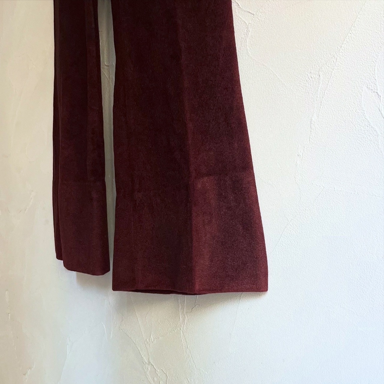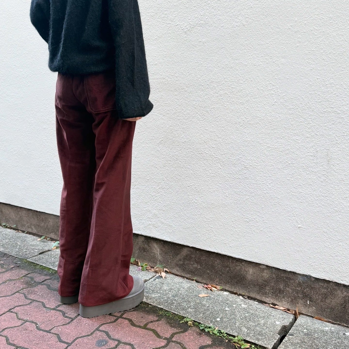 フリースのような暖かみのある素材感のフレアパンツです。ウエストの後ろ半分がゴム仕様になっています。